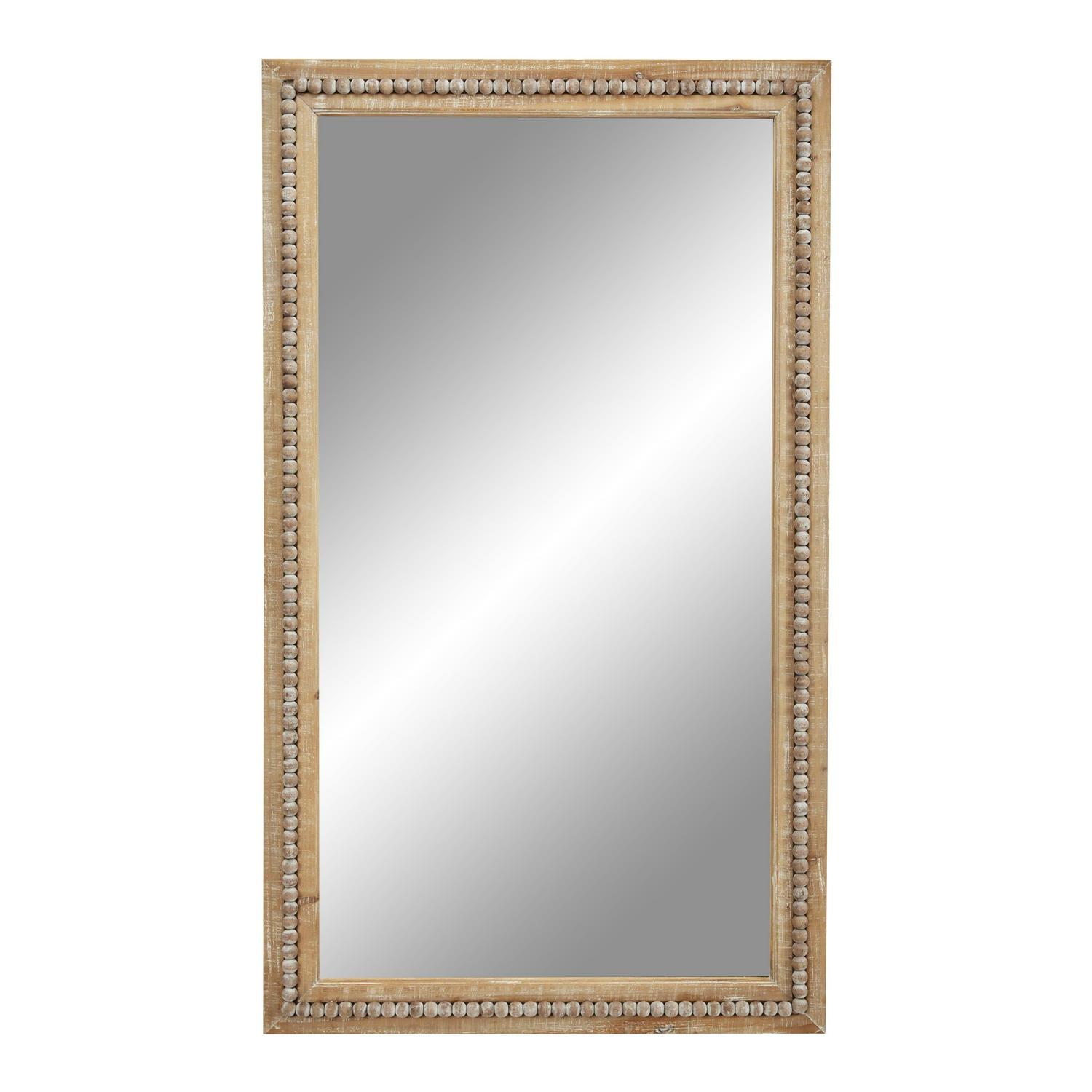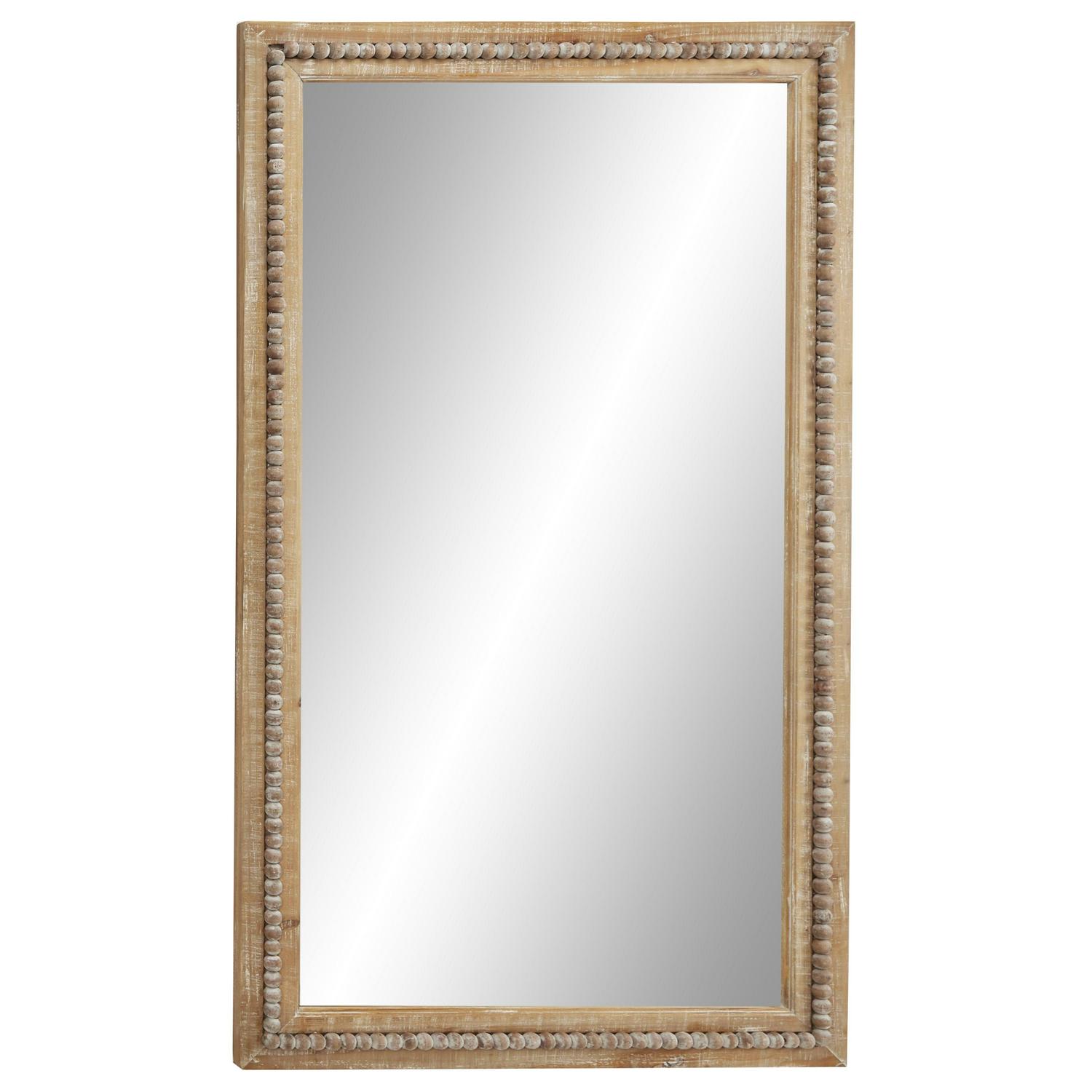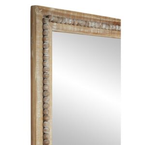 – Large size rectangular wall mirror featuring a reflective glass panel and brown whitewashed frame embellished with charming bead details