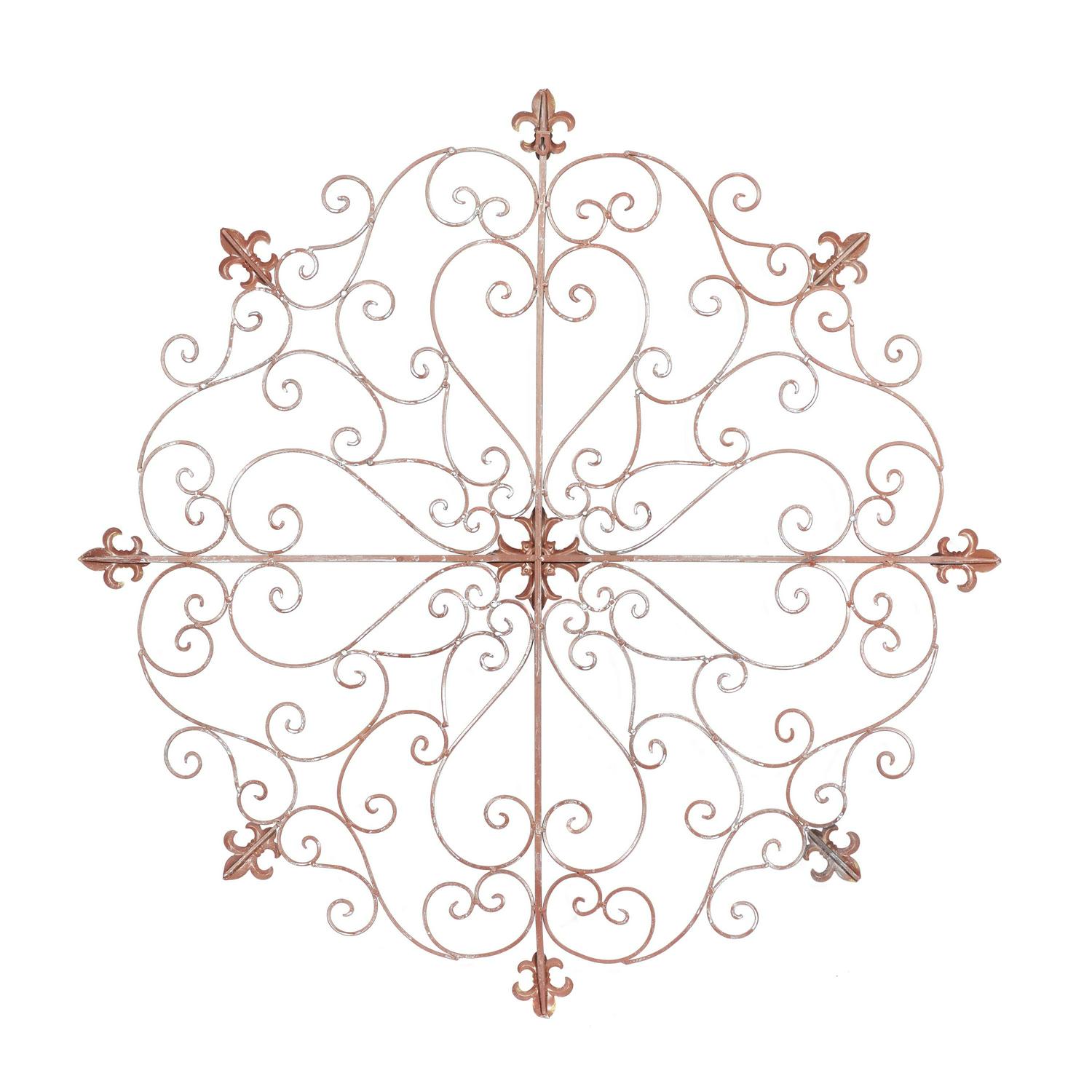– This Old World wall crest showcases a round, floral-shaped iron sculpture containing scrollwork details and Fleur-de-lis patterns