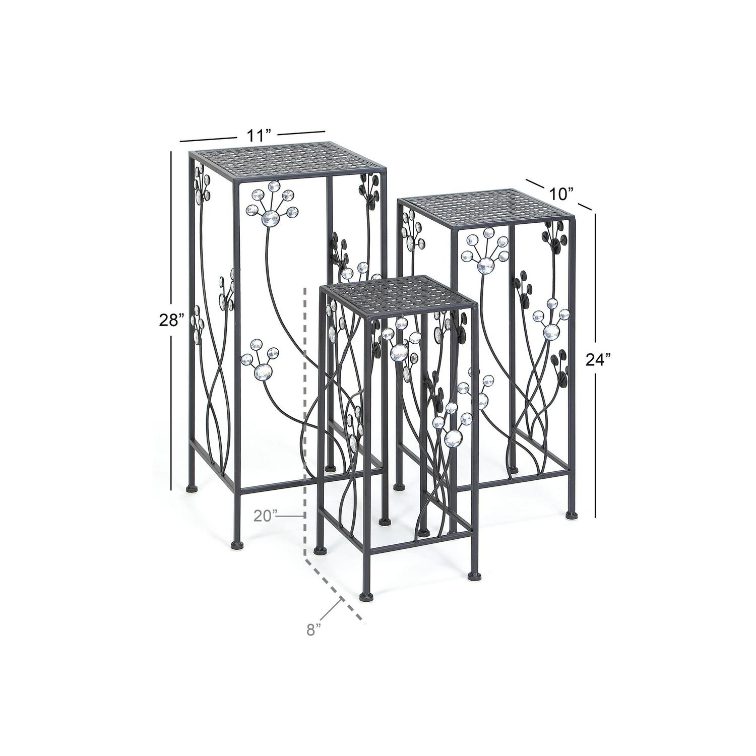 – Trio of decorative plant stands measure 11 L x 11 W x 28 H, 10 L x 10 W x 24 H, 8 L x 8 W x 20 H and collectively weigh 12.5 lbs