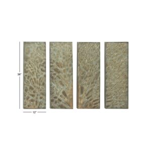 DecMode Green Metal Tree Wall Decor with Embossed Design (4 Count) is a unique addition to your stylish home. Create an excellent focal point on your walls paired with some cute accent tables, and level up your home with this amazing wall decor. Showcase your personality and turn your walls into an art gallery with this captivating wall décor. Hang the panels in your living room to complement a natural theme.. This item ships in 1 carton. Can be hung vertically using the keyholes; nails and screws not included. Suitable for indoor use only. This item ships fully assembled in one piece. This green colored iron wall sculptures comes as a set of 4. Rustic style.