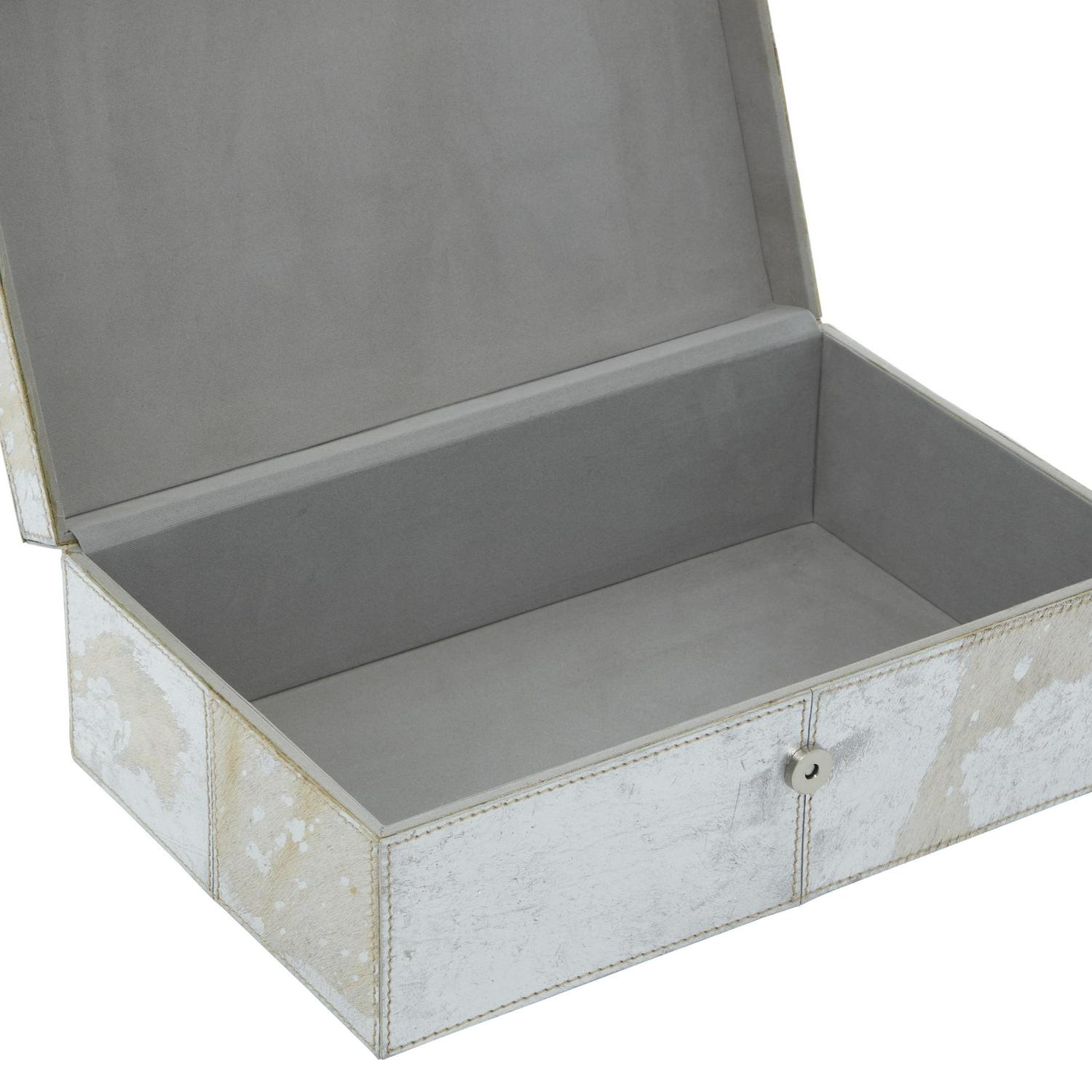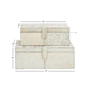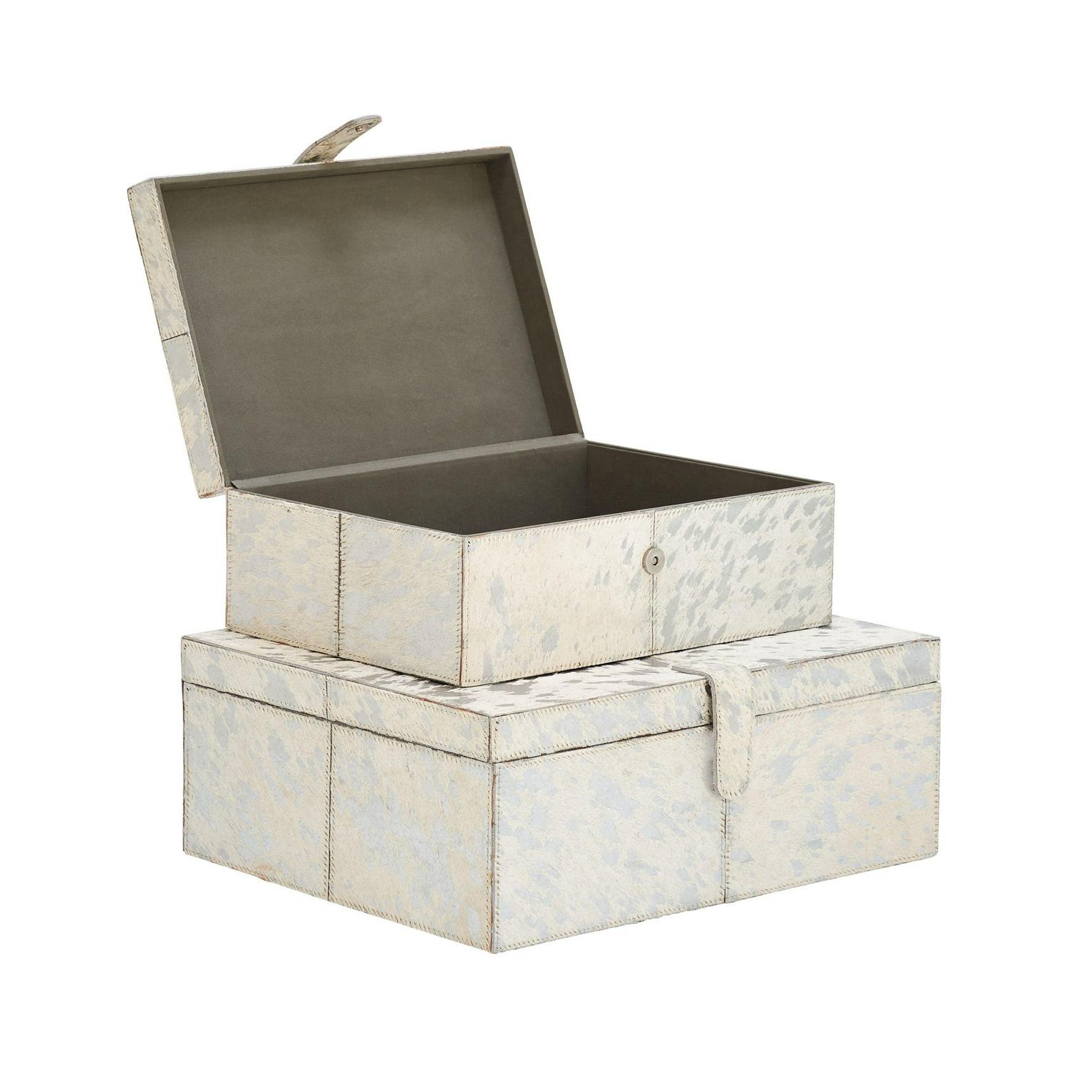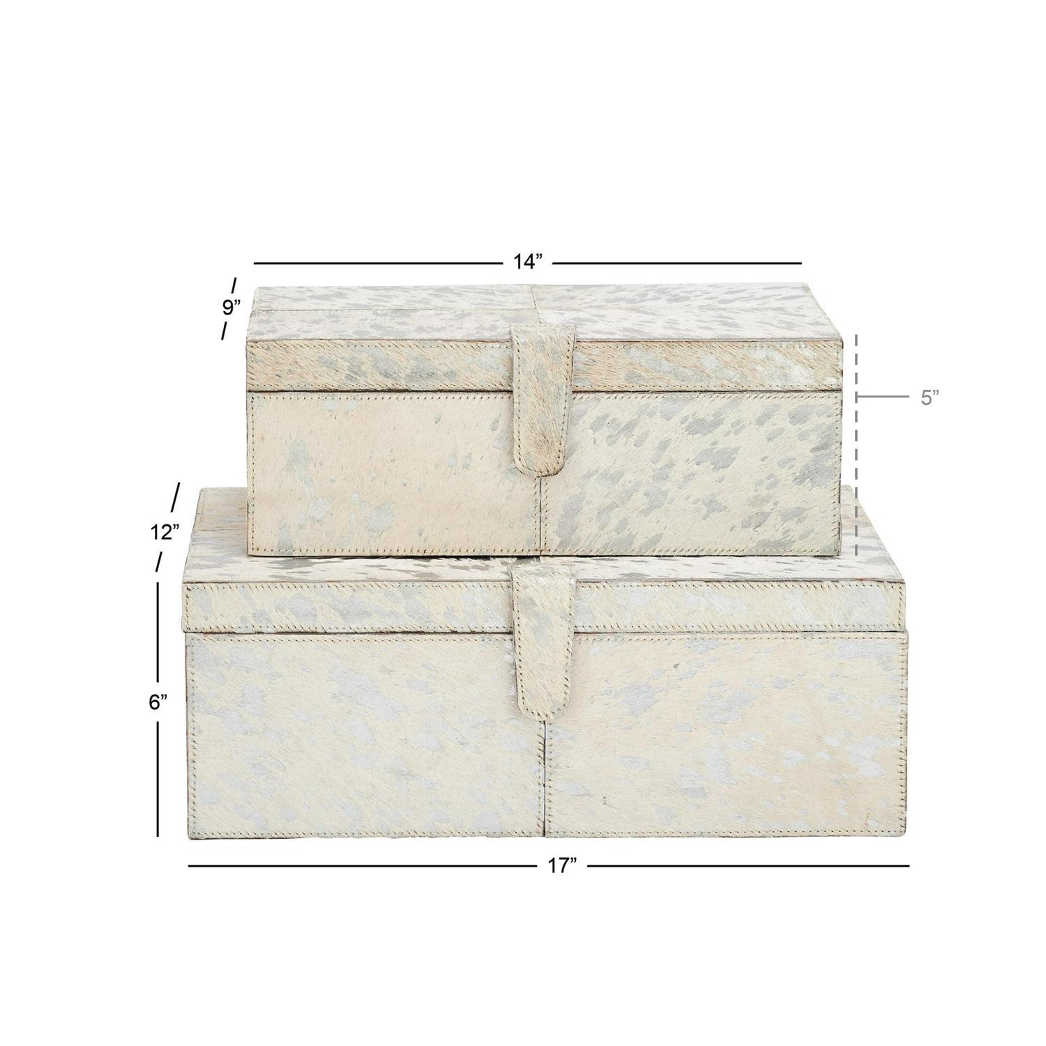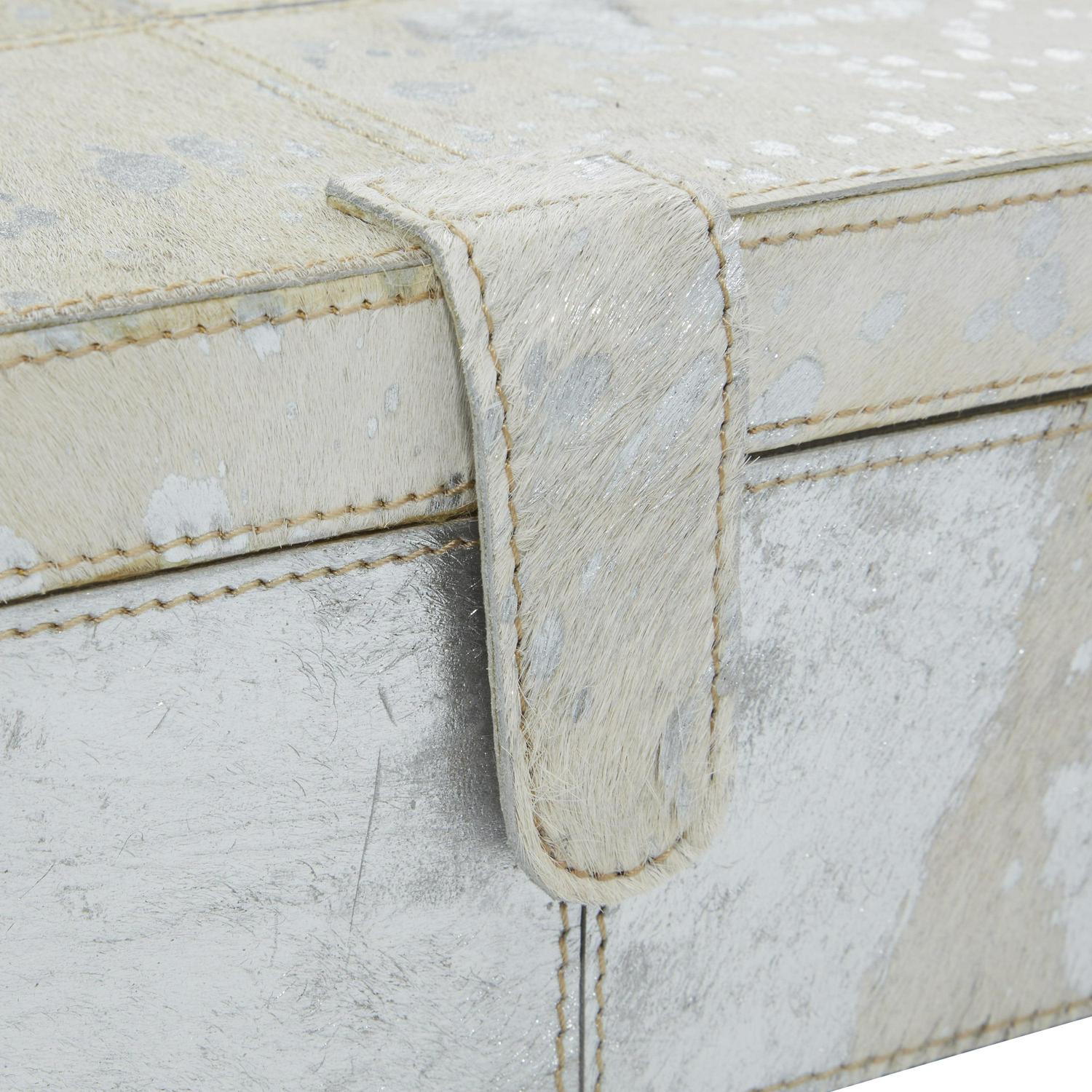 DecMode Handmade Silver Leather Decorative Box with Silver Foil Paint, 2 Count is a unique addition to your stylish home. A practical yet stylish upgrade that instantly elevate the look of your room. Perfect way to add depth and texture to your surface space with this compact and discreet box. Use these leather jewelry boxes together or separately to store personal belongings in the boudoir or bedroom or showcase table displays in the living room. Designed with felt or rubber stoppers at the base that prevent scratching furniture and table tops, as well as sliding around. This item ships in 1 carton. Features snap closures to secure your belongings.. Leather box makes a great gift for any occasion. Due to the handmade nature of this item, no two will be alike, there will be slight differences in shape, size, and color. Suitable for indoor use only. This item ships fully assembled in one piece. Leather and hair on hide are natural products, and therefore no two will be alike. There may slight variations in pattern, natural blemishes, colors, and overall aesthetic of the product. Made in India. This silver colored decorative keepsake box comes as a set of 2. Glam style.