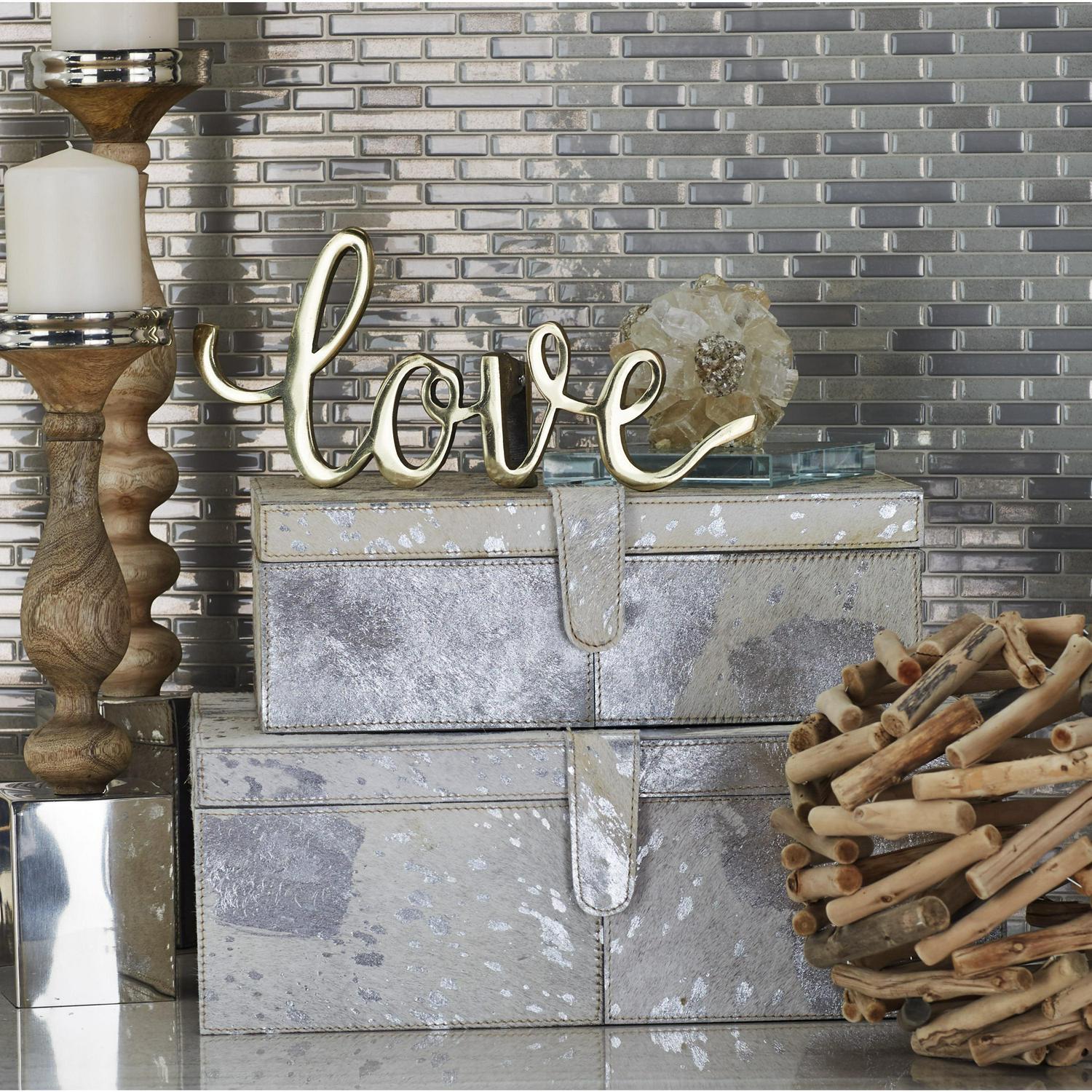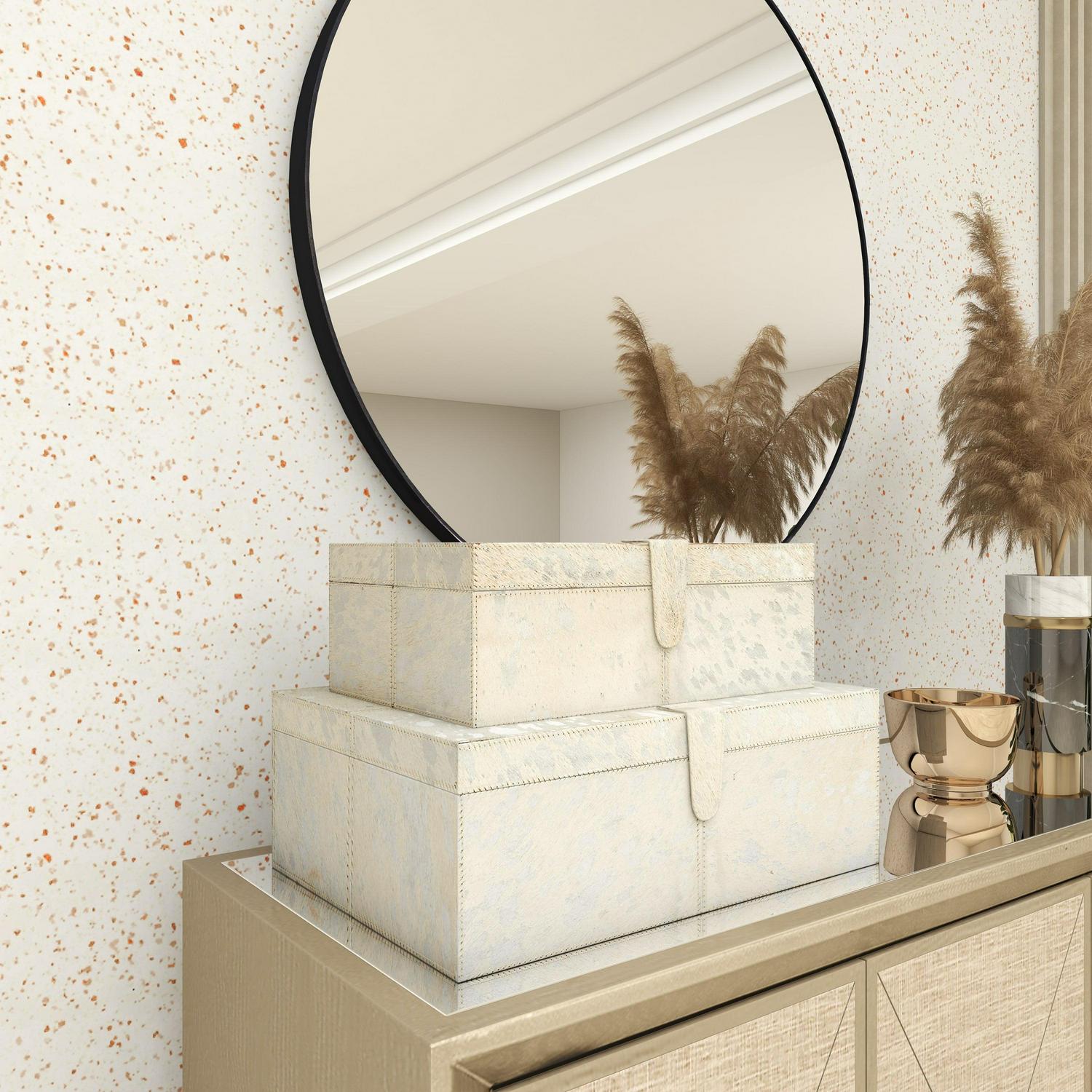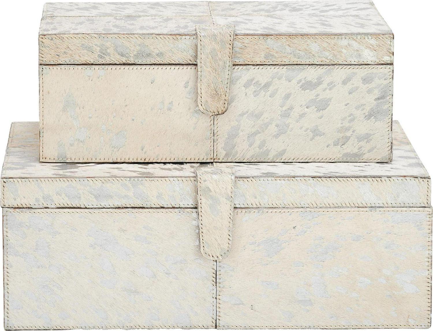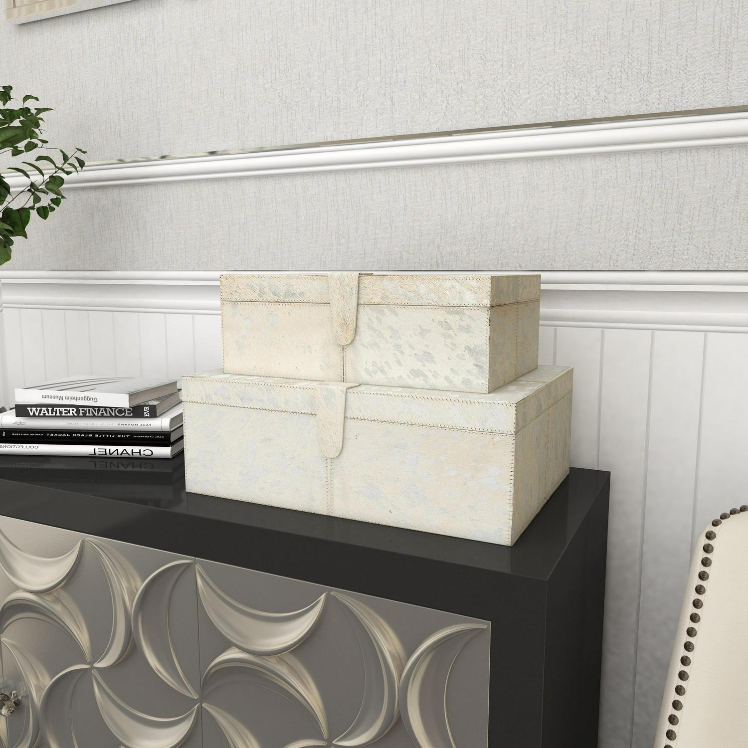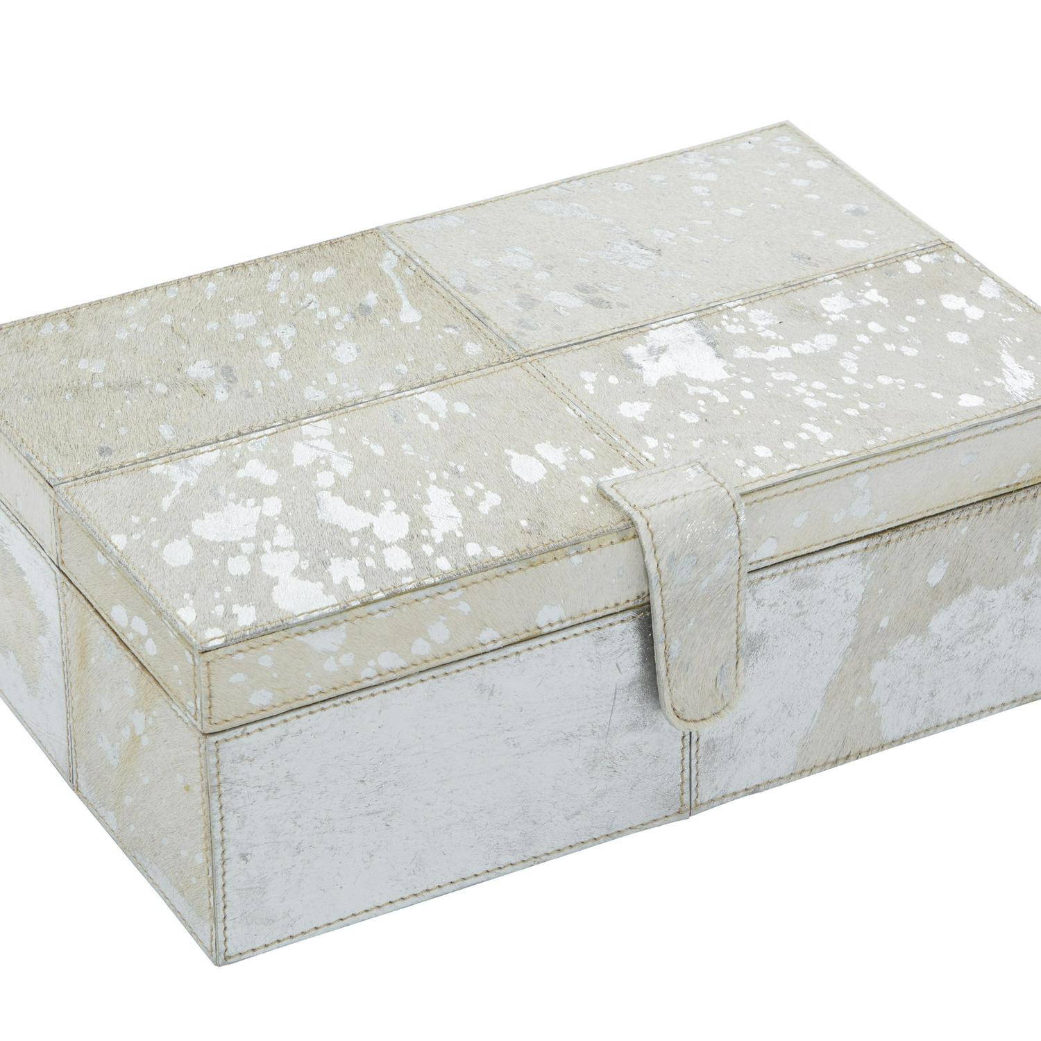 DecMode Handmade Silver Leather Decorative Box with Silver Foil Paint, 2 Count is a unique addition to your stylish home. A practical yet stylish upgrade that instantly elevate the look of your room. Perfect way to add depth and texture to your surface space with this compact and discreet box. Use these leather jewelry boxes together or separately to store personal belongings in the boudoir or bedroom or showcase table displays in the living room. Designed with felt or rubber stoppers at the base that prevent scratching furniture and table tops, as well as sliding around. This item ships in 1 carton. Features snap closures to secure your belongings.. Leather box makes a great gift for any occasion. Due to the handmade nature of this item, no two will be alike, there will be slight differences in shape, size, and color. Suitable for indoor use only. This item ships fully assembled in one piece. Leather and hair on hide are natural products, and therefore no two will be alike. There may slight variations in pattern, natural blemishes, colors, and overall aesthetic of the product. Made in India. This silver colored decorative keepsake box comes as a set of 2. Glam style.