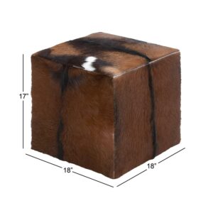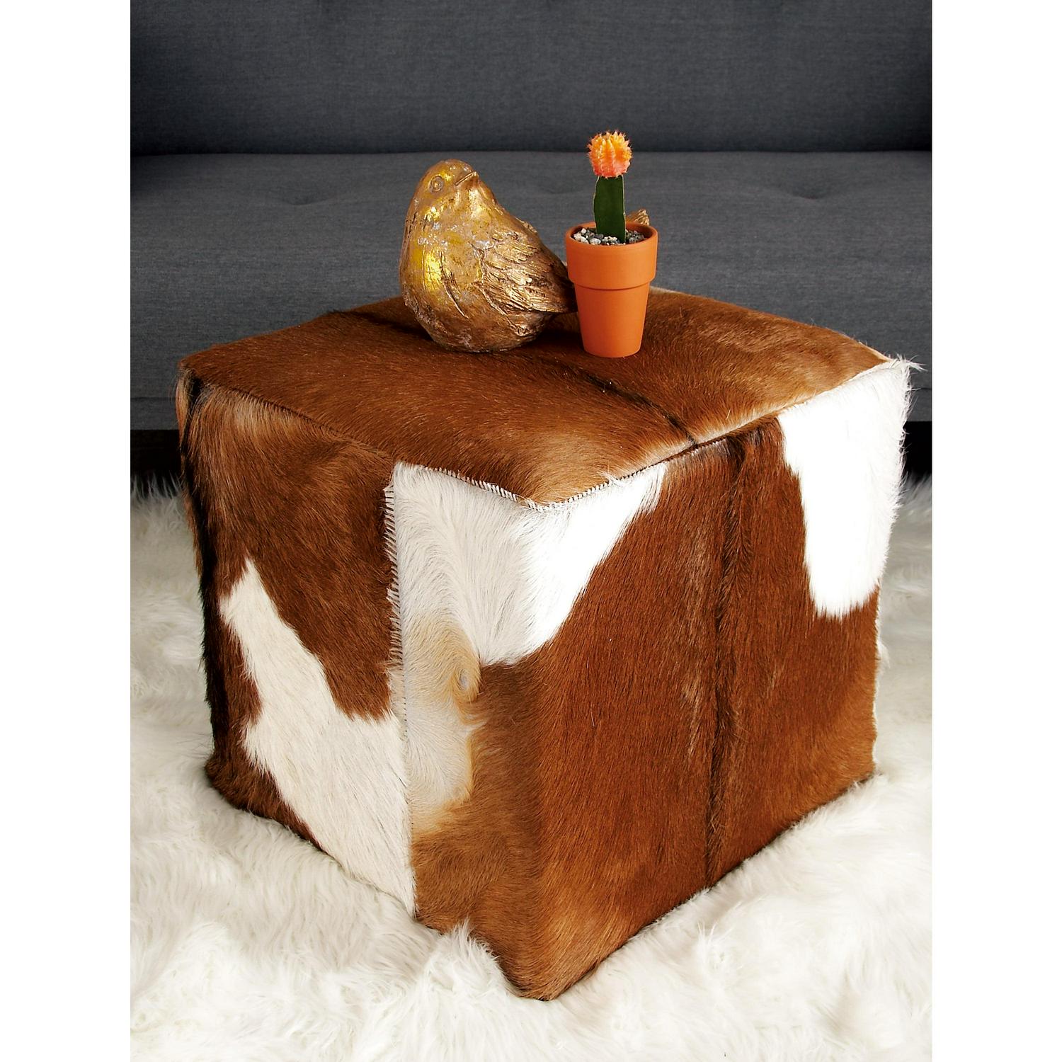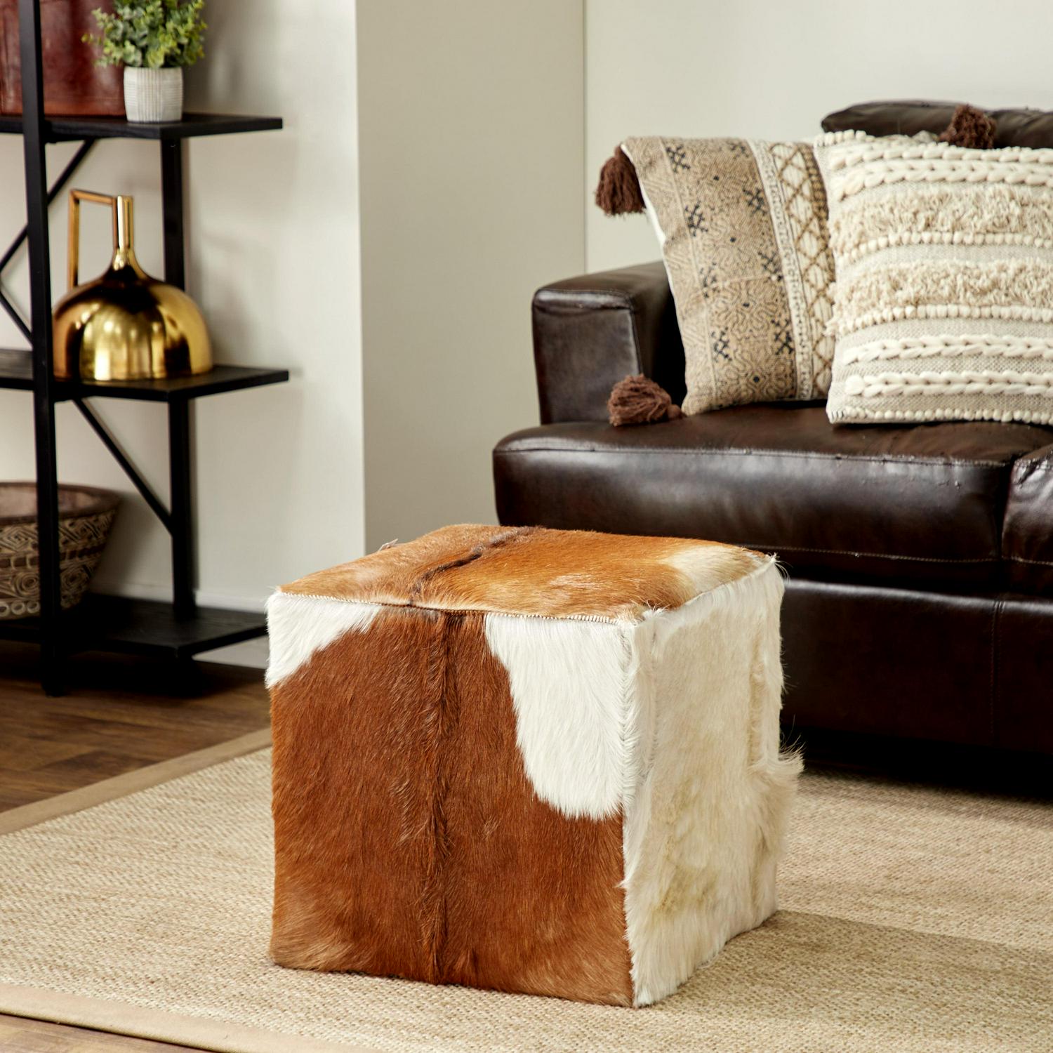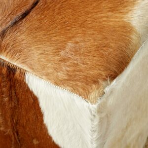 DecMode Leather Stool, Brown is a unique addition to your stylish home. Use this brown leather stool as a footrest or display table with your leather sofa and knitted throw for a refine style of home. This item ships in 1 carton. Suitable for indoor use only. This item ships fully assembled in one piece. Leather and hair on hide are natural products, and therefore no two will be alike. There may slight variations in pattern, natural blemishes, colors, and overall aesthetic of the product. Maximum weight limit is 200 lbs. Made in Indonesia. This is a single brown colored ottoman. Rustic style.