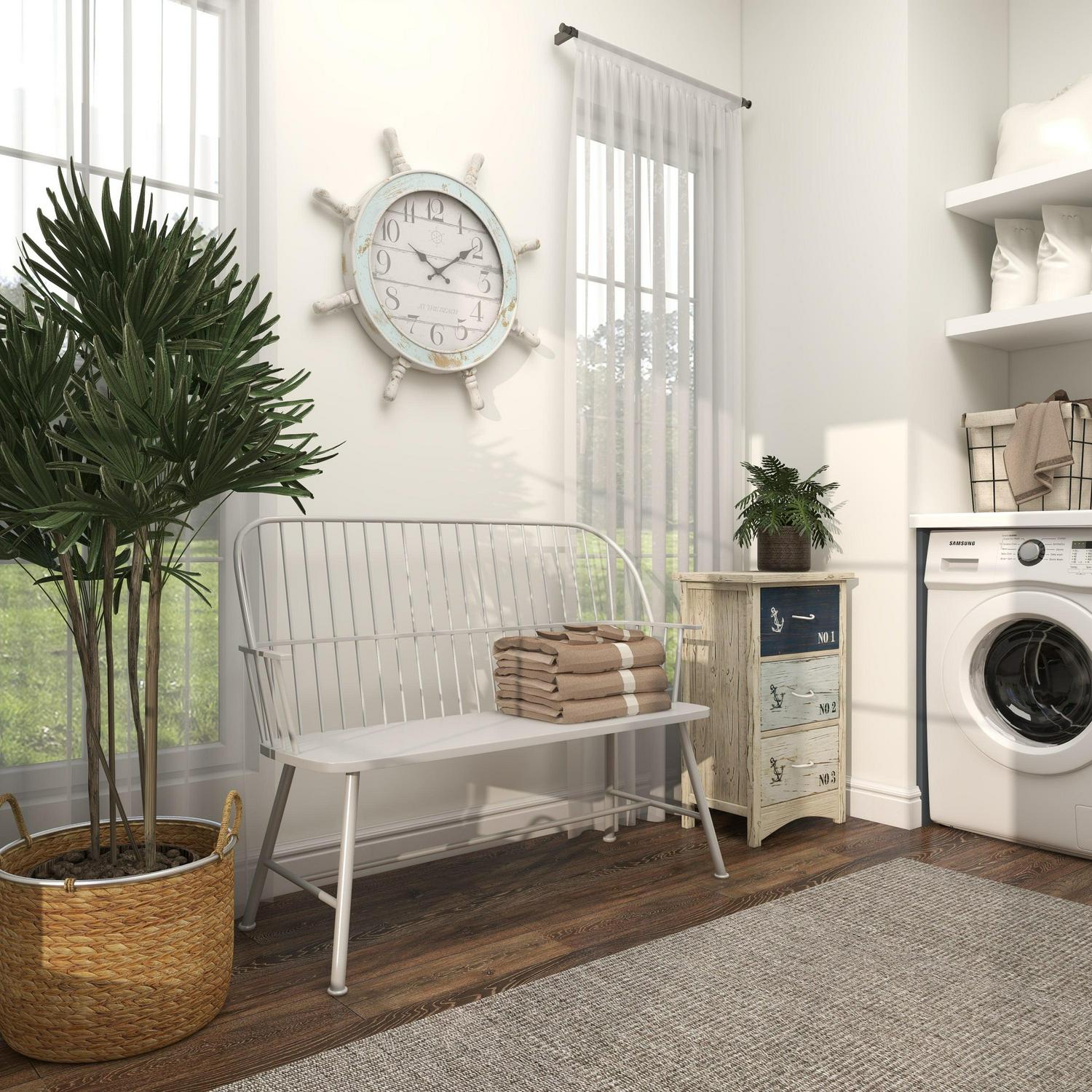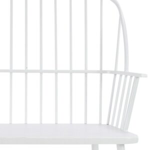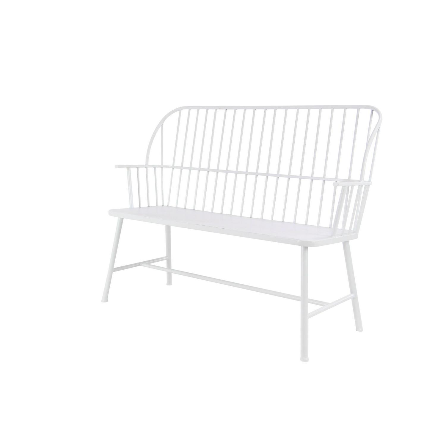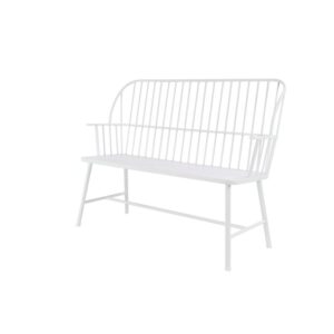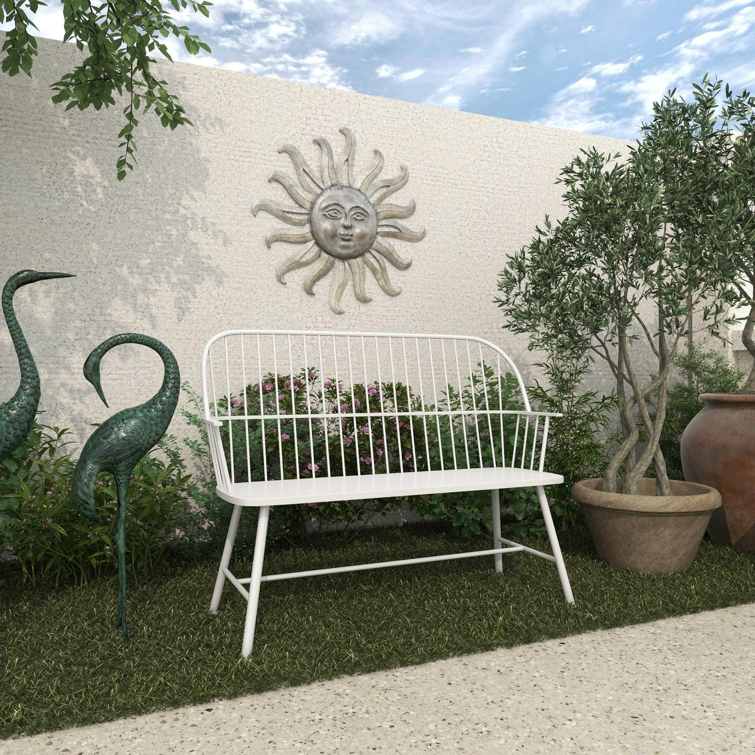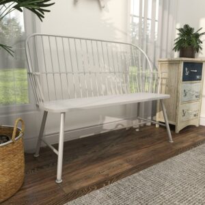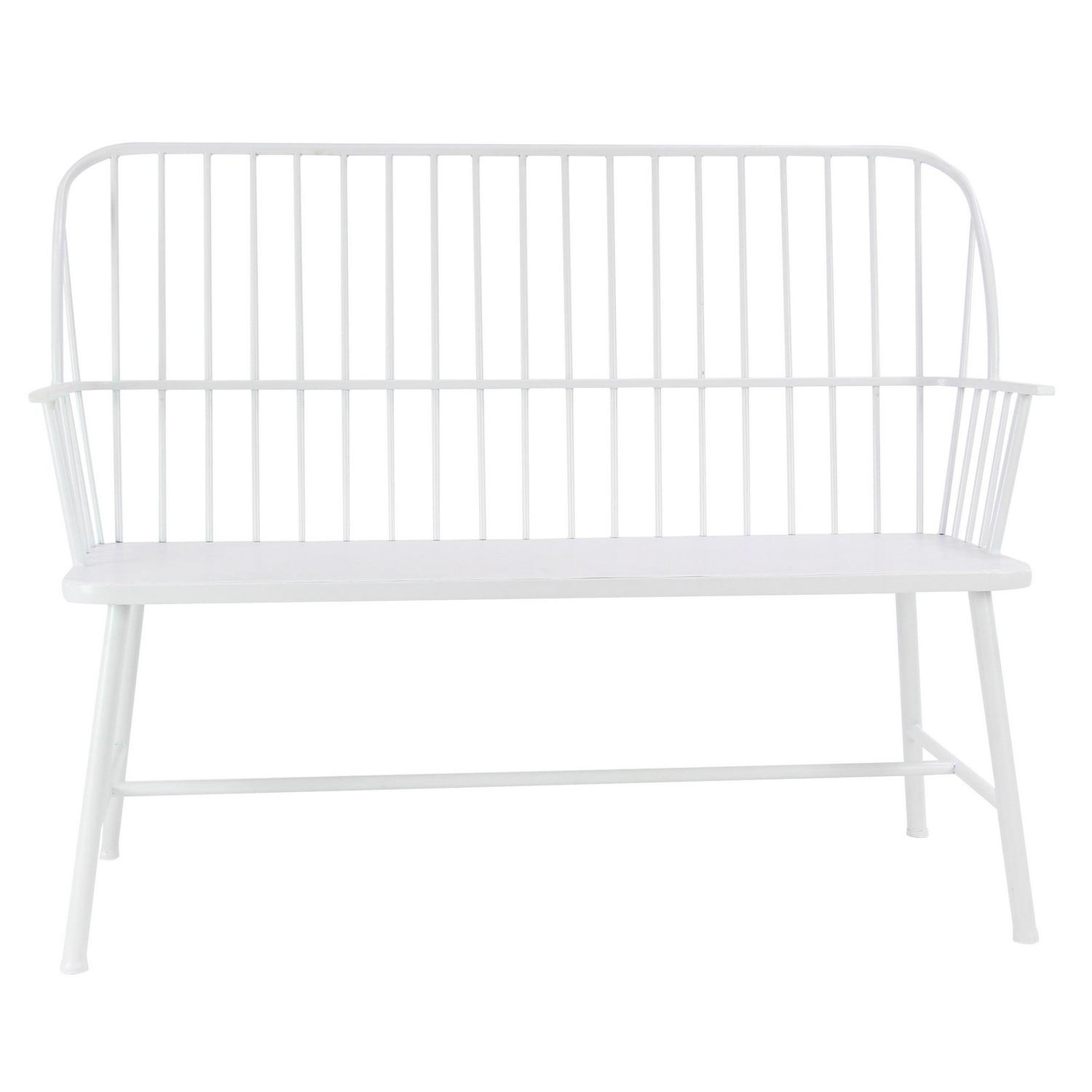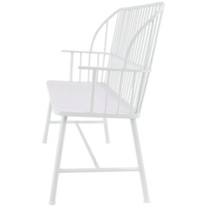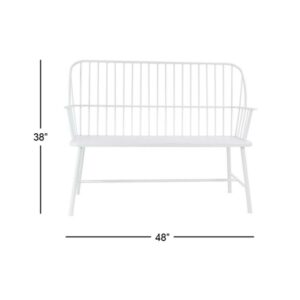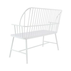 DecMode Metal Outdoor Bench, White is a unique addition to your stylish home. This bench is perfect for creating a focal point in your home with comfortable seating. So take a load off and relax on this decorative outdoor bench. White bench carries a blend of style and function and will complement light colored pillows and natural grass baskets. This item ships in 1 carton. Suitable for indoor and outdoor use. This item ships fully assembled in one piece. Maximum weight limit is 400 lbs. Can accommodate 2 people. This is a single white colored patio bench. Farmhouse style. Iron structure are painted with a special coating to help protect it from the elements, iron may show signs of corrosion in salt air environments.