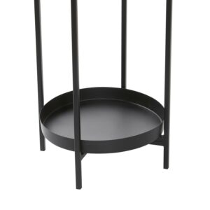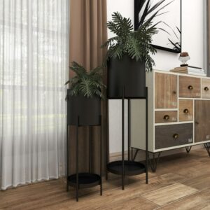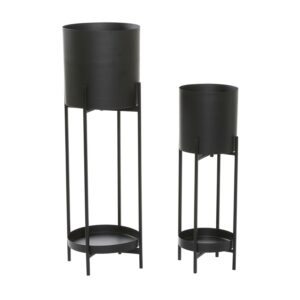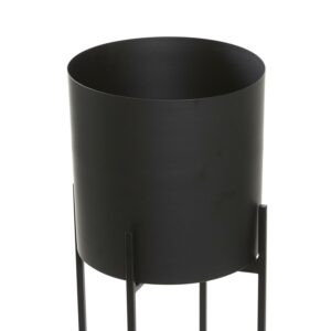 – These black planters feature cylindrical pots with deep setting, thin metal open stands, and round lower containers