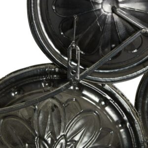 – Multicolor metal wall design flaunting round plates with floral patterns