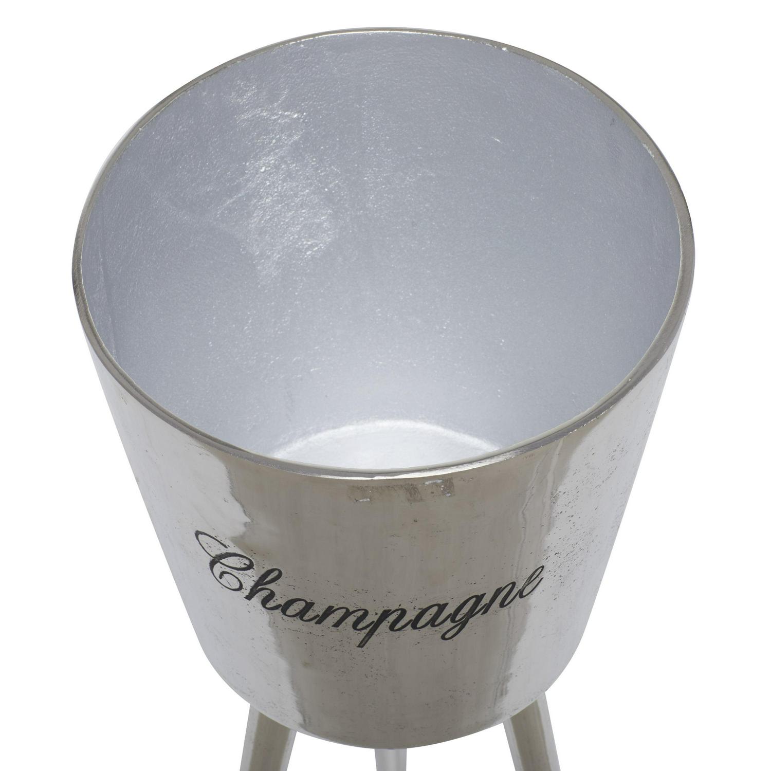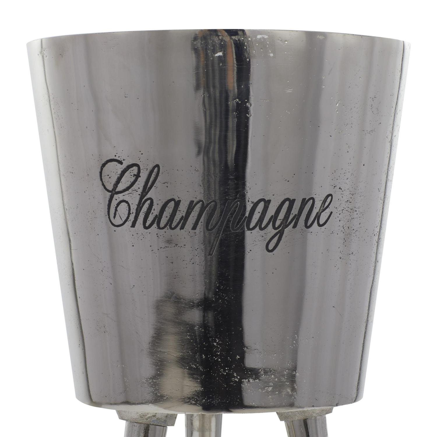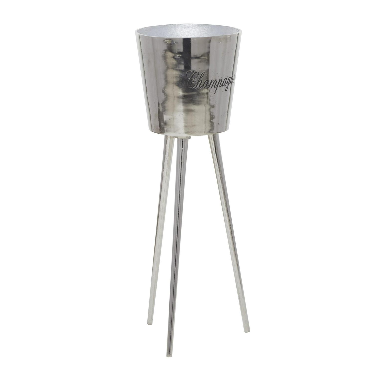 – An aluminum piece featuring a bucket-inspired wine storage with cylindrical tapered body designed with Champagne typography, and an elongated tripod stand