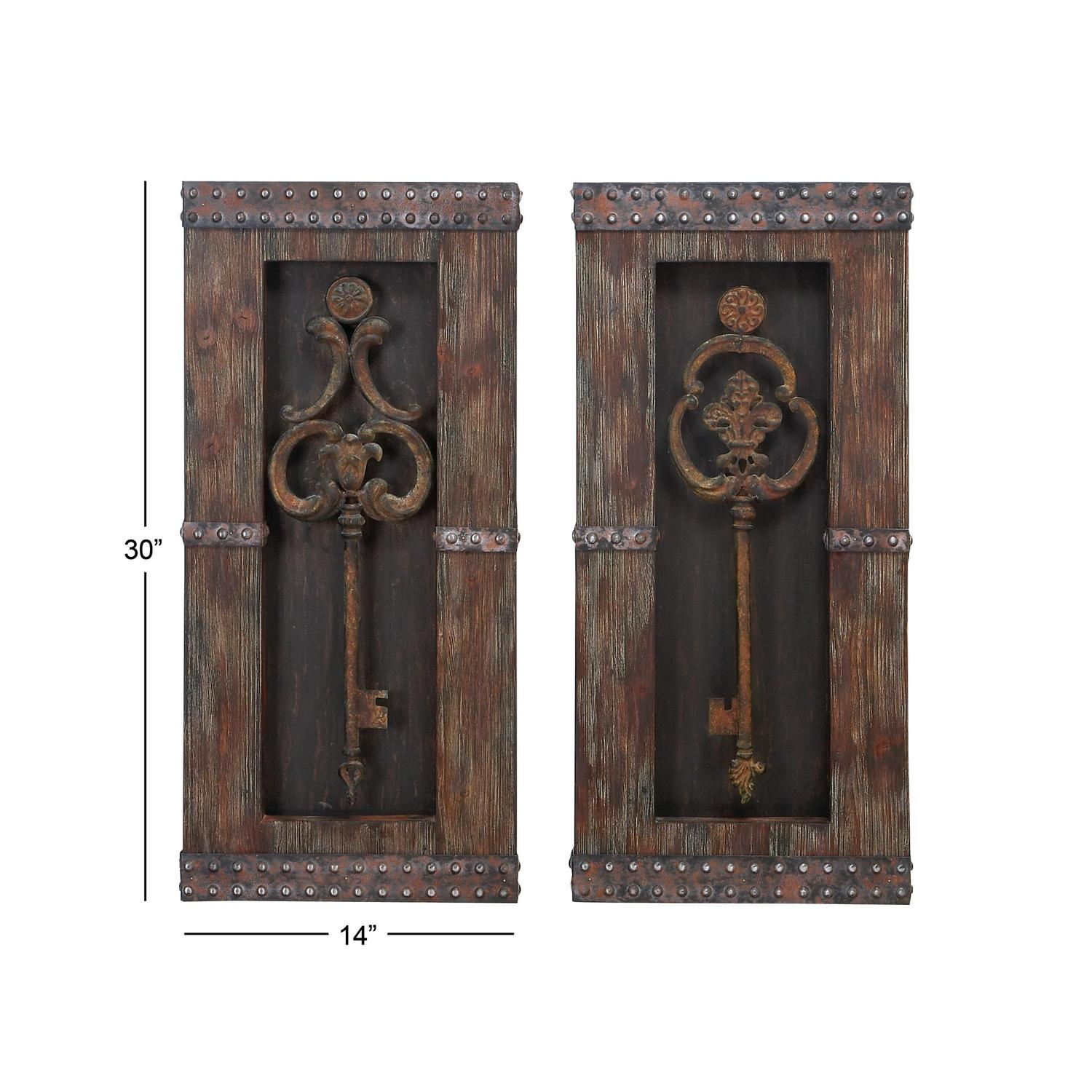 DecMode Rustic Wood 3D Skeleton Keys Framed Wall DA(C)cor with Natural Brown Finish, Set of 2 14 W x 30 H