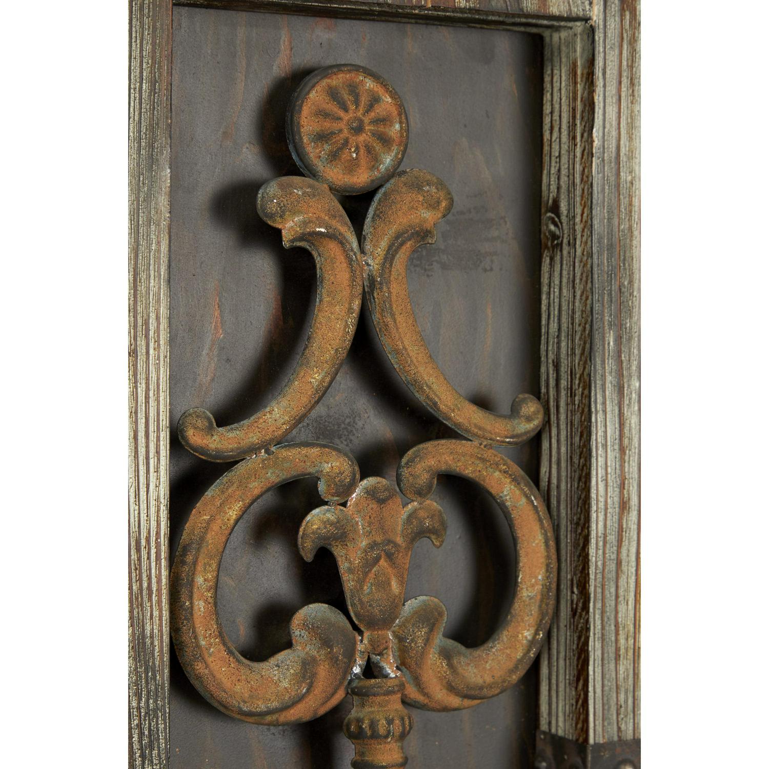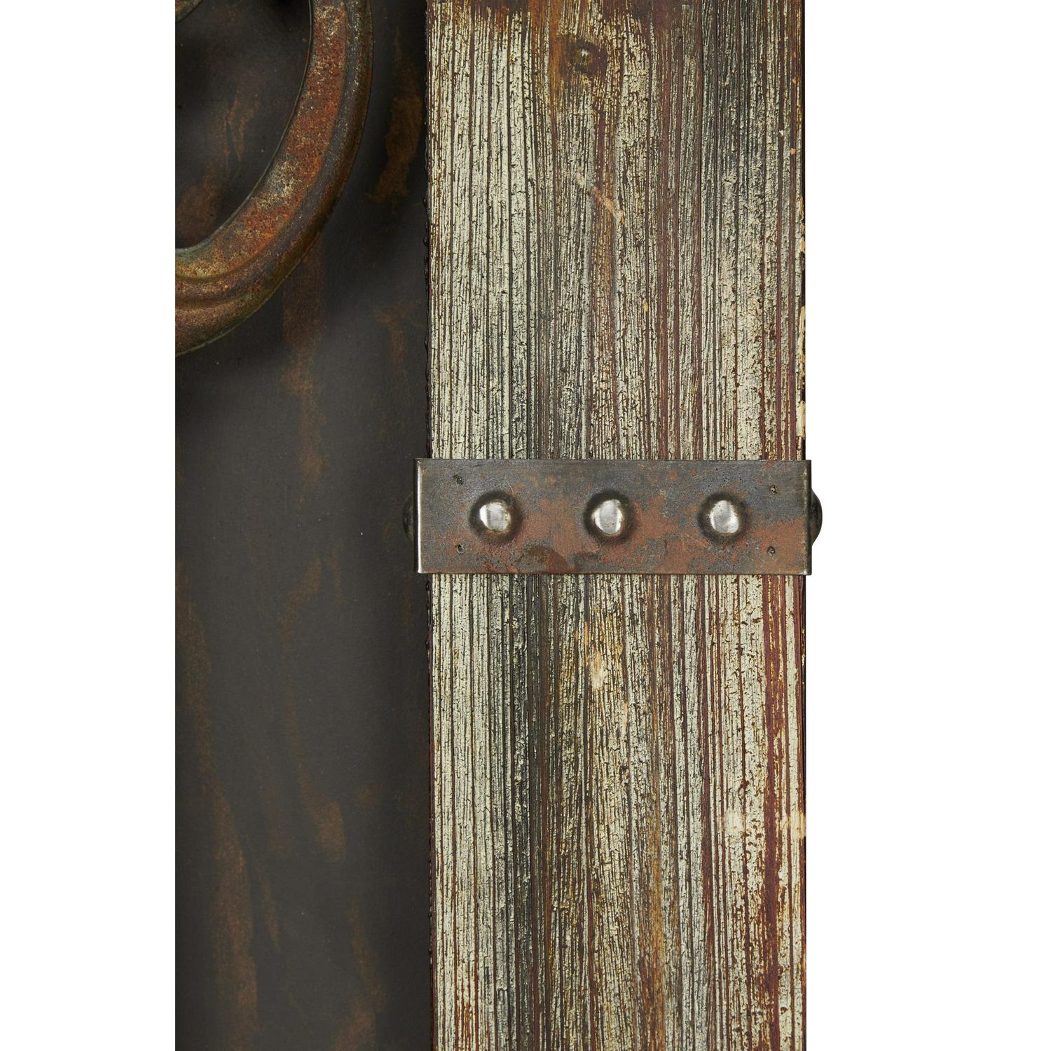 - These wall decor highlights distressed and textured natural wood brown finish for a rustic look