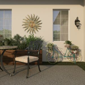 – DecMode 54″ x 18″ x 32″ Blue Metal Indoor Outdoor Scrollwork And Wire Design Bike Plantstand with Basket and Saddle Bag Planters makes a perfect addition to any home