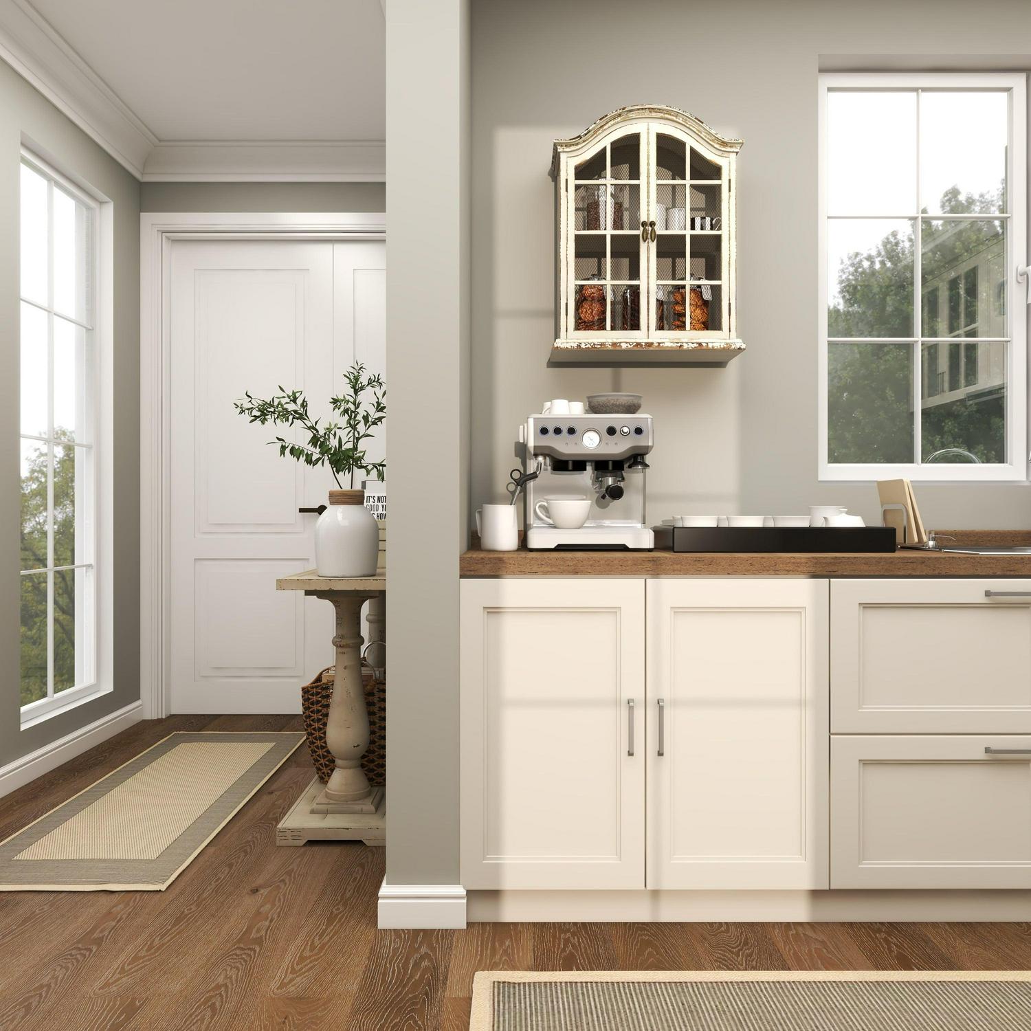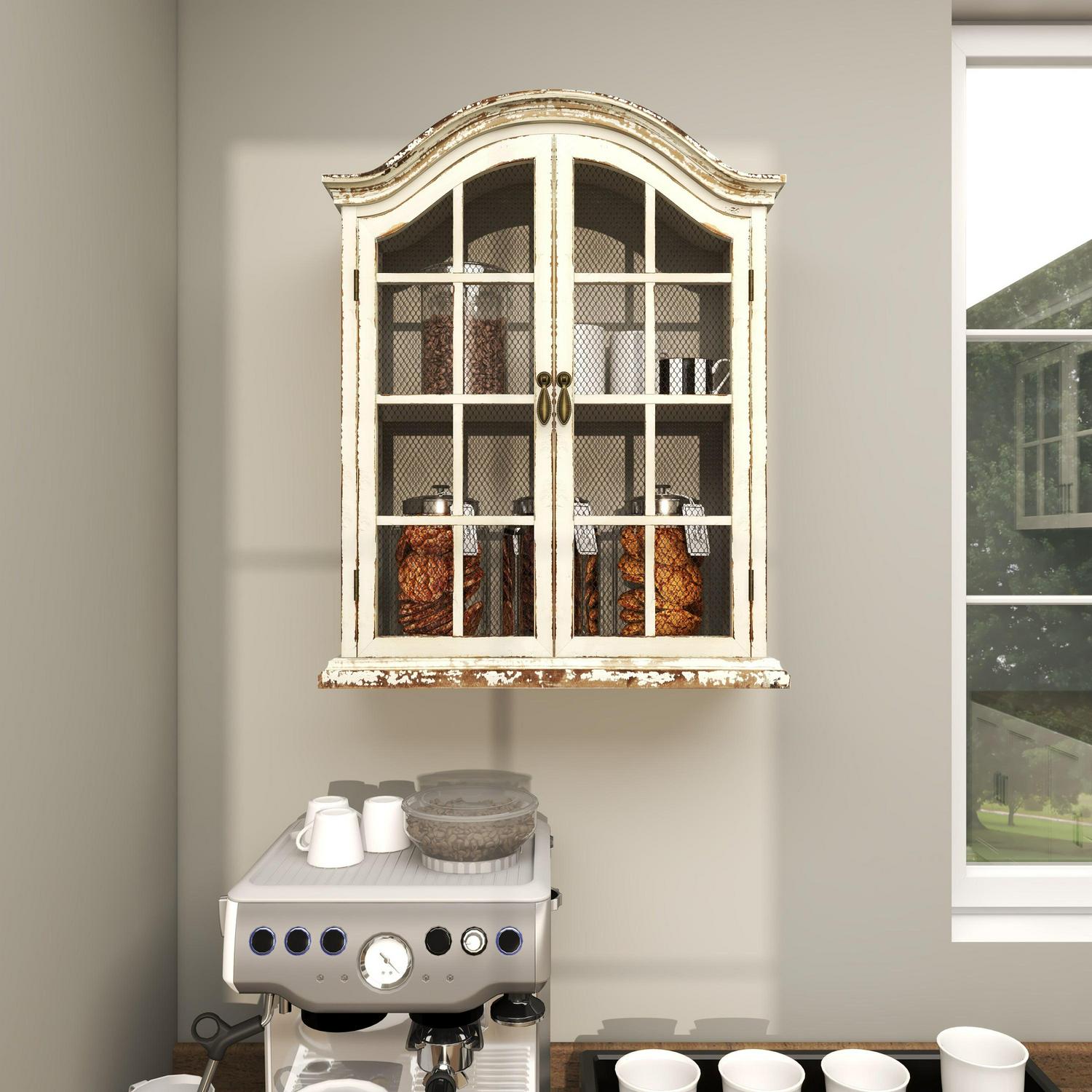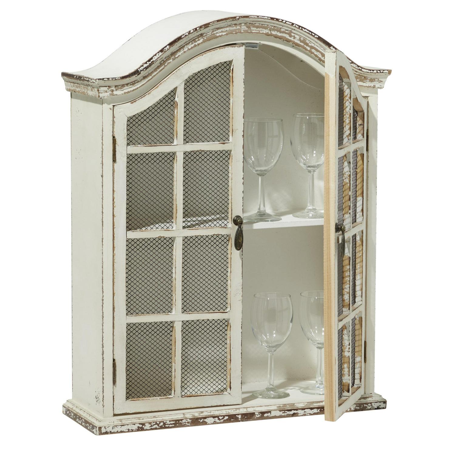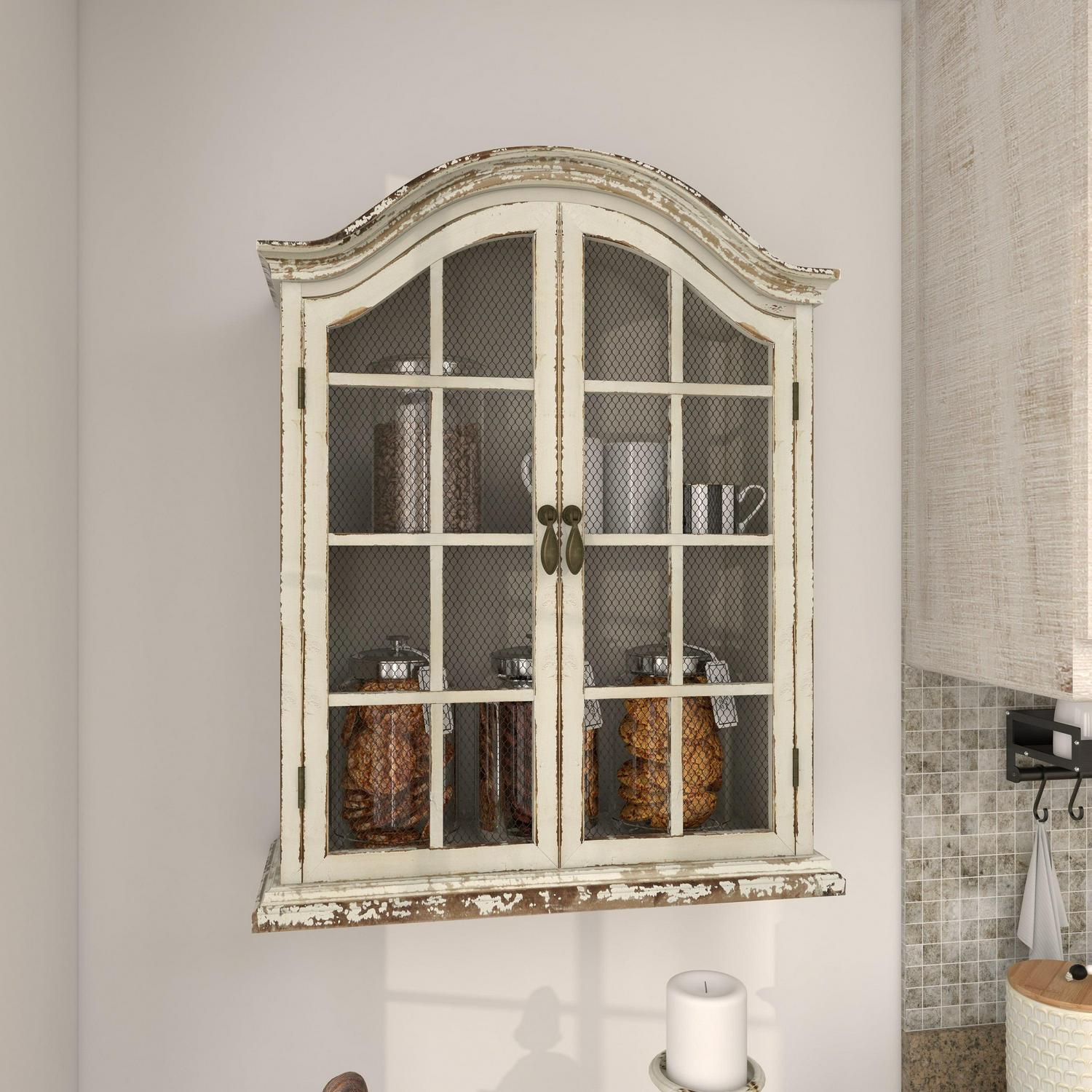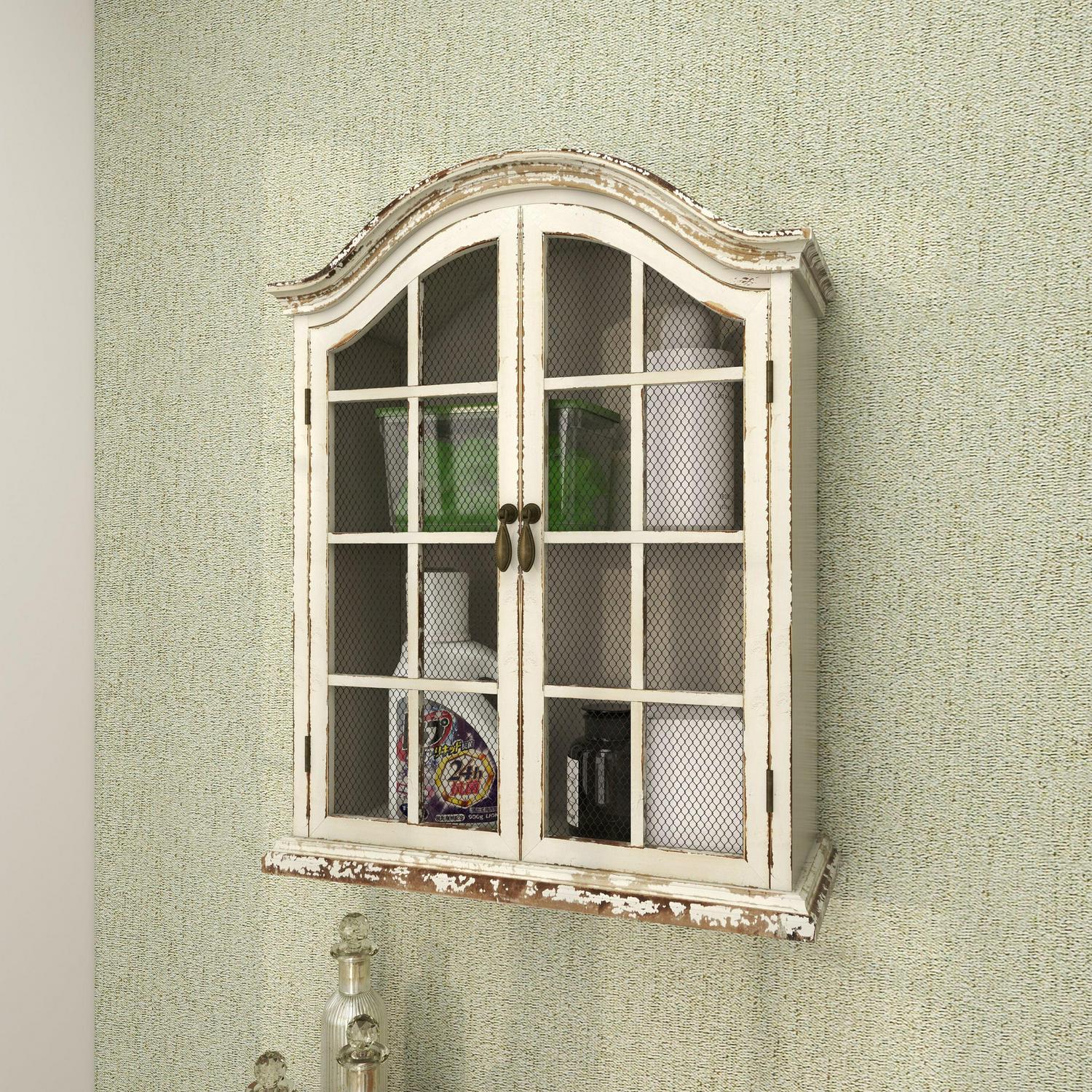 - Cream and brown distressing highlight this traditional wall mounted cabinet