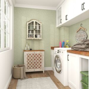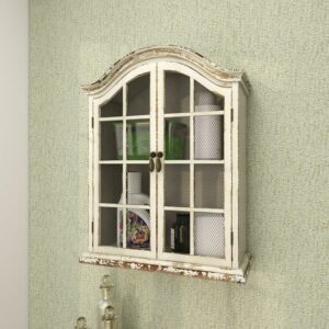 – Vintage wall cabinet features an arched window-inspired design with vintage pattern and a raised beveled base