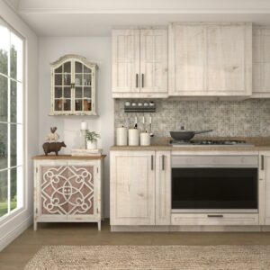 – Our wooden wall cabinet features a cottage-themed window design with a 2-tier shelf function and two open-style cabinet doors with a metal screen netting