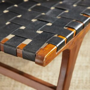 – Low profile chair with black leather seat and back on a dark brown wood structure