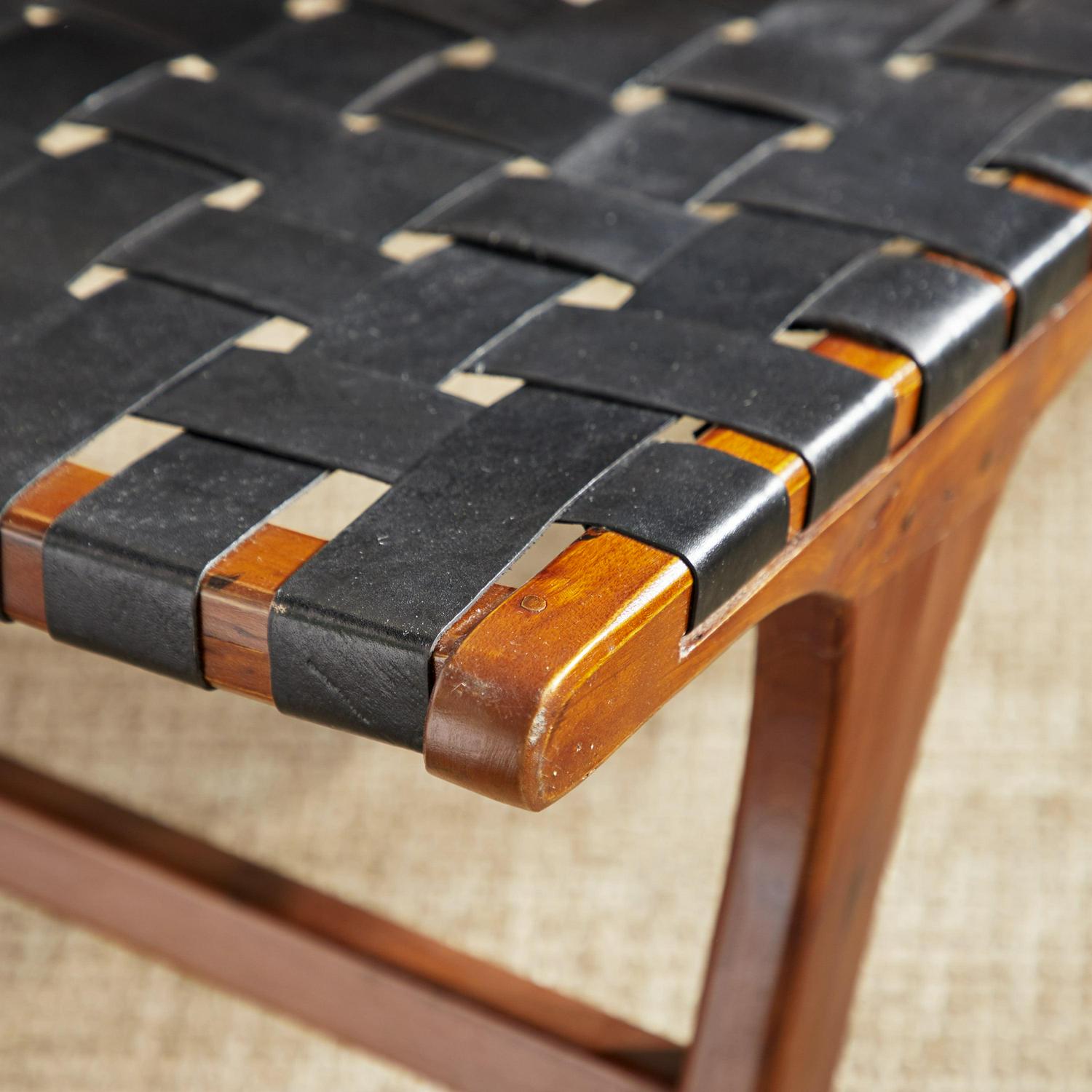 - Low profile chair with black leather seat and back on a dark brown wood structure