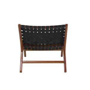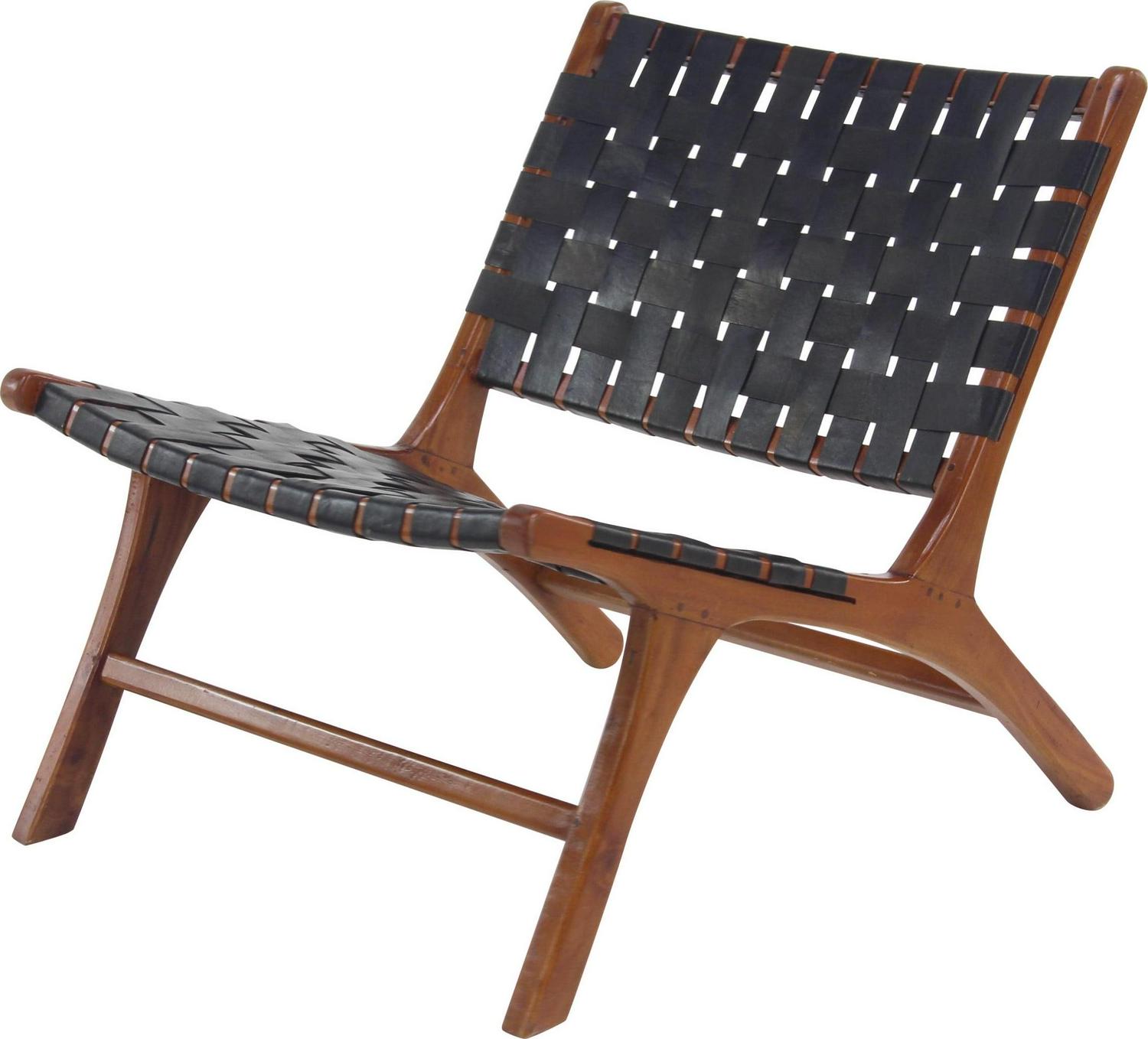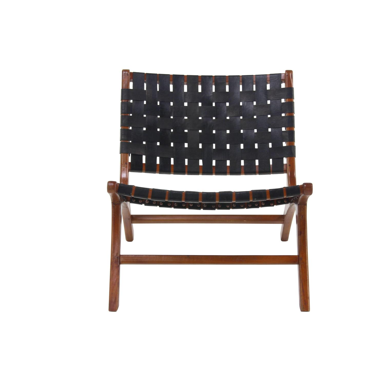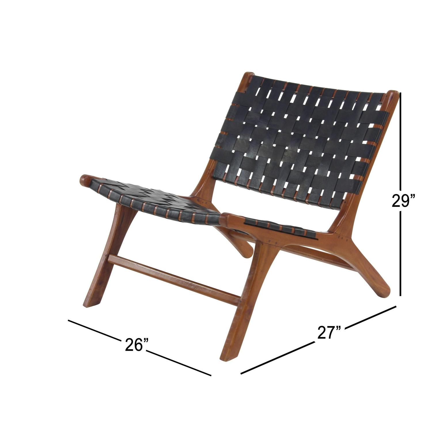 DecMode Wood Woven Lounge Chair, Black, Set of 2 is a unique addition to your stylish home. Kick back and relax as you wine down from a long hard day at work. Great for adding additional seating and storage with a charming appeal. A relaxing black wooden accent chair perfect for your living room, home office, or bedroom. This item ships in 1 carton. Low profile wood chairs with black leather strip upholstery. Suitable for indoor use only. This item ships fully assembled in one piece. Maximum weight limit is 250 lbs. Made in Indonesia. Can accommodate 1 person. This black colored side chair comes as a set of 2. Contemporary style.