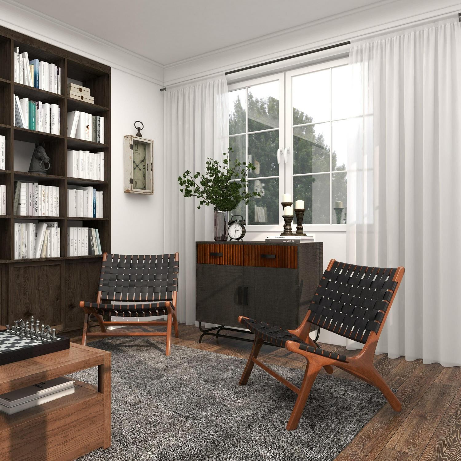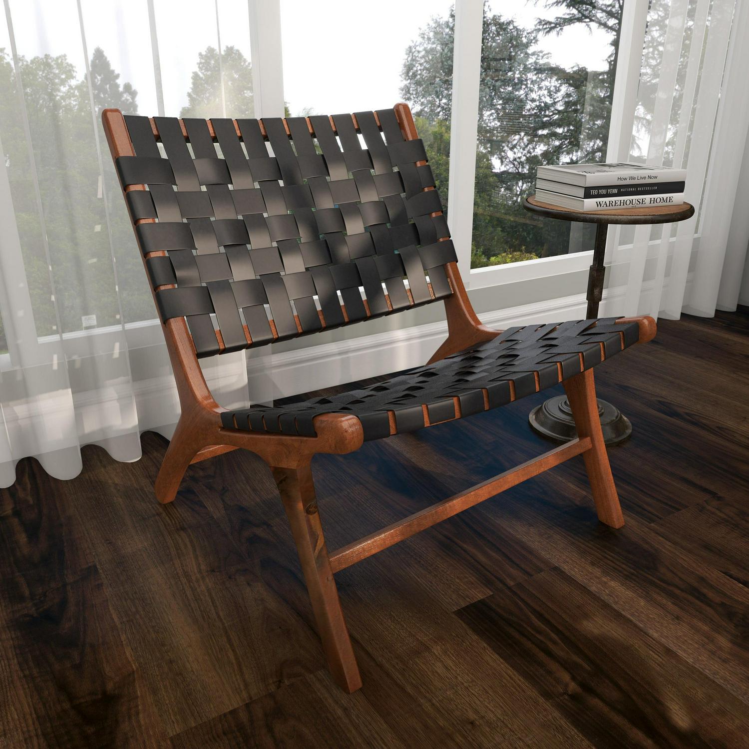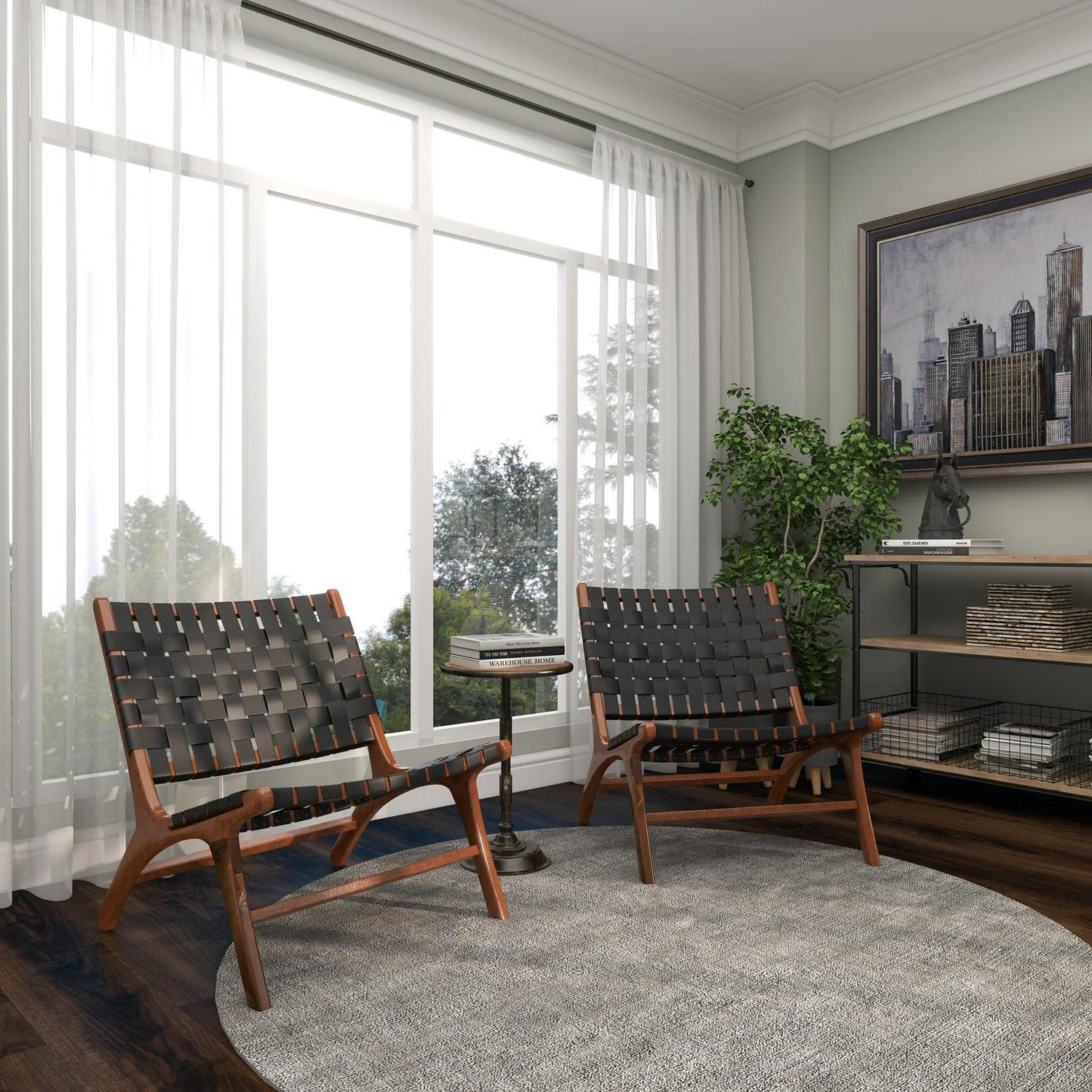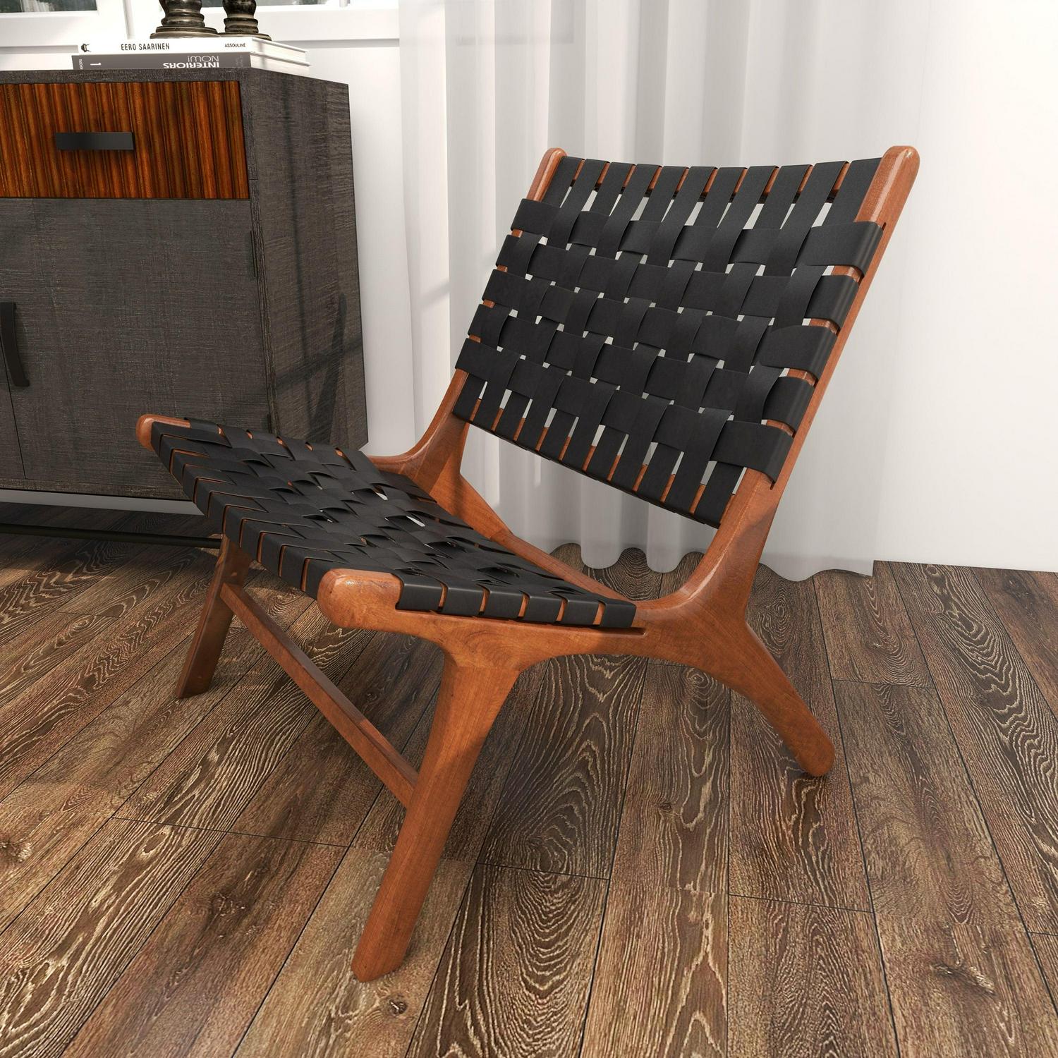 DecMode Wood Woven Lounge Chair, Black, Set of 2 is a unique addition to your stylish home. Kick back and relax as you wine down from a long hard day at work. Great for adding additional seating and storage with a charming appeal. A relaxing black wooden accent chair perfect for your living room, home office, or bedroom. This item ships in 1 carton. Low profile wood chairs with black leather strip upholstery. Suitable for indoor use only. This item ships fully assembled in one piece. Maximum weight limit is 250 lbs. Made in Indonesia. Can accommodate 1 person. This black colored side chair comes as a set of 2. Contemporary style.