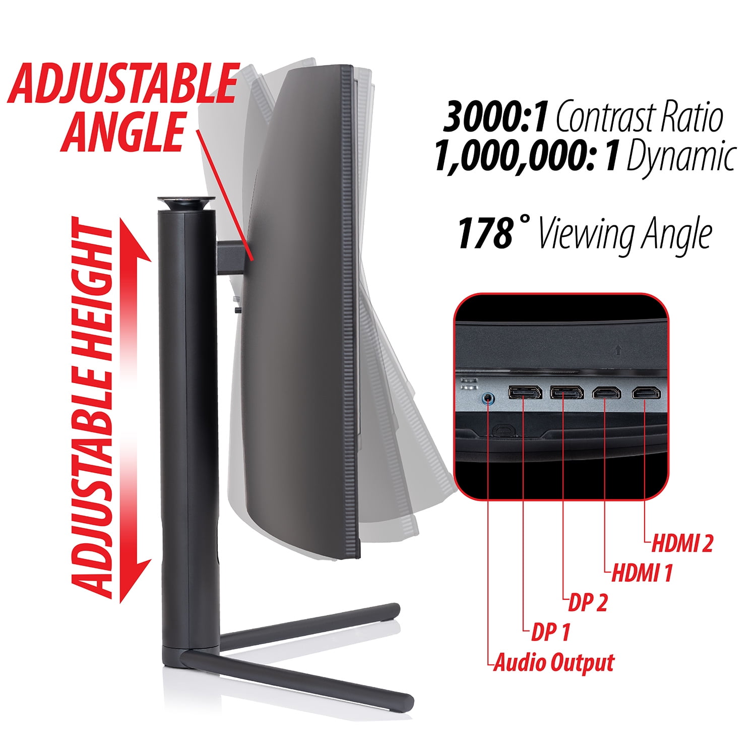 E1DGVIEW304 34-inch 3440×1440 180 Hz Curved Monitor, 1 DP Cable, 1 Power Cable, 1 Manual, 1 Wall Mount Connector, Spare Screws Authorized Deco Gear Dealer Limited Warranty Deco Gear Large Extended Pro Gaming Mouse Pad Water Resistant Non-Slip (12″ x 32″) Deco Gear Mechanical Gaming Keyboard Focus like never before on an immersive, curved monitor with an E-LED screen, improved color accuracy, and a task-crushing ultrawide experience. The VIEW304 34 Ultrawide Curved Monitor combines 3440×1440 pixels of incredible detail into one large and immersive VA panel screen that’s for either the professional or enthusiast. A high-end 180Hz refresh rate creates fluid motion and smooth representations of your games, web videos, movies, and more. Don’t miss a beat when playing highly competitive online games! Additionally, the 21:9 aspect ratio provides ample landscape so you don’t miss any of the action! This monitor combines the best aspects of curved and ultrawide monitors into one immersive screen – get the full breadth of a detailed panoramic experience that covers everything from multitasking work duties to unforgettable gaming moments. Curved monitors also excel in reducing eye movements which in turn limits the amount of eye strain and fatigue. Appreciate eye-popping visuals and deep contrasts with up to 16.7 million support colors and a 4000:1 contrast ratio. Accurate color reproduction means you’ll see colors as they were meant to be seen with up to 99% sRGB color accuracy. The R1500 curve rating of this monitor means you have an ideal viewing experience at nearly every angle. With an adjustable base, find the perfect height, tilt, and swivel adjustments that cater perfectly to your seating position and desk.