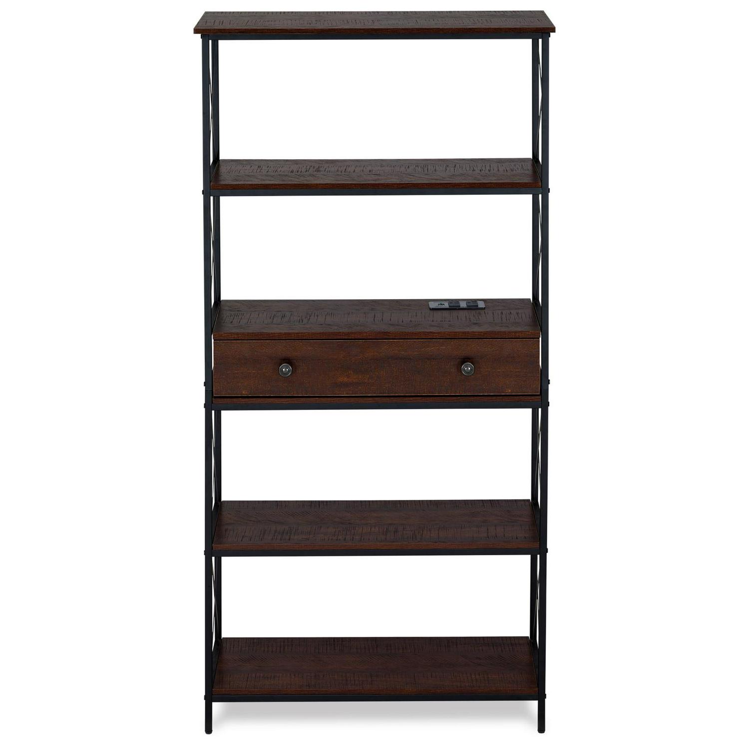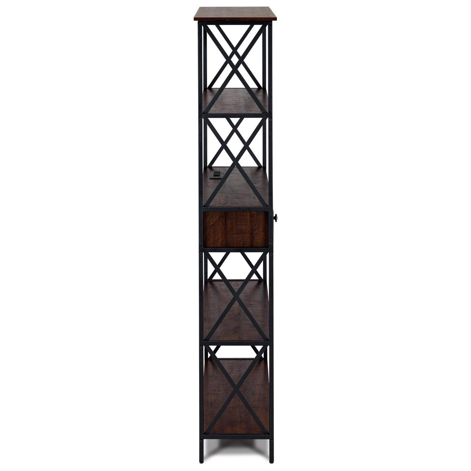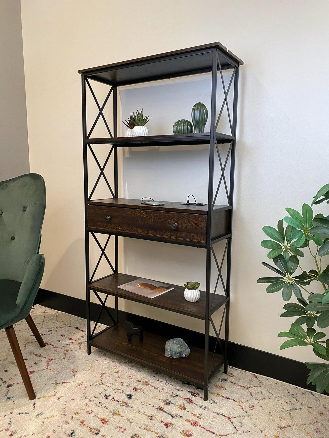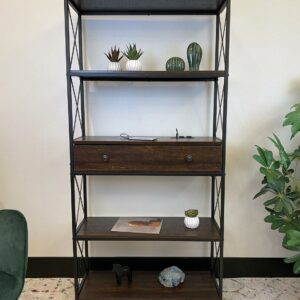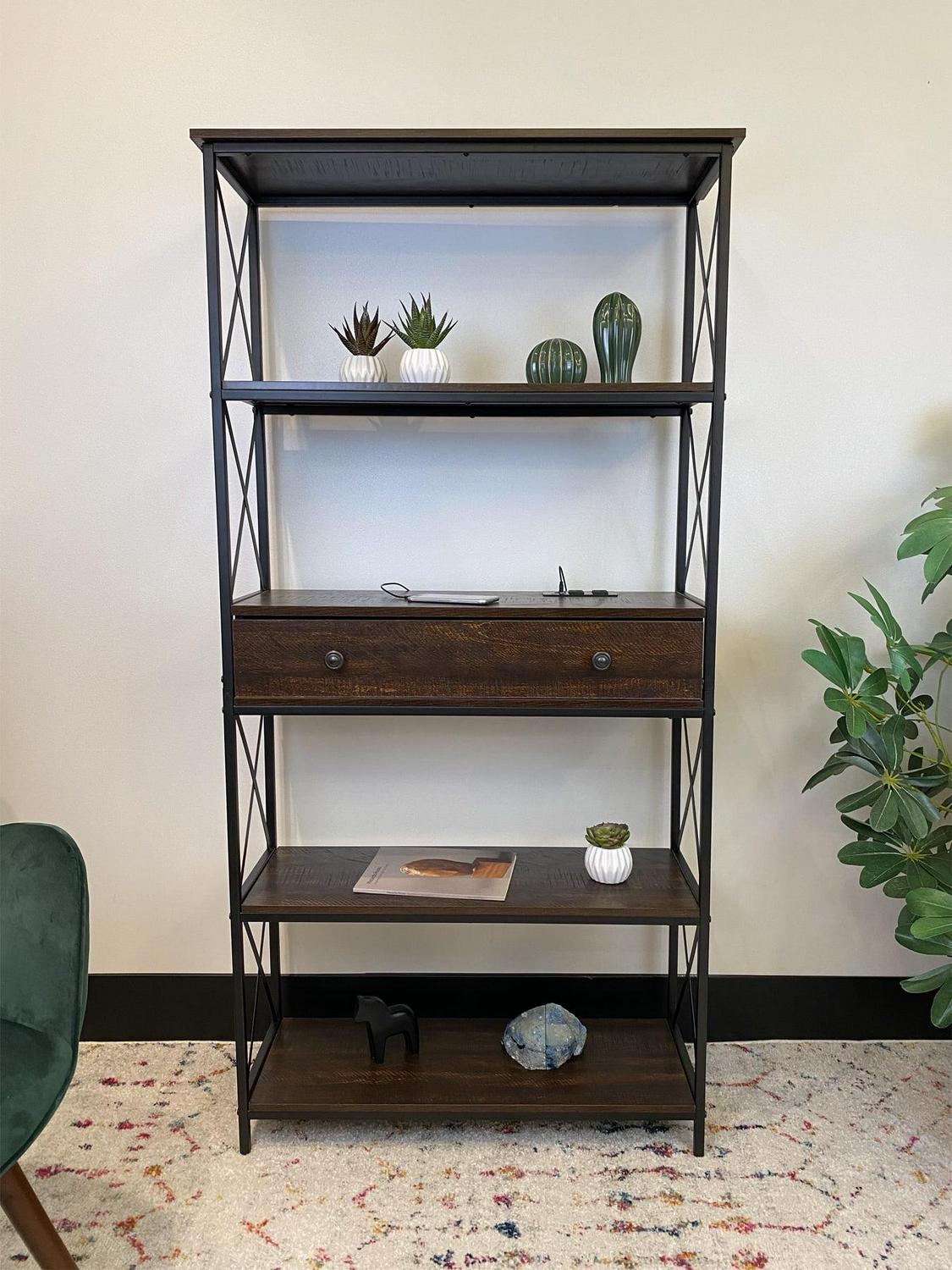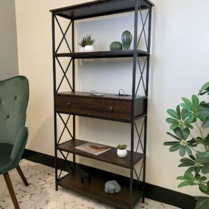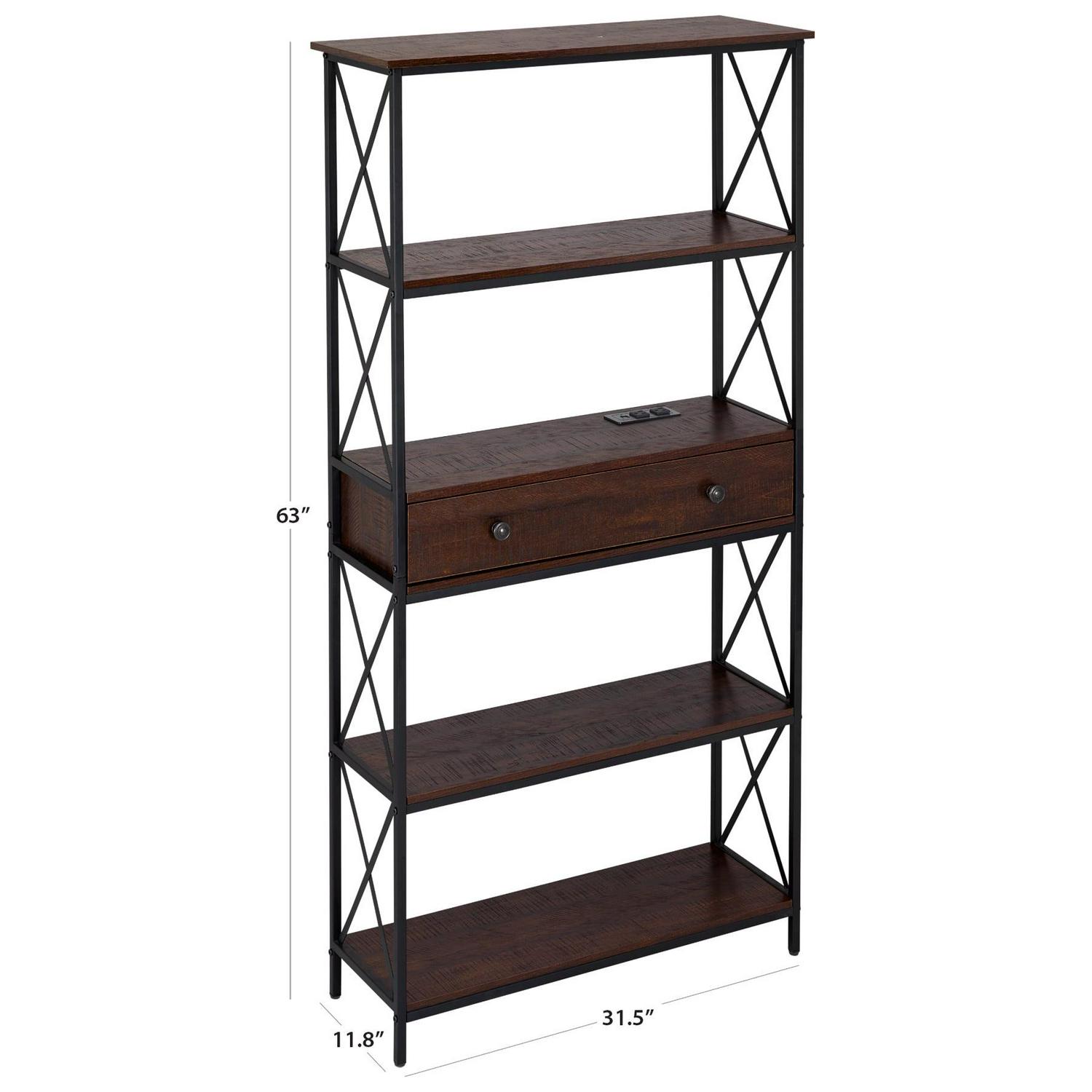 Demand more from your furniture and enjoy this traditionally designed bookshelf with a modern twist. This DecorTech bookshelf provides you power from 2 AC power outlets and an additional 2 USB outlets allow you to charge your mobile devices all at once so you never run out of battery power. This multifunctional bookcase has simple industrial styling that can be incorporated into any living room, family room or den setting to pump up your design aesthetics. The product is constructed of a sturdy black metal frame with sleek walnut wood finish shelf and drawers. The 5 open shelves and 1 drawer, provide additional storage and hold are your decorative accents. This offer includes a complete User’s Guide and easy to read Assembly instructions. Anti-tip safety hardware also included.