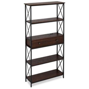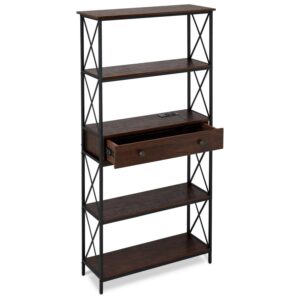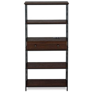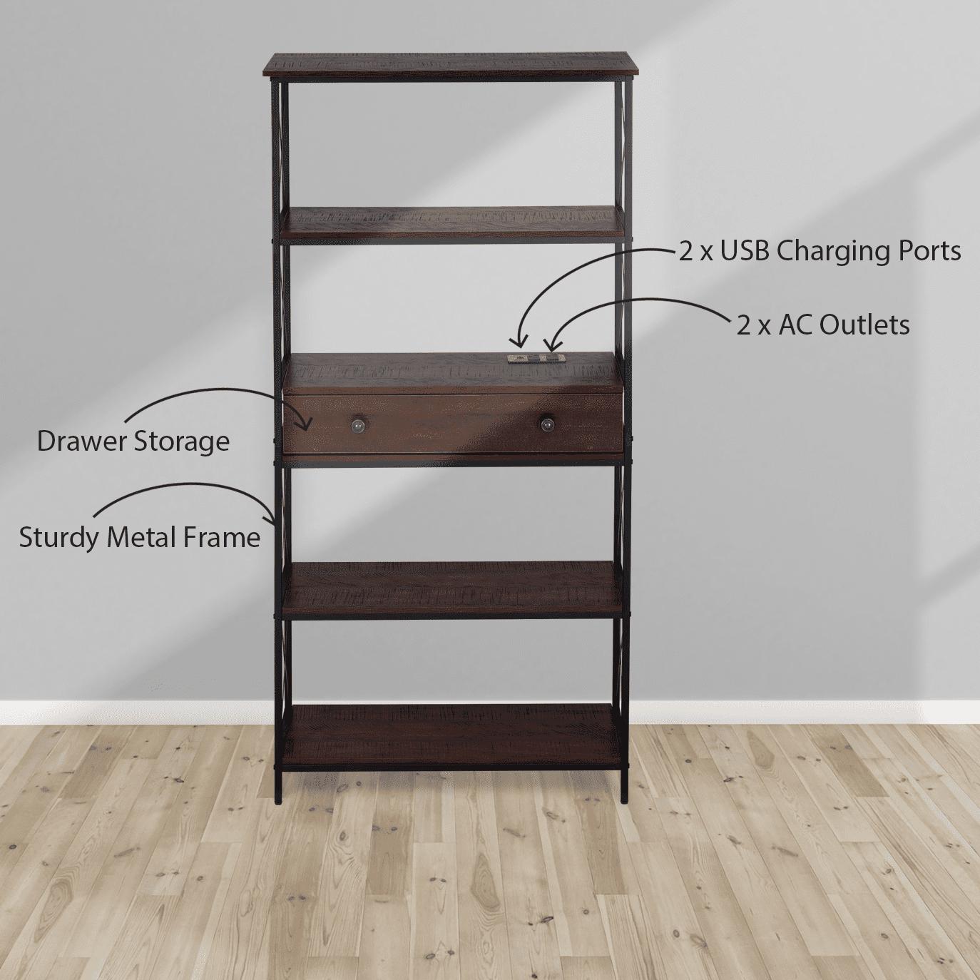 DecorTech 5 Shelf Bookcase with USB, AC Power Outlets and Drawer, Walnut