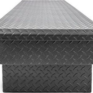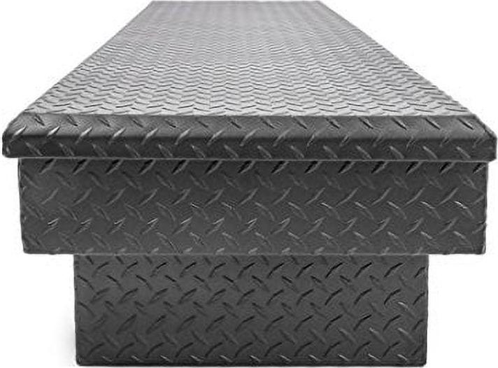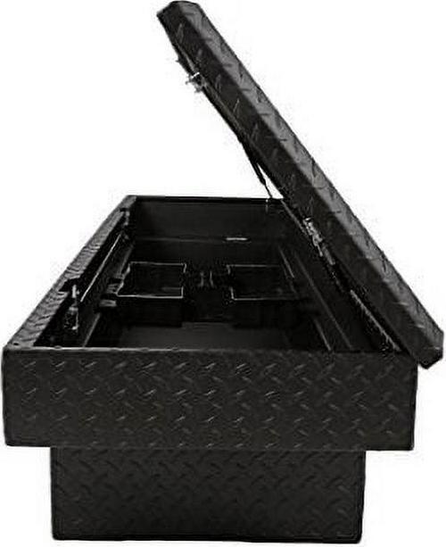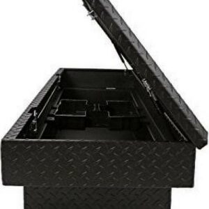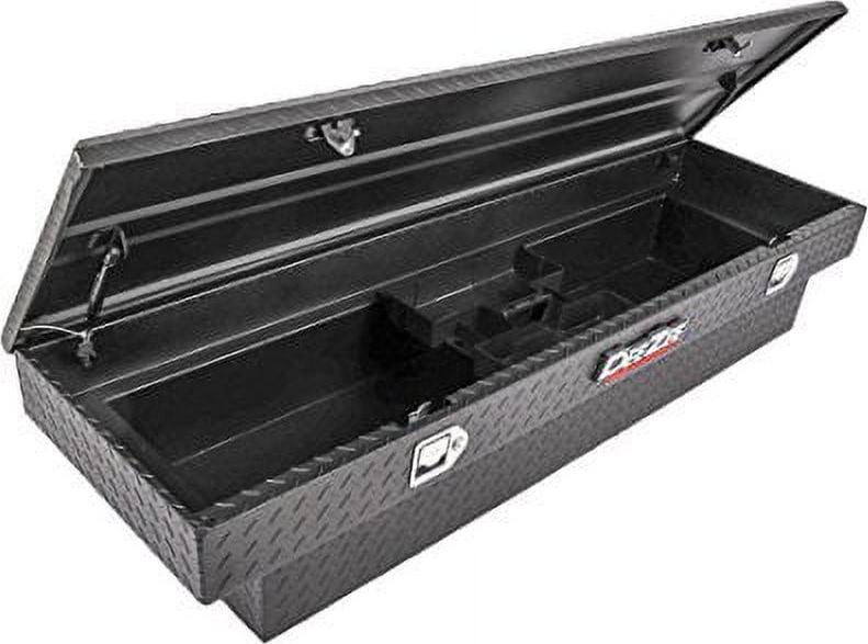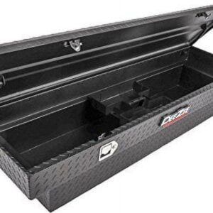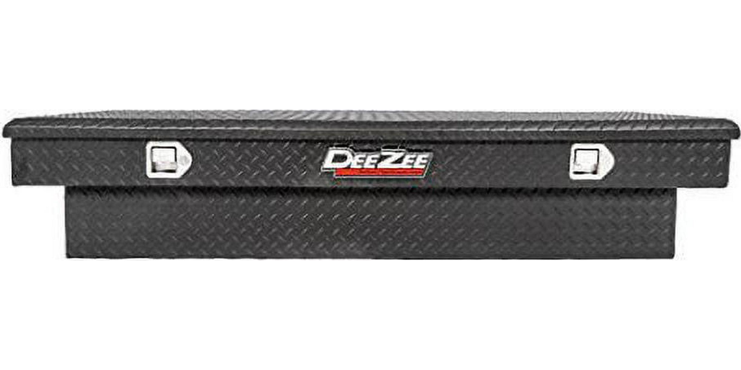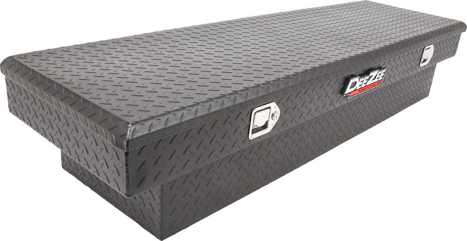 Dee Zee Tool Box – Red Label Single Lid Crossover. Constructed of heavy duty Brite-Tread aluminum with low profile design. Texture black powder coat, provides a matte black finish while it protects and prevents oxidation. Crown style lid with a full pan double-V stiffener for superior rigidity. Other features: lockable stainless steel paddle handles, dampened gas shocks, closed cell foam gasket, and self-adjusting strikers. Removable plastic tool tray to help keep small items organized.