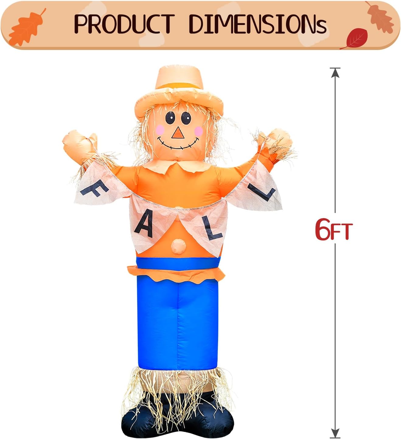[6′ Fall Harvest Scarecrow] This Fall inflatable decoration features an exclusive original design. Holding a harvest flag with a pumpkin at its feet, this blow up decor is perfect not only for celebrating the harvest festival but also for Thanksgiving. It adds a festive ambiance to your yard and its moderate size allows for placement both outdoors and indoors. [ Bright LED Lights ] This HALLOWEEN blow-up decor features built-in bright LED lights that illuminate during holiday nights, creating a festive atmosphere and captivating your neighbors and guests. [ Simply to Use ] Plug in the plug, zip up the zipper, stake it securely into the ground (outdoor use), and pull the ropes. In just a few minutes, it will inflate automatically. The packaging box contains the necessary accessories. [ Size and Package] 6ft ; 4 water bags, 2 ropes, 6 stakes
