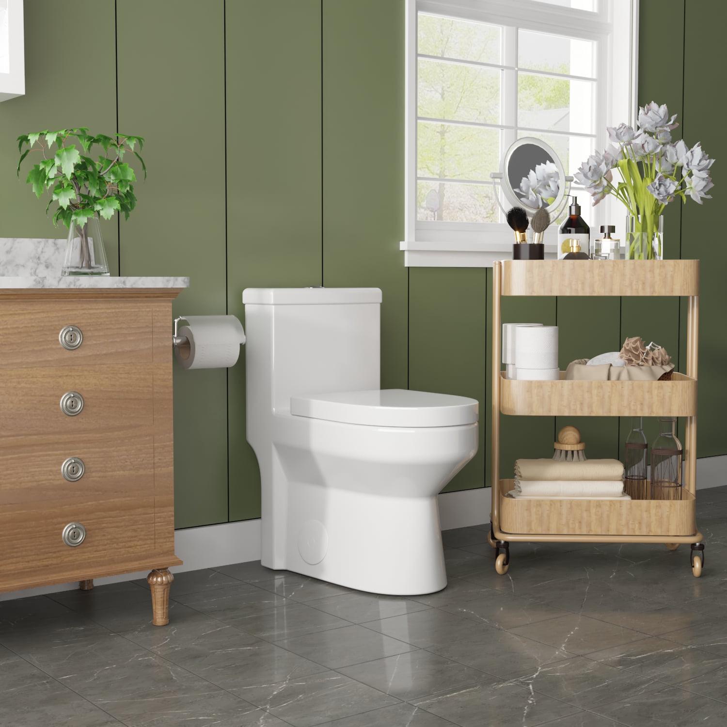 – One-Piece Design Toilet: We love the sleek and modern appearance of one-piece toilets. Seamless one-piece toilet complement the modern bathroom interior. Seamless ceramic one-piece and fully skirted trap way design make cleaning easier.