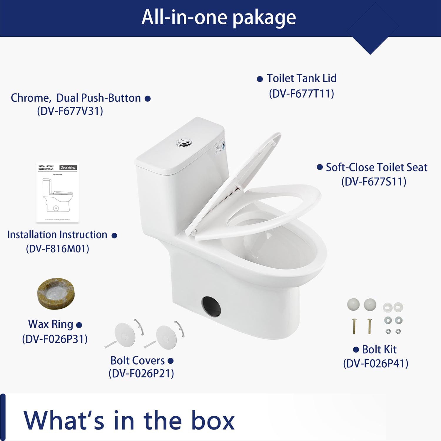 – All-In-One Package. Package includes toilet, pre-installed soft closing toilet seat, pre-installed flush valve, high-quality wax ring, and installation instruction.