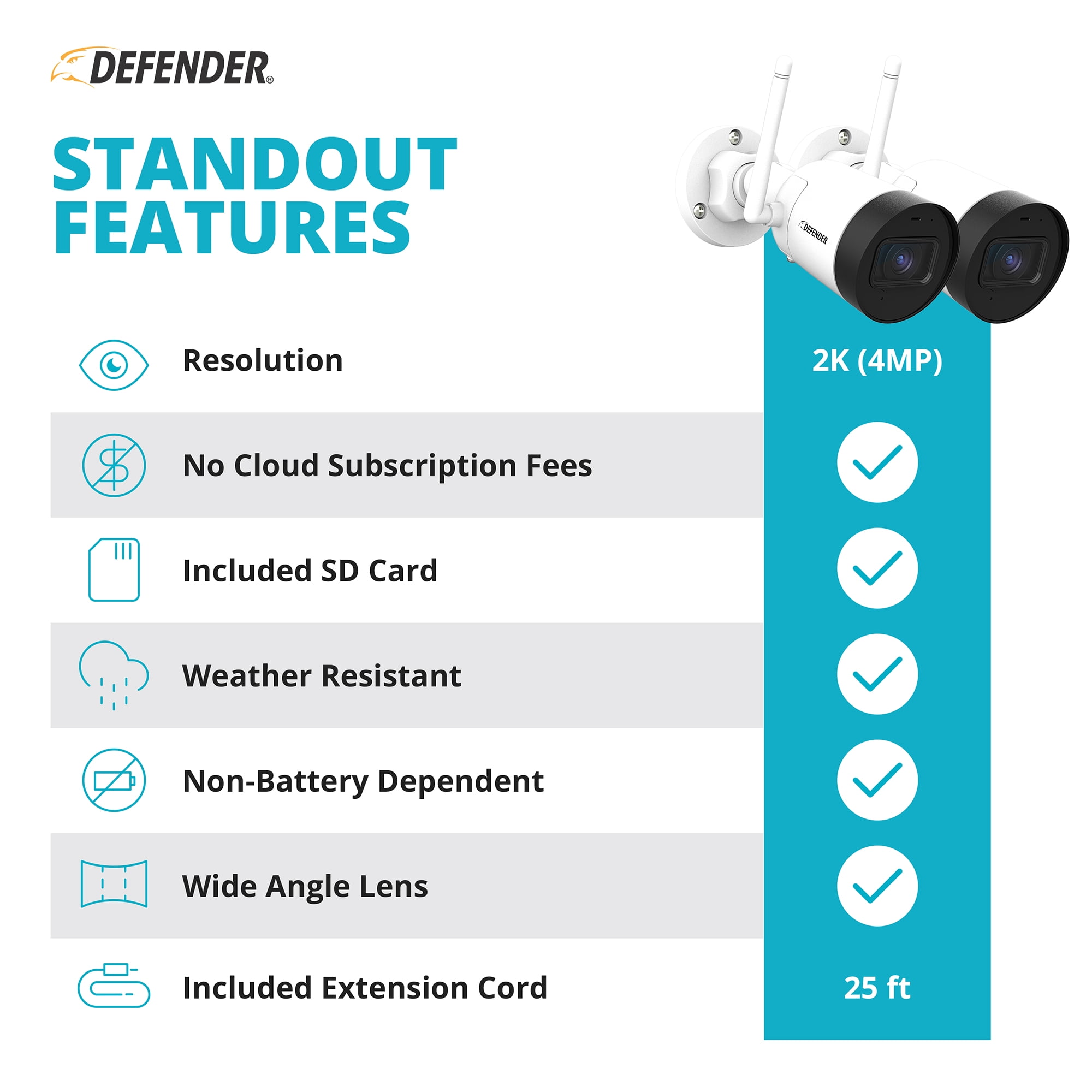 Defender Guard 2K Resolution Wi-Fi. Plug-In Power, Indoor & Outdoor Security Camera with Mobile Viewing, Audio Recording and No Monthly Fees + Free 16 GB SD Card (2-Pack)