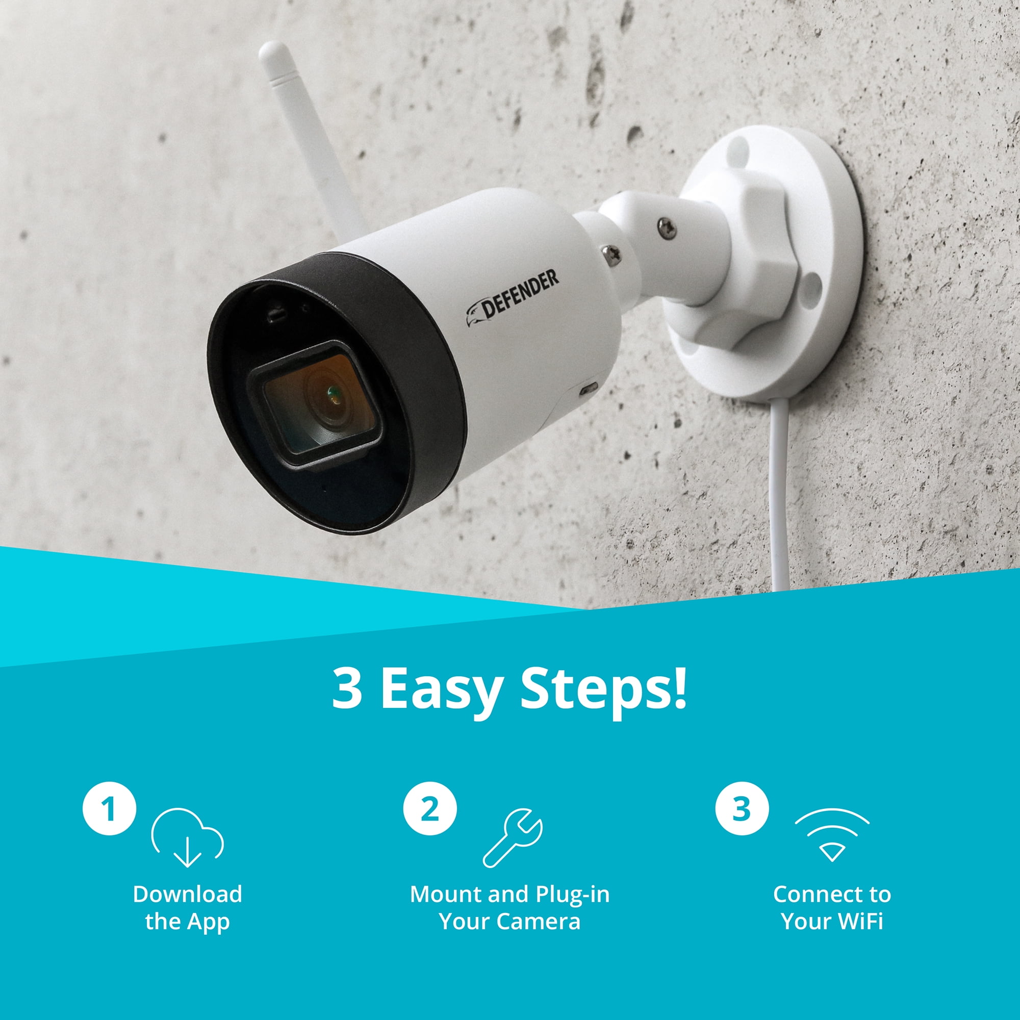 Keep an eye on your home even when you’re away with this Guard Bullet Outdoor 2K(4MP) IP Wireless Security Camera by Defender. With features including double the resolution of an HD camera, remote viewing with instant alerts and audio recording, you can check on everything from deliveries to precipitation. The free Defender 24-7 app gives you instant access to your live feed and recorded footage. A wide angle lens gives you twice the coverage area of most standard cameras. Local recording to the included 16GB SD card (expandable up to 128GB) means your security footage saves directly to the card, so there are no storage or subscription fees.
