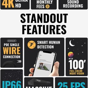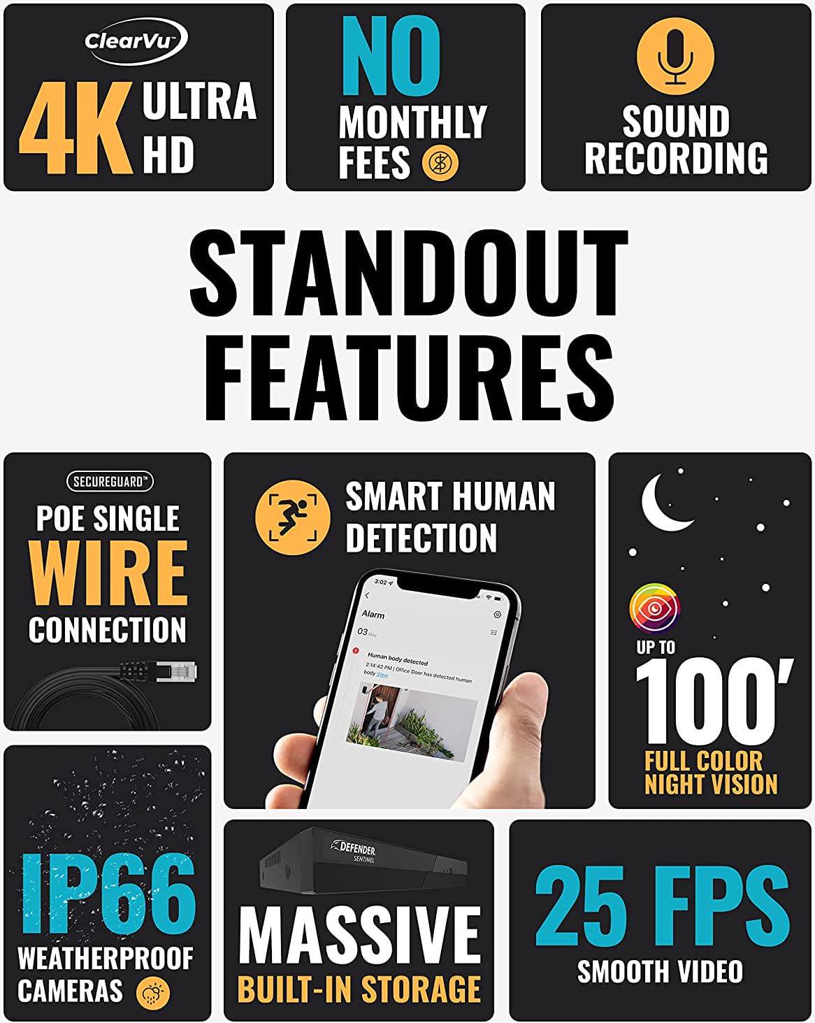Defender Sentinel 4K Ultra HD POE Wired NVR Security System with 8 Cameras, Color Night Vision, Smart Human Detection & Mobile App
