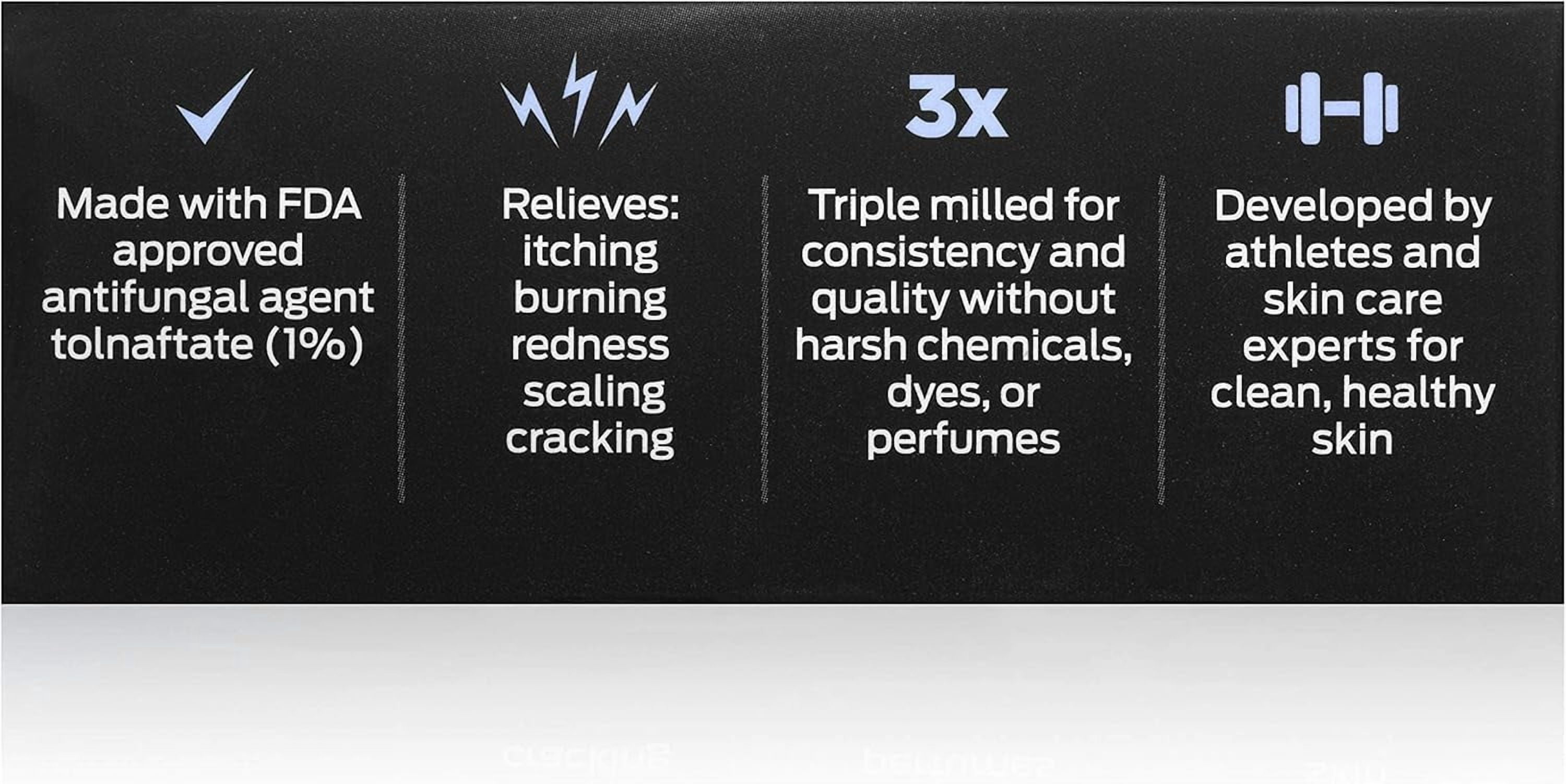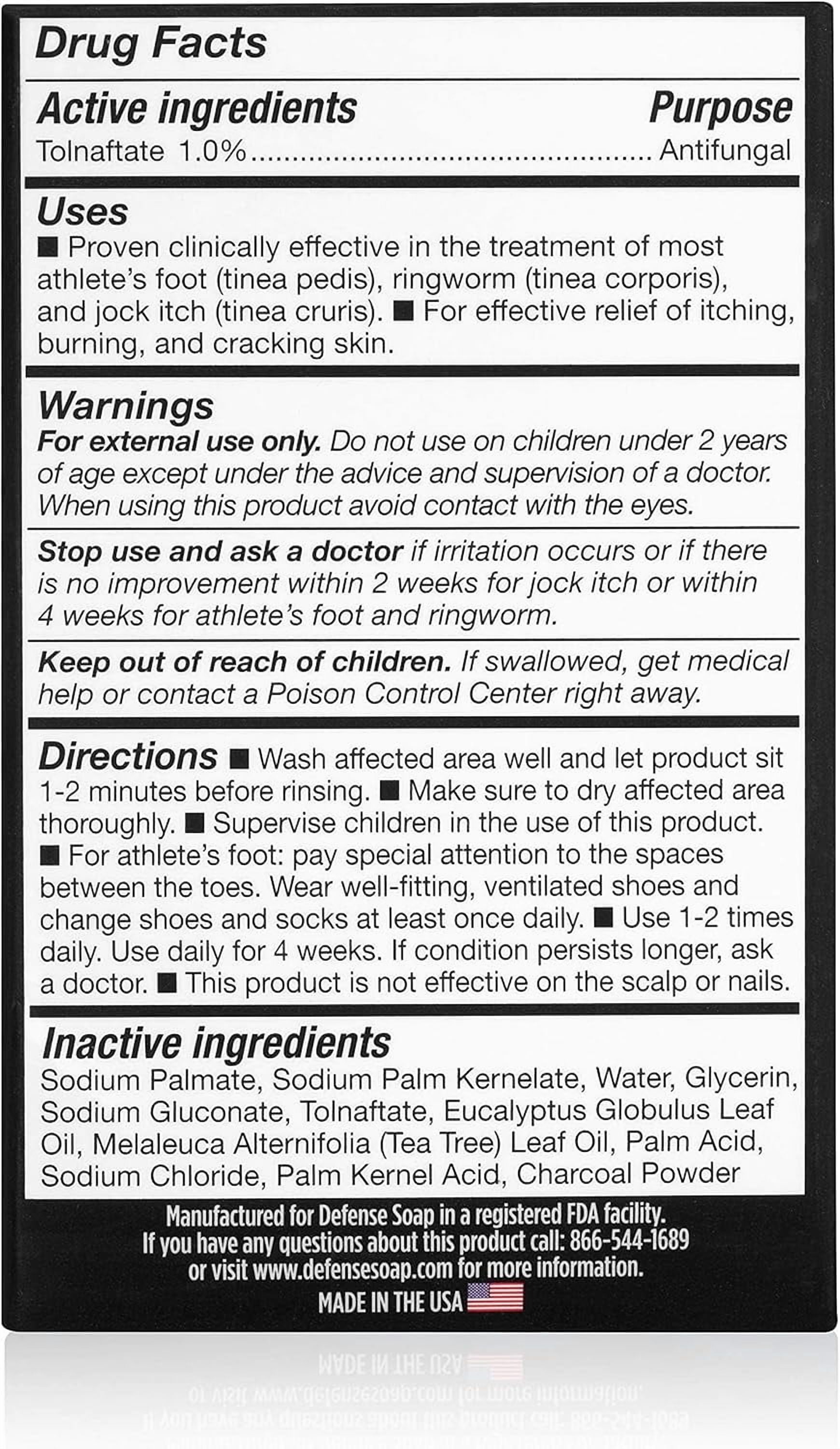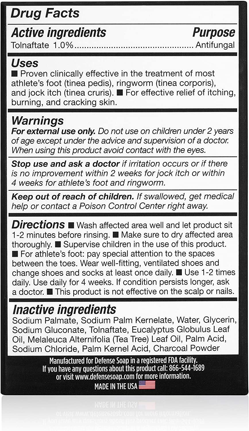 Tough on fungus: Defense Soap antifungal medicated bar soap cleans and treats common locker-room fungal infections such as athlete’s foot, jock itch, and ringworm FDA approved: Defense Soap medicated antifungal bar with tolnaftate is approved by the food and drug administration for its proven effectiveness against athlete’s foot fungus Powerful medicine: The concentrated tolnaftate formula in Defense Soap medicated soap goes right to the infected area and prevents new infections from taking hold of your skin Keeps you in the game: Scaly, cracked feet and skin lesions are unsightly and can even keep you out of the competitor’s ring. Stay clean and healthy by washing with Defense Soap antifungal medicated bar soap Convenient safety case: Each bar comes with a snap-tight case to keep the powerful medicine away from common soaps or toiletries in your gym bag