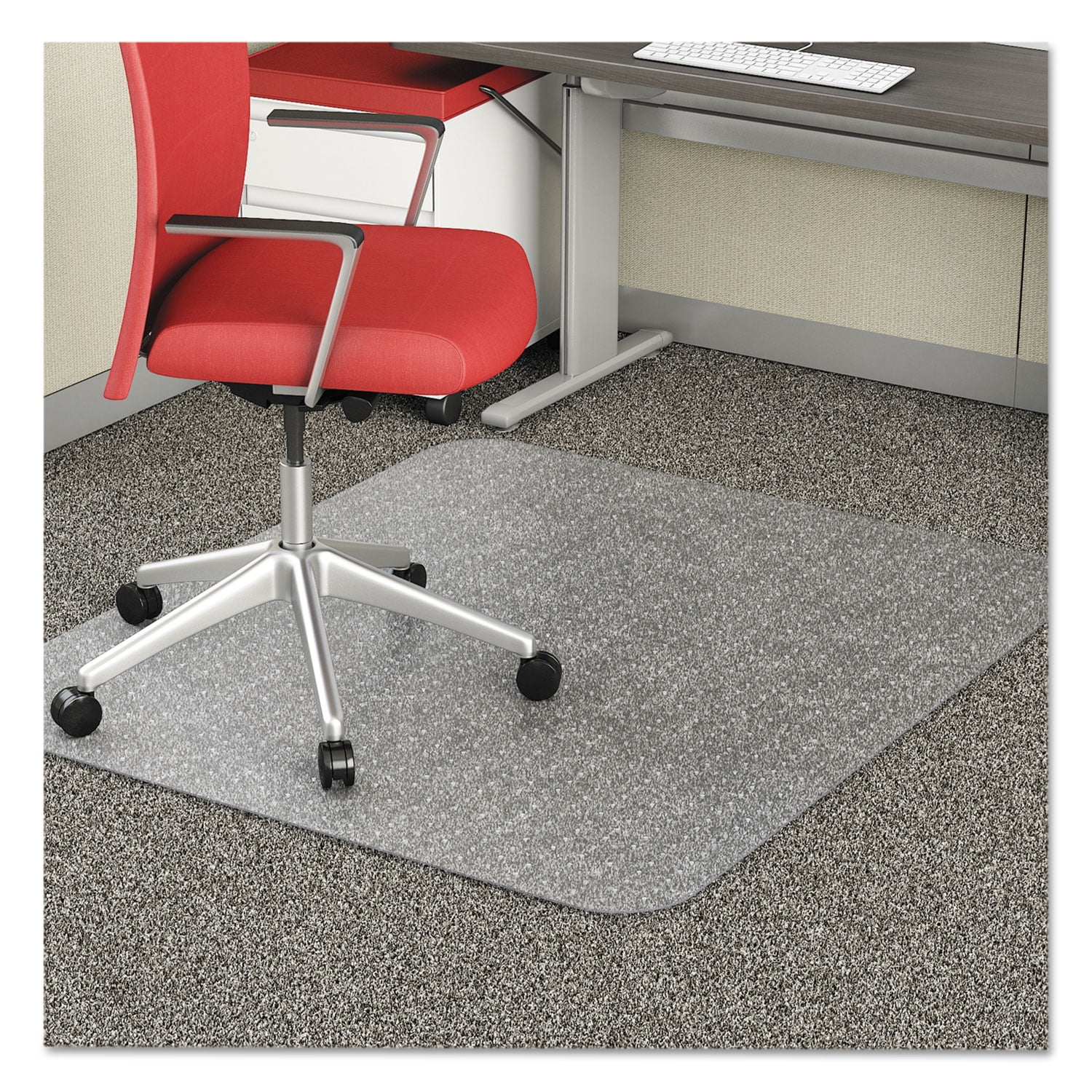 Thinner, lightweight deflecto EconoMat® delivers a great value to anyone looking for an occasional-use office chair mat to protect low pile and commercial carpets up to 1/4″ thick. Easy-glide rolling surface provides smooth office chair movement to help minimize stress and strain on users back, legs and feet. Studded design grips carpet and keeps the chair mat from moving while protecting floors from caster wear, spills and heavy traffic. Free and Clear® non-orthophthalate, non-cadmium formula promotes a healthy work environment while offering exceptional clarity without harsh chemicals. Flat Packed. Mat Type: Chair Mat; Application: Carpeted Floors; Width: 46″; Length: 60″.