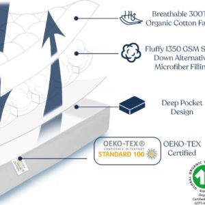 – ORGANIC COTTON SHELL AND SOFT DOWN ALTERNATIVE FILL: Shell Made of GOTS Certified 100% Organic Cotton. Box Quilted with Plush 1350 gsm Snow Down Alternative fill. Overfilled for perfect support and softness. Baffle Box Construction ensures even fill. This combination of Organic Cotton and Down Alt fill creates optimal sleep temperature.