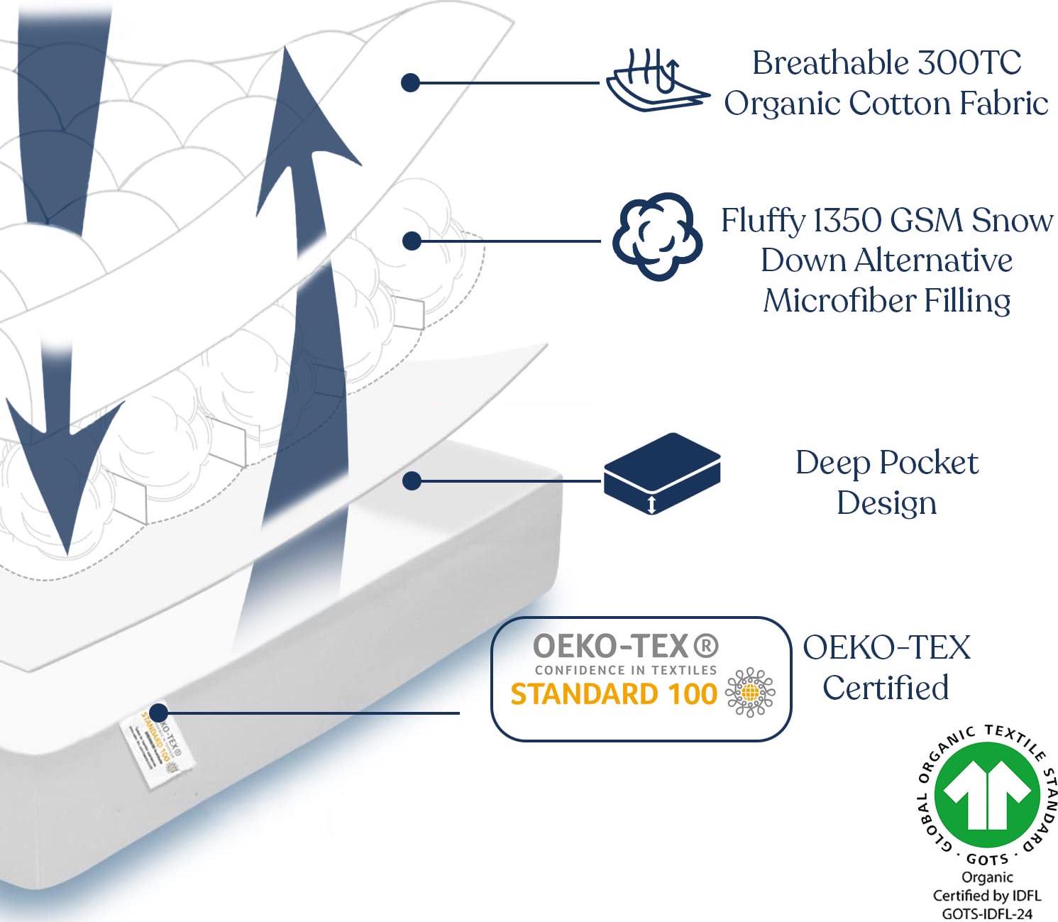 – FLUFFY & SOFT MATTRESS PAD: GOTS Certified Organic Cotton top layer and the new designed Plush 1350 GSM Snow Down Alternative provide softness and extra resilience, that giving you cosy feel and most relaxing sleep.