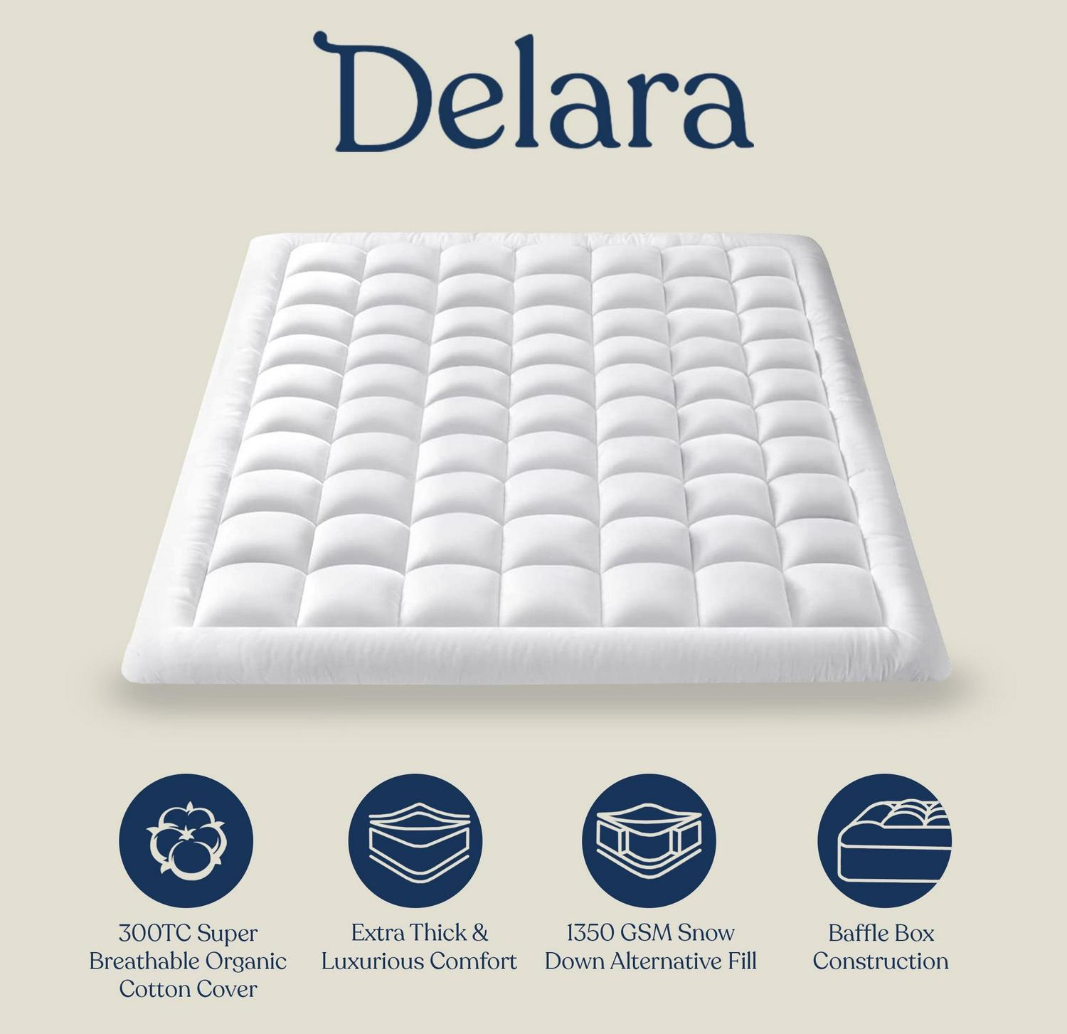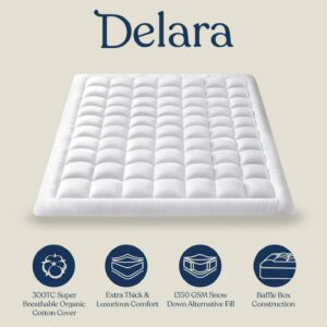 Delara 100% Organic Cotton Mattress Pad, GOTS Certified Organic Cotton Shell, 1350 GSM Snow Down Alternative Fill, 20 Deep Pocket, Fits All Mattress Sizes, Plush Ultra Soft Fluffy Mattress Pad