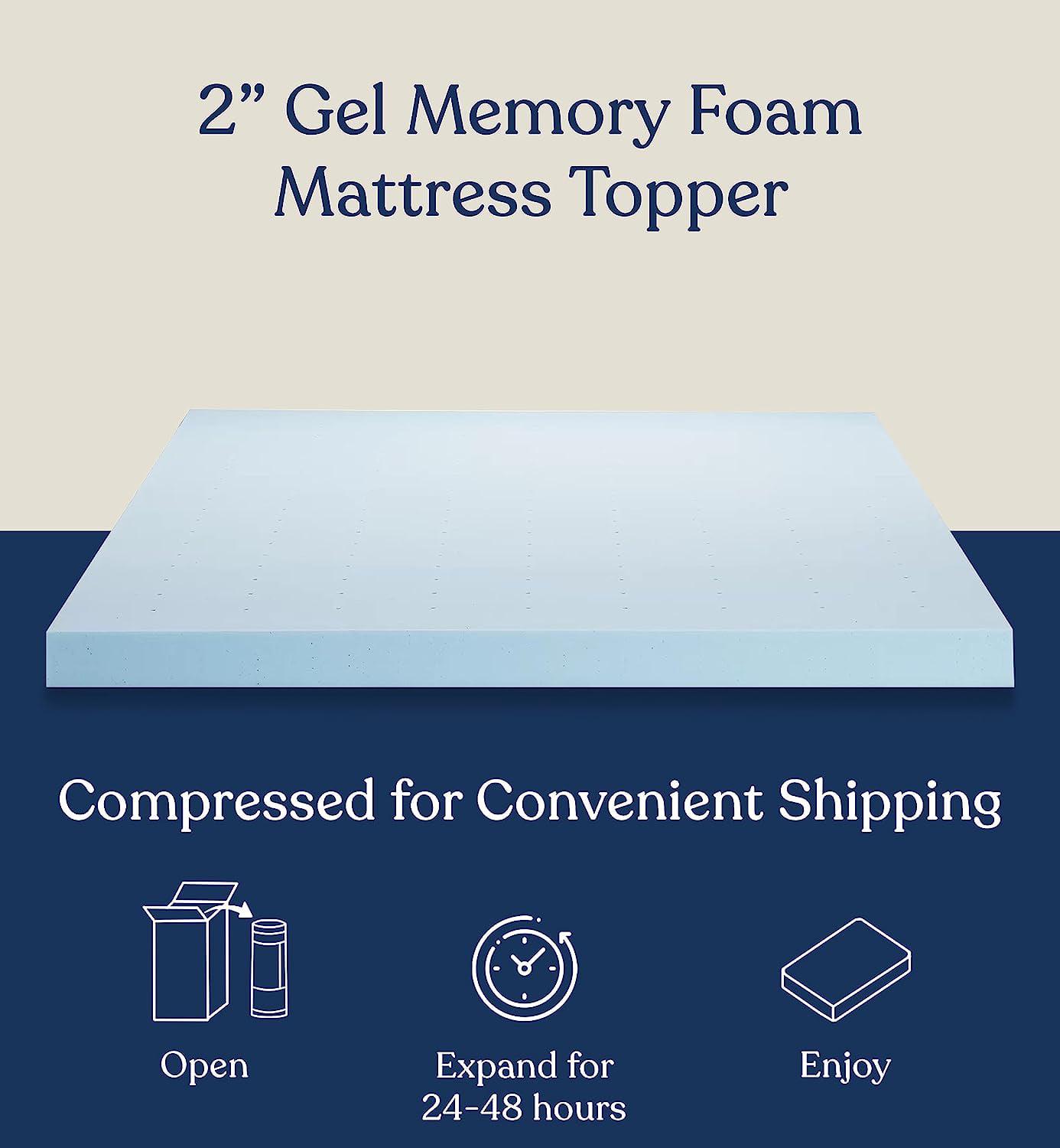 – GEL INFUSION MEMORY FOAM: Foam mattress topper is two inches of soft responsive memory foam, an easy way to help make a firm mattress soft. The memory foam is infused with gel to help regulate temperature and dissipate heat for a comfortable sleep climate.