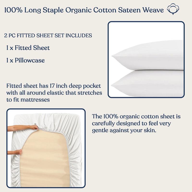 – TWIN 2-PIECE FITTED SHEET SET – This Organic Cotton FITTED SHEET SET includes 1 Fitted Sheet(39 x75 +16 Deep Pocket) with all around fully elasticized, 1 Standard pillowcase(21 x32 ) with envelope closure and to reduce plastic, this product comes in a reusable organic cotton bag.