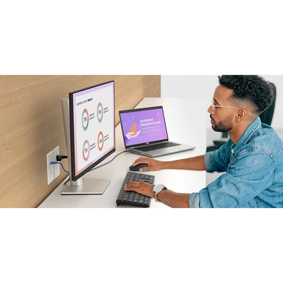 A better view from anywhere | Comfort without sacrificing color: Optimize eye comfort with ComfortViewPlus, an always-on, built-in screen that reduces potentially harmful blue light emissions while delivering excellent color accuracy. Color consistency comes standard: See consistent, vibrant colors across a wide viewing angle enabled by In-Plane Switching (IPS) technology. With 99% sRGB coverage, you get precise colors right out of the box.Sleek, stylish and organized: Hide cords in the monitor riser to keep things organized. This sleek monitor has a three-sided ultrathin bezel, small base and an improved, easy-to use cable management system.Comfort is key: Tilt, swivel, pivot and adjust the height of your monitor (150mm height adjustment range) for extra comfort during work.Designed with you in mind: Navigate the menu and adjust screen settings with the easy-to-use joystick control. Snap on the optional Dell Slim Soundbar (SB521A) and elevate your listening experience. Connect to productivity | A productivity hub: Transform your monitor into a productivity hub with RJ45 for wired Ethernet connectivity and USB-C providing up to 65W power delivery – all in a clutter-free setup. Enhanced manageability: MAC Address pass-through, PXE Boot and Wake-on-LAN are conveniently built in.Single-cable convenience: Reduce cable clutter with USB-C connectivity, which offers the flexibility of connecting to multi-vendor USB-C systemsi and saves up to 72% of workspace setup time, reduces cable clutter and enables quick transitions from the desk.Jumpstart productivity: Simply press the monitor power button and the power sync feature seamlessly starts your monitor and connected Dell PC, even when the laptop lid is closed. Compatible with select Dell PCs.Extensive connectivity: Easily connect to a variety of devices with extensive connectivity ports, including HDMI, DisplayPort, DisplayPort (Out), USB-C, RJ45, 4x SuperSpeed USB 5Gbps.Quick-access ports: Easily share and deliver content via quick-access ports conveniently placed at the front of the display.Expand your efficiency: Boost productivity by up to 39%i by expanding your desk with a keyboard, mouse and connecting dual productivity hub monitors via Dell Express Daisy Chaining – a feature that allows automatic detection of the second display, skipping the manual step of changing OSD settings. Boost your efficiency even further with the multitasking tools of Dell Easy Arrange. Dell P2422HE 23.8″ Full HD WLED LCD Monitor – 16:9 – Black, Silver, Black, Silver