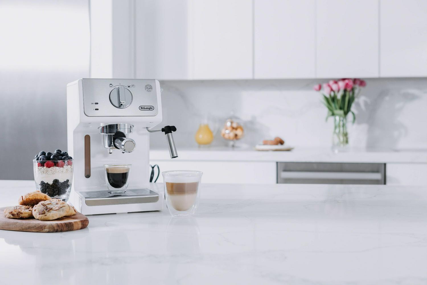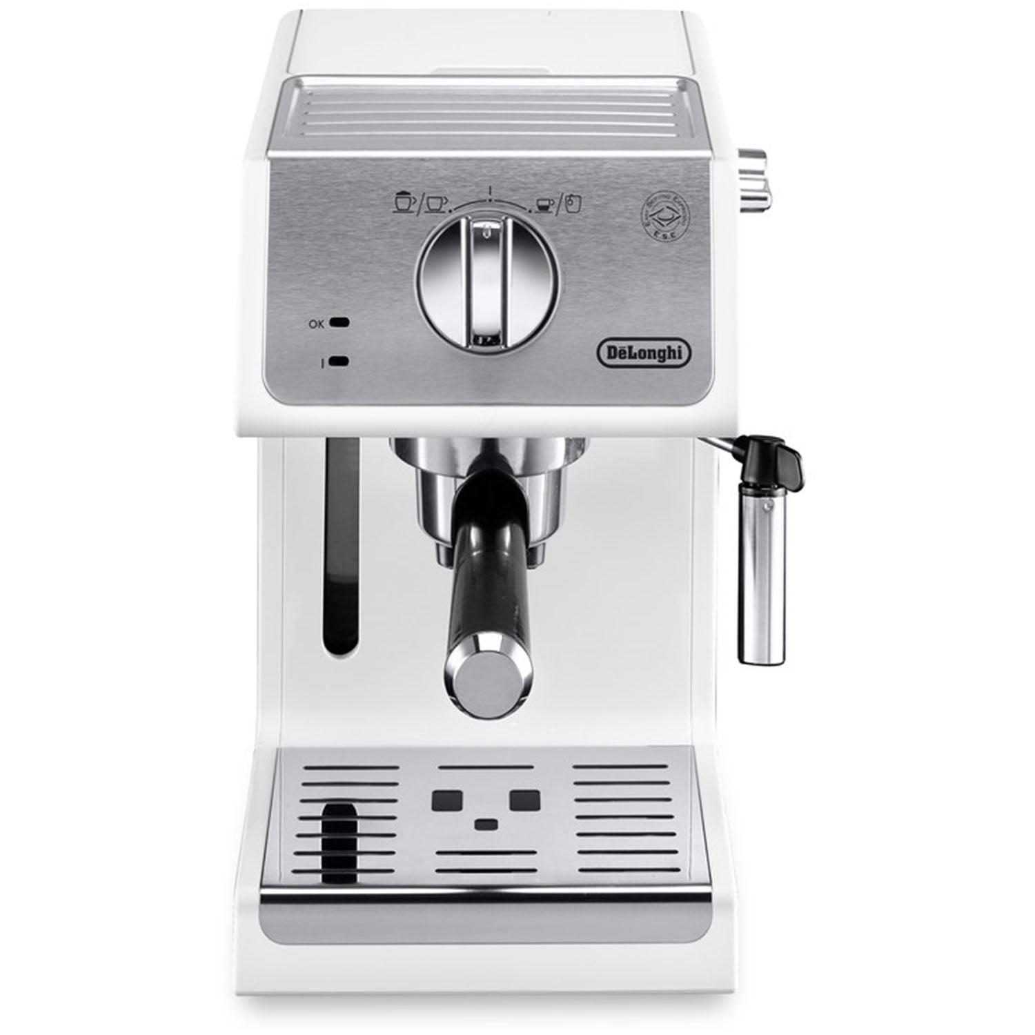 The De’Longhi ECP3220W 15-Bar Pump Espresso and Cappuccino Machine brews authentic Barista quality beverages just like you enjoy at your favorite coffee house. Professional 15-bar pressure and THE self-priming operation assures quality results every time with minimum start-up preparation. Two thermostats for water and steam pressure are controlled separately ensuring you can make both espresso and cappuccino at the perfect temperature. De’Longhi’s advanced cappuccino system mixes and steams milk to create a rich, creamy froth for evenly textured drinks.