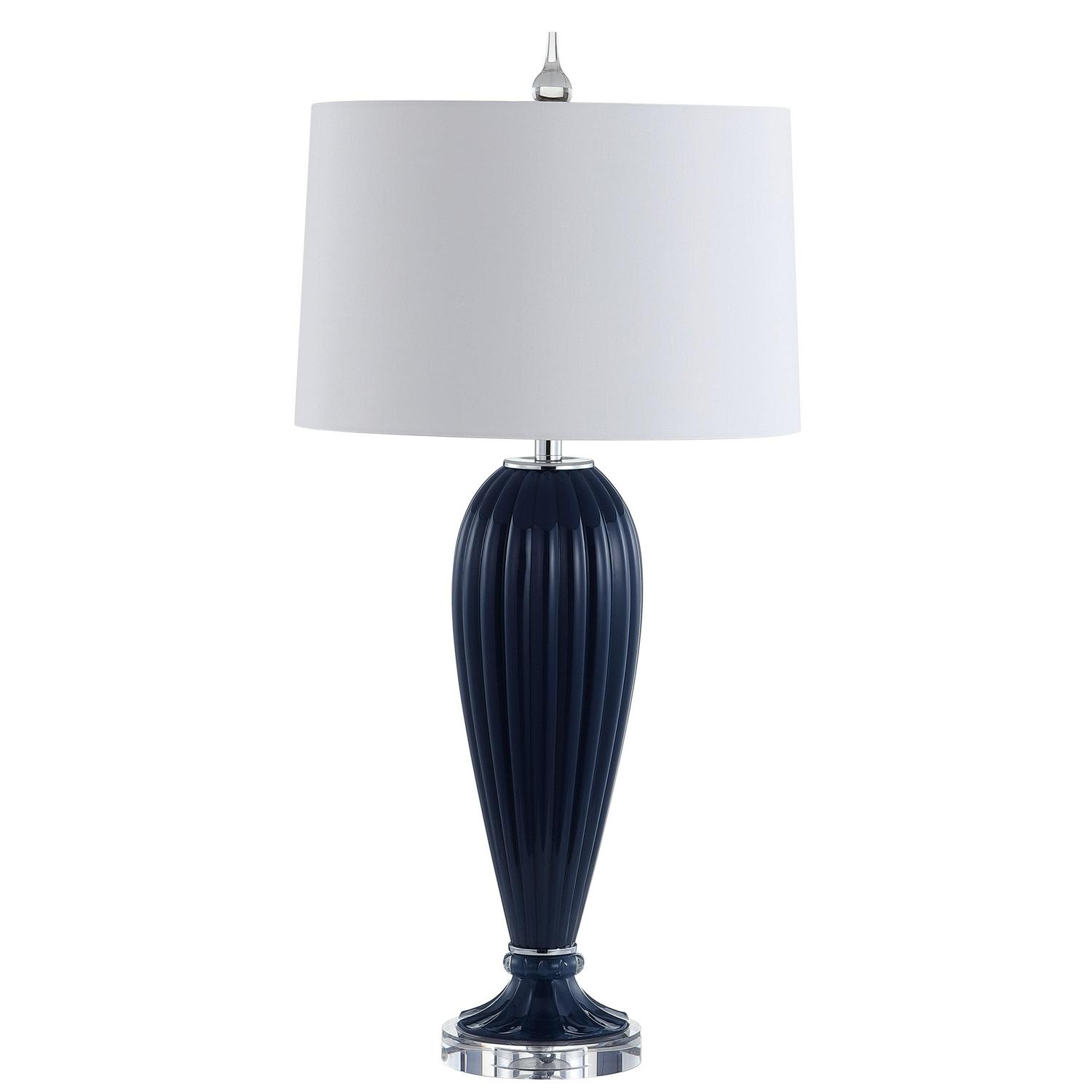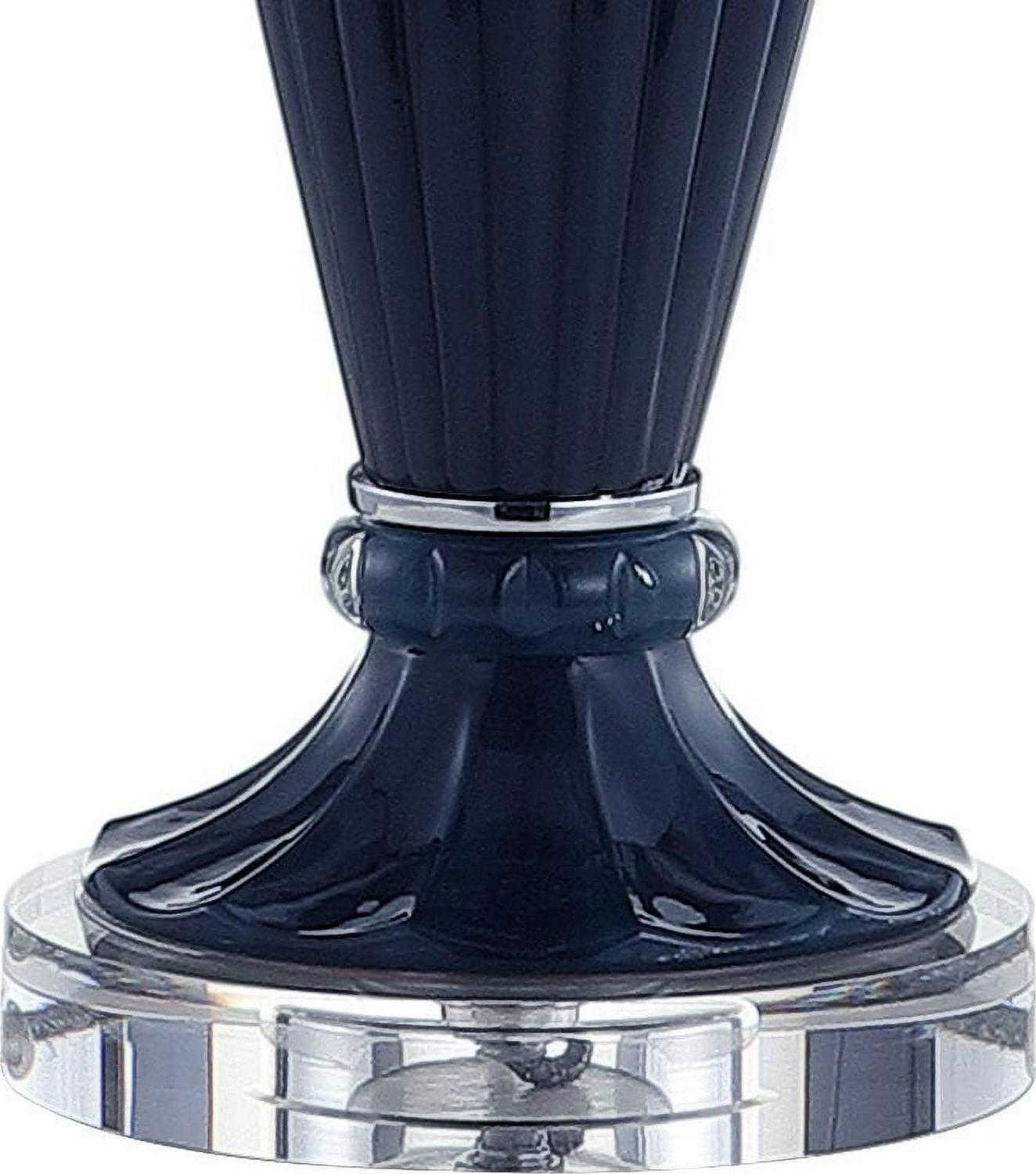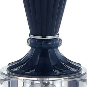This classic ceramic table lamp shows off a penchant for sophistication plus a hint of edgy style. Take in the tasteful ribbed glass construction with a round crystal base, and a chrome finial, harp, and socket that add balance. At 32.5″ tall, it makes a statement with size while remaining understated in color — a classic navy.