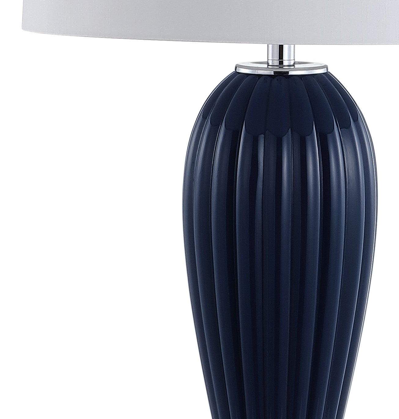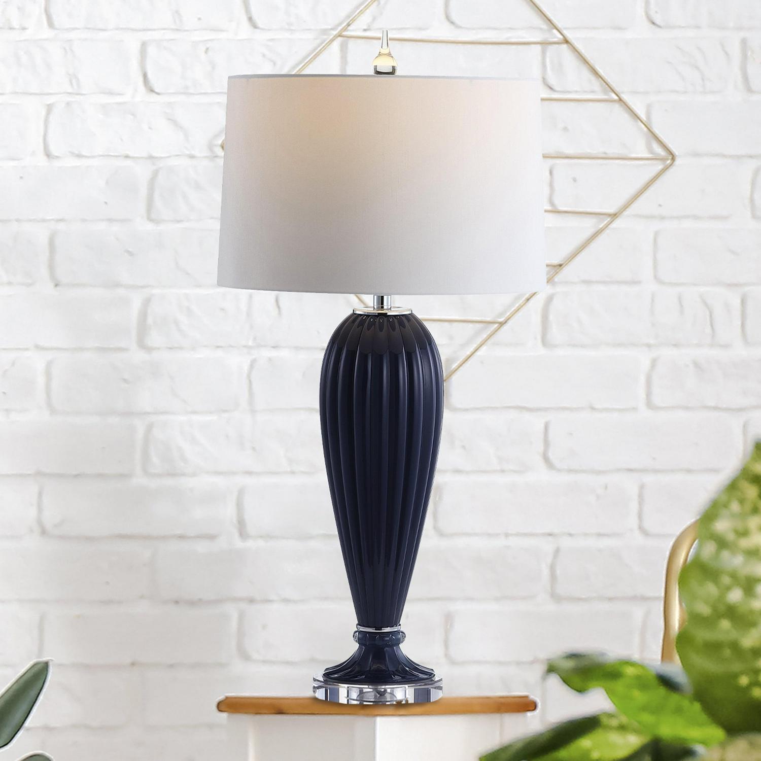 - Bring a sophisticated yet artistic element to your decor with this navy ribbed glass table lamp