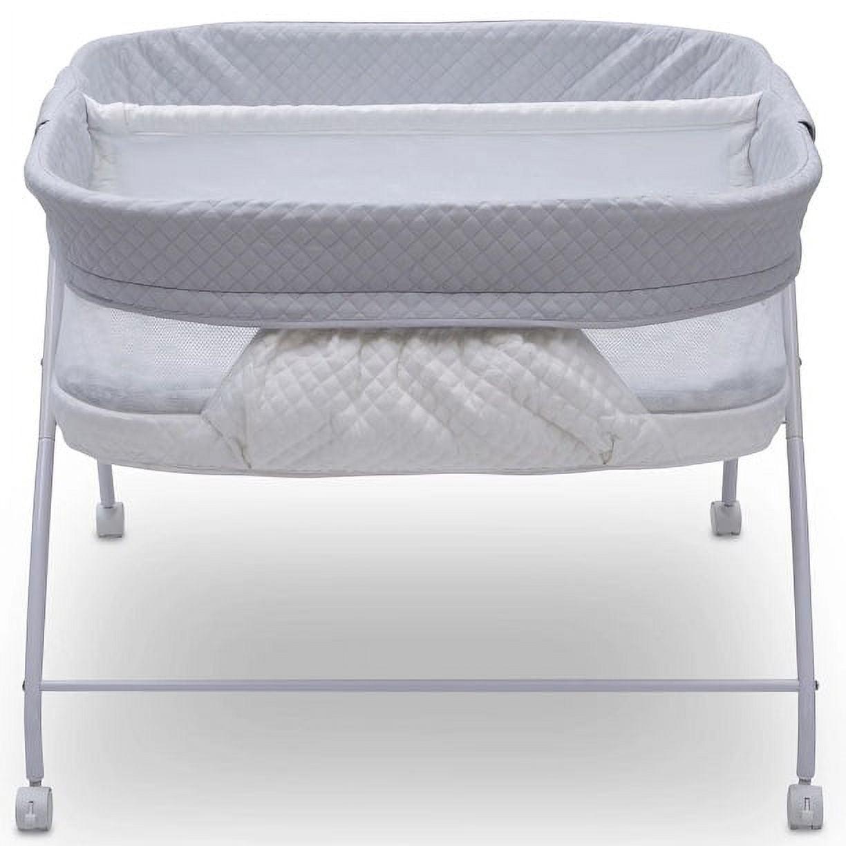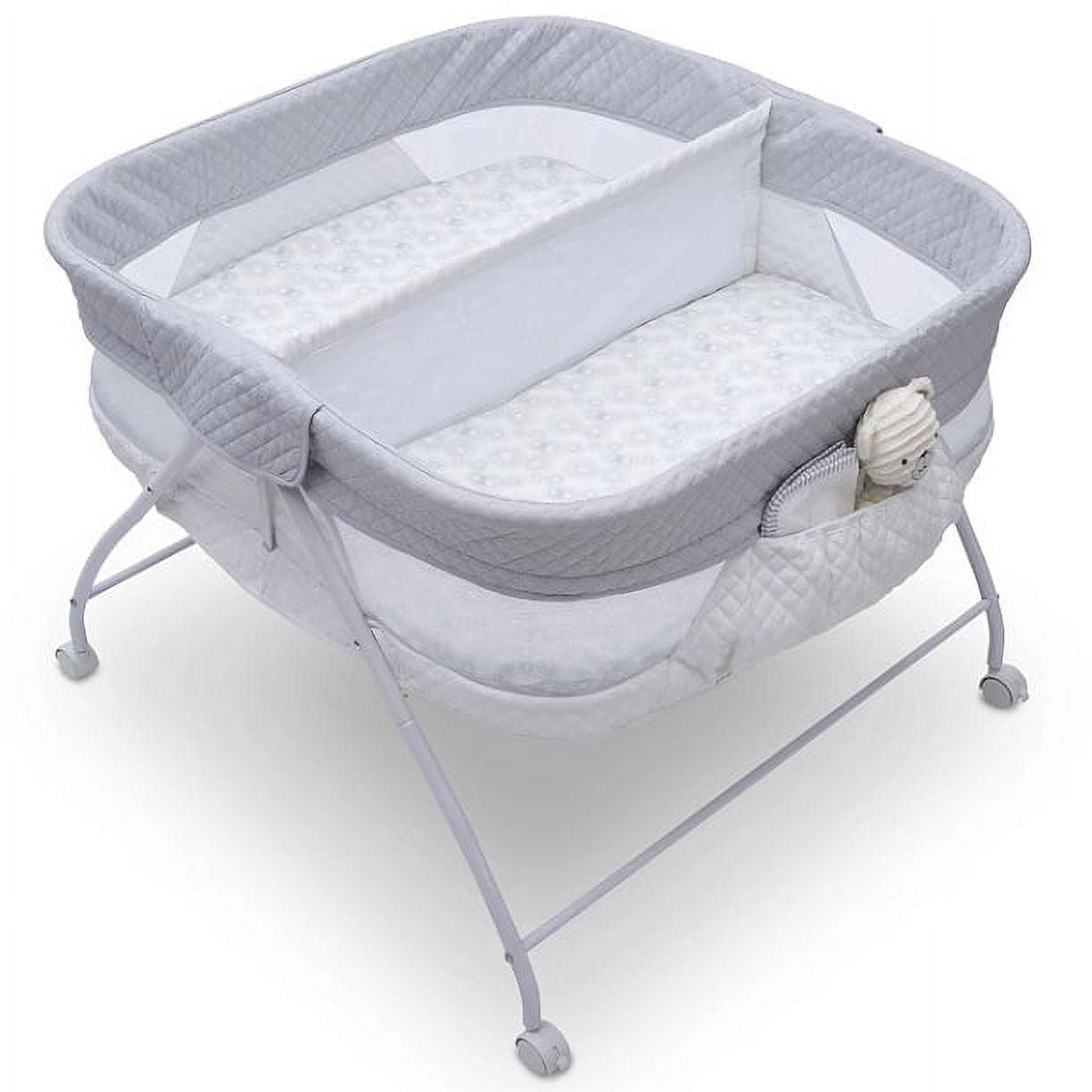 The Little Folks Twin EZ Fold Ultra Compact Bassinet by Delta Children makes naptime or bedtime with your twins easier than ever. Mesh panels on the sides and middle allow for airflow and increased visibility which creates the ideal sleep environment for both you and your babies. For your ease storage pockets on each end provide space for burp clothes small toys or pacifiers while wheels on all four legs allow you to easily rotate the bassinet in order to tend to either baby. And best of all its lightweight design means you can bring it anywhere and everywhere without trouble. Easy to set up and store away, the bassinet requires minimal assembly and folds flat which makes every outing with your babies stress free.