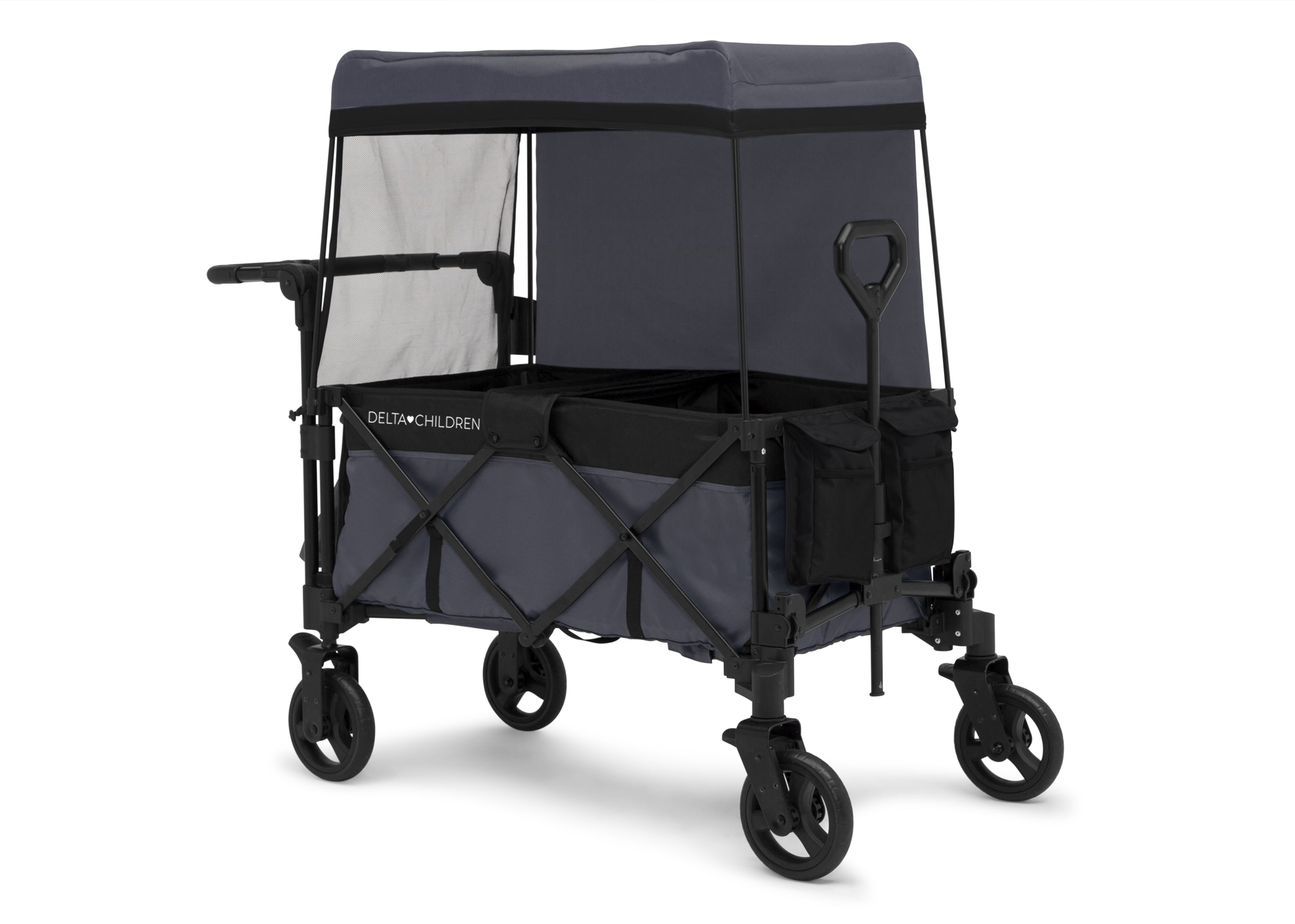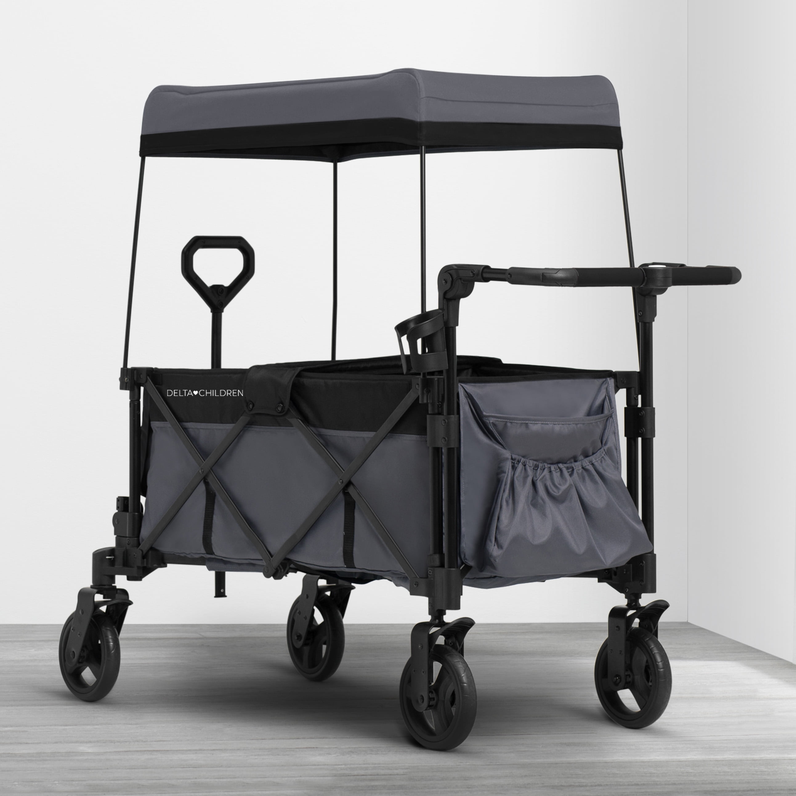 The Adventure Stroller Wagon by Delta Children in Black is specifically designed to grow and flow with your family. Packed with more features than a standard double stroller, this convenient wagon is perfect for indoor or outdoor activities. A comfy option for siblings or friends, this stroller wagon features two cushioned seats with 3-point safety harnesses for security while the removable center console with cup holder and storage pocket allows kids to share snacks, toys and drinks. An additional cup holder for parents and side pockets ensure you can bring everything you need along for the adventure. The removable, UV blocking canopy and roll-down shades offer privacy and protection from the sun or rain. Easy to drive, it features swivel front wheels that allow you to effortlessly turn and pivot, as well as push and pull handles with adjustable heights. The wagon’s compact fold makes it easy to store or transport. And when your children outgrow the need for a wagon, use it to haul your own gear at the farmers market, while gardening or the grocery store. Holds up to 110 lbs. (55 lbs. per seat). Weighs 36.3 lbs. Recommended for ages 9 months up to 55 lbs. Delta Children was founded around the idea of making safe, high-quality children’s furniture affordable for all families. They know there’s nothing more important than safety when it comes to your child’s space. That’s why all Delta Children products are built with long-lasting materials to ensure they stand up to years of jumping and playing. Plus, they are rigorously tested to meet or exceed all industry safety standards.