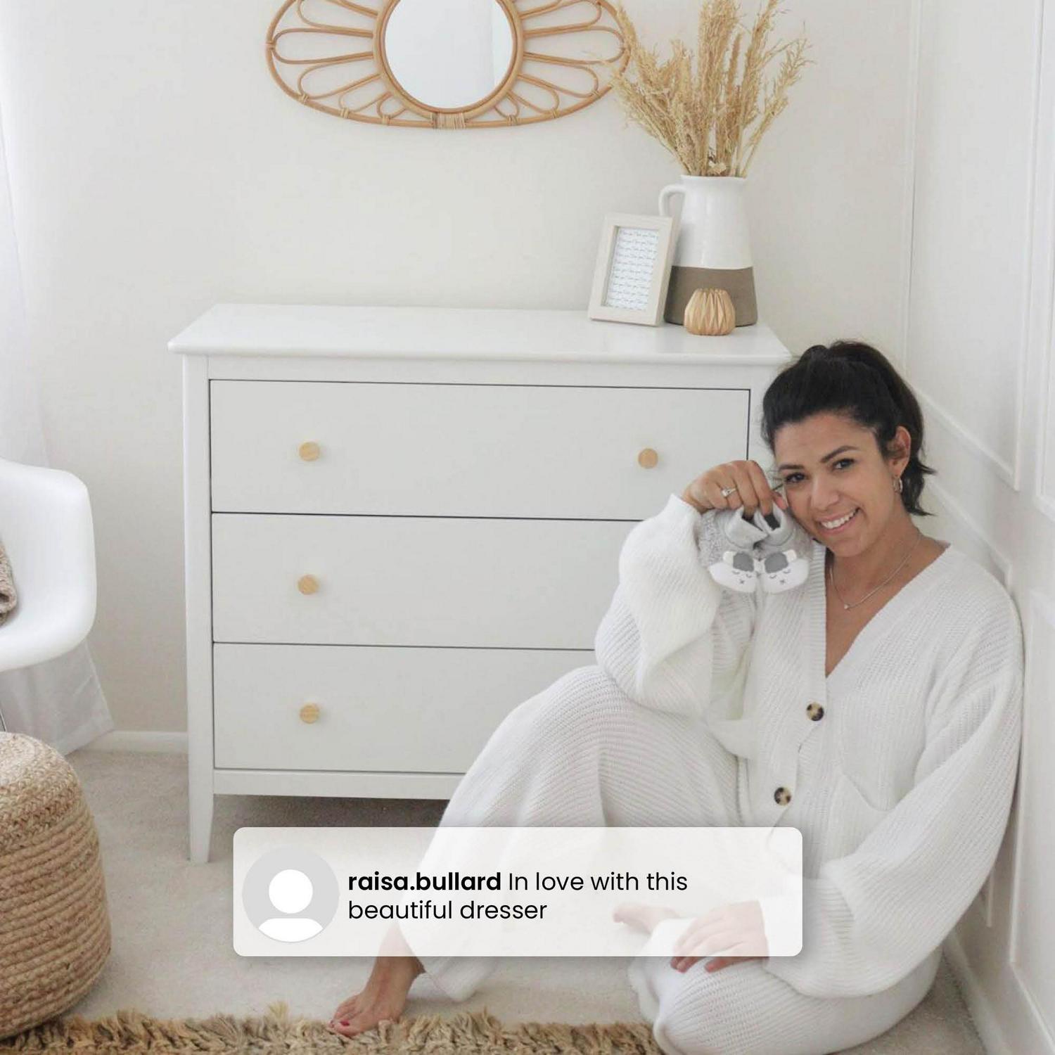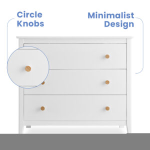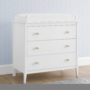 The Casey 3 Drawer Dresser by Delta Children will instantly elevate your nursery with its mid-century modern style. Clean lines, playful round knobs, and tapered legs define this beautiful dresser. This dresser also has a smooth metal glide system with safety stops that prevent drawers from pulling out, so it is easy and safe for kids to manage on their own. Pair this dresser with other pieces in the Casey Collection for a coordinated look, as well as the coordinating Changing Top #W100810 (sold separately) to transform this dresser into a convenient changing table