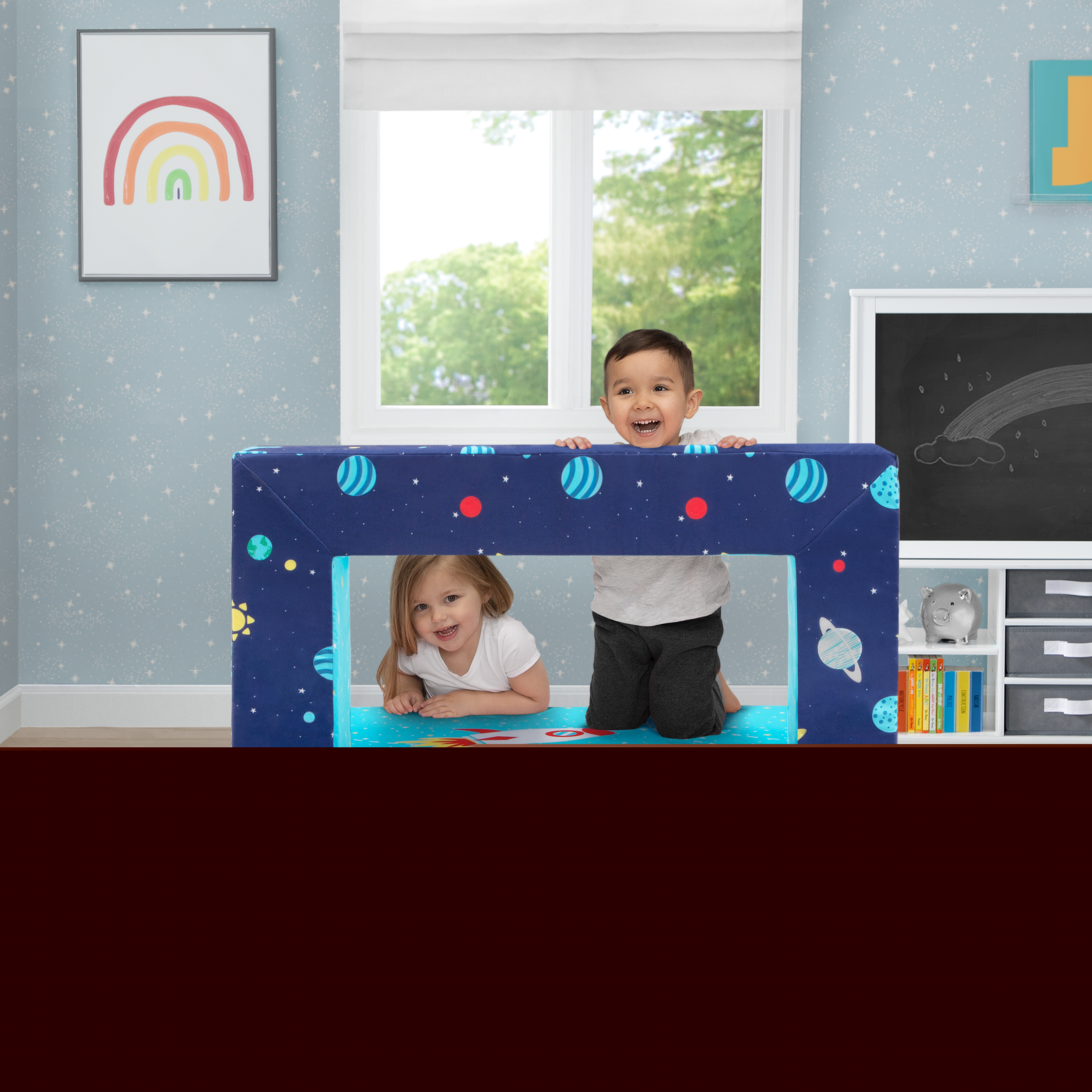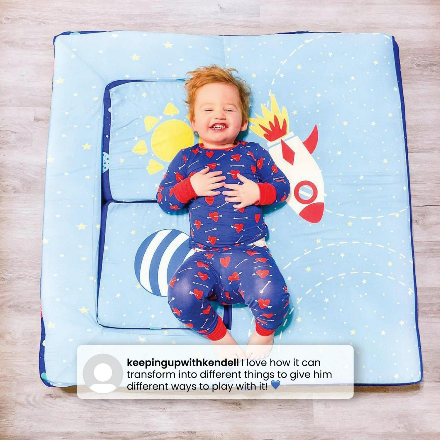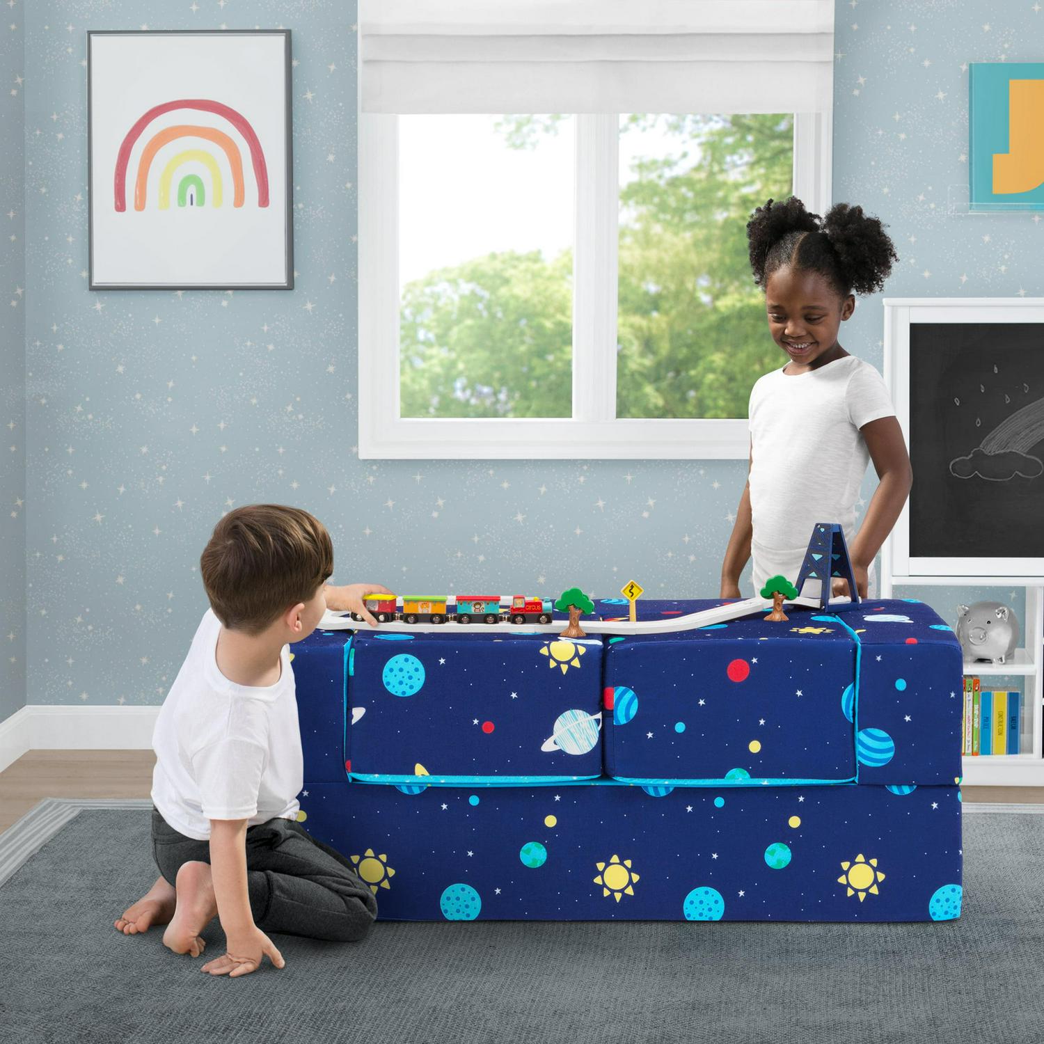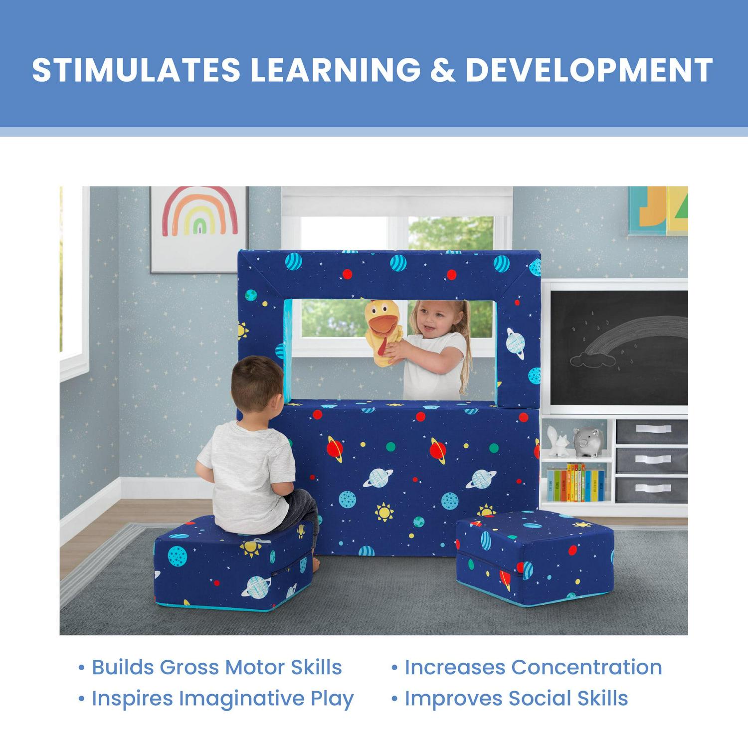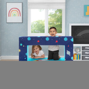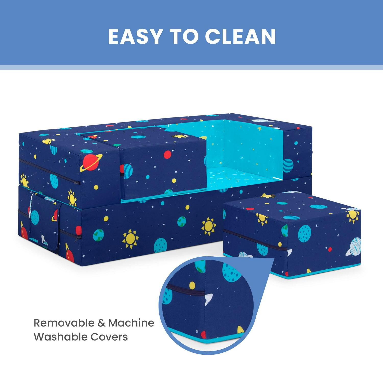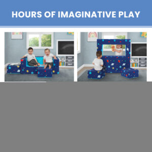 It s a sofa! It s a play mat! It s a fort! The Convertible Foam Sofa and Play Set by Delta Children can be whatever your child imagines. The sofa s convertible design with two included ottomans allows your little one to use it in so many ways. Use it as a sofa to watch TV, flip it open to use as a play mat or move the parts to configure a puppet theater, castle, ball pit or obstacle course. This modular play couch made up of three foam pieces will give kids hours of entertainment and encourage imaginative play while helping improve gross motor skills. The perfect addition to your child s bedroom or playroom, the sofa s sturdy foam base and soft slipcover with a storage pocket and printed with a super-cool outer space pattern is a super-safe play structure. Slipcovers are removable and machine washable. Recommended for ages 18 months and up.