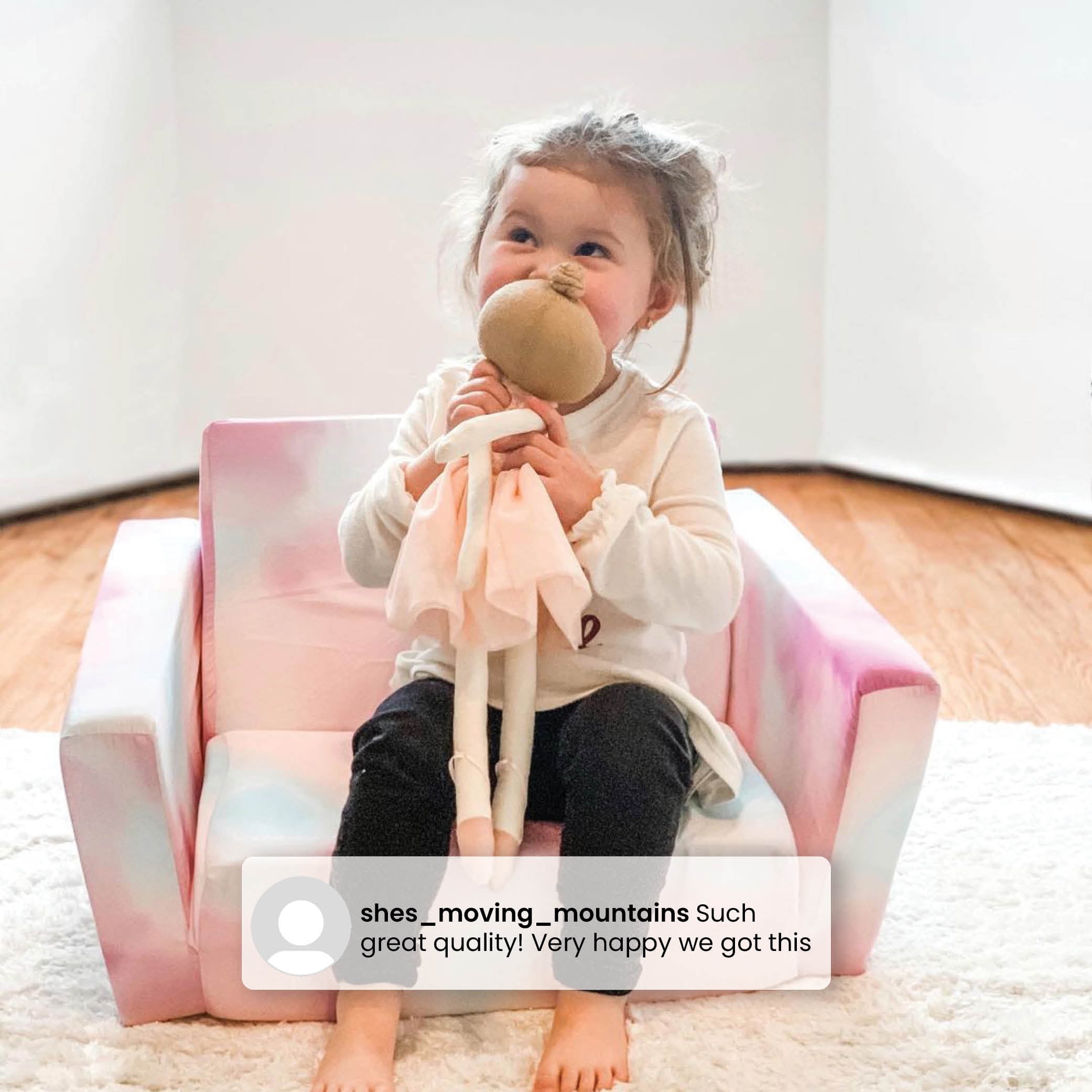 CONVERTIBLE 2-IN-1 DESIGN: This flip-open chair converts to a lounger/sleeper| Ideal for reading, relaxing, playing or sleeping, your child will enjoy this chair with siblings/friends | Recommended for ages 18 months+ | Fits 1 to 2 small children COMFY FOAM CONSTRUCTION: Supportive foam keeps its shape and provides all-day comfort | Soft and durable slipcover features side pocket to keep books/tablet within reach | Lightweight chair is portable, great for bedrooms, playrooms, gaming or studying STAIN-RESISTANT: Keep chair looking new with the built-in Scotchgard stain release finish that helps most stains wash out during normal laundering | Chair features a machine-washable slipcover that zips off CHILD-SAFE ZIPPER: To prevent kids from opening the chair, we use a childproof safety zipper that comes without a pull, it can only be opened using a paperclip | Chair meets or exceeds government and ASTM safety standards EASY TO UNBOX: Ships in a super-small box | Assembly required | Once unboxed chair expands 5x (may take 24 hours to fully expand) | Chair: 23.5”W x 16.5”D x 15”H| Lounger Flipped Open: 23.5”W x 40.5”D x 15”H