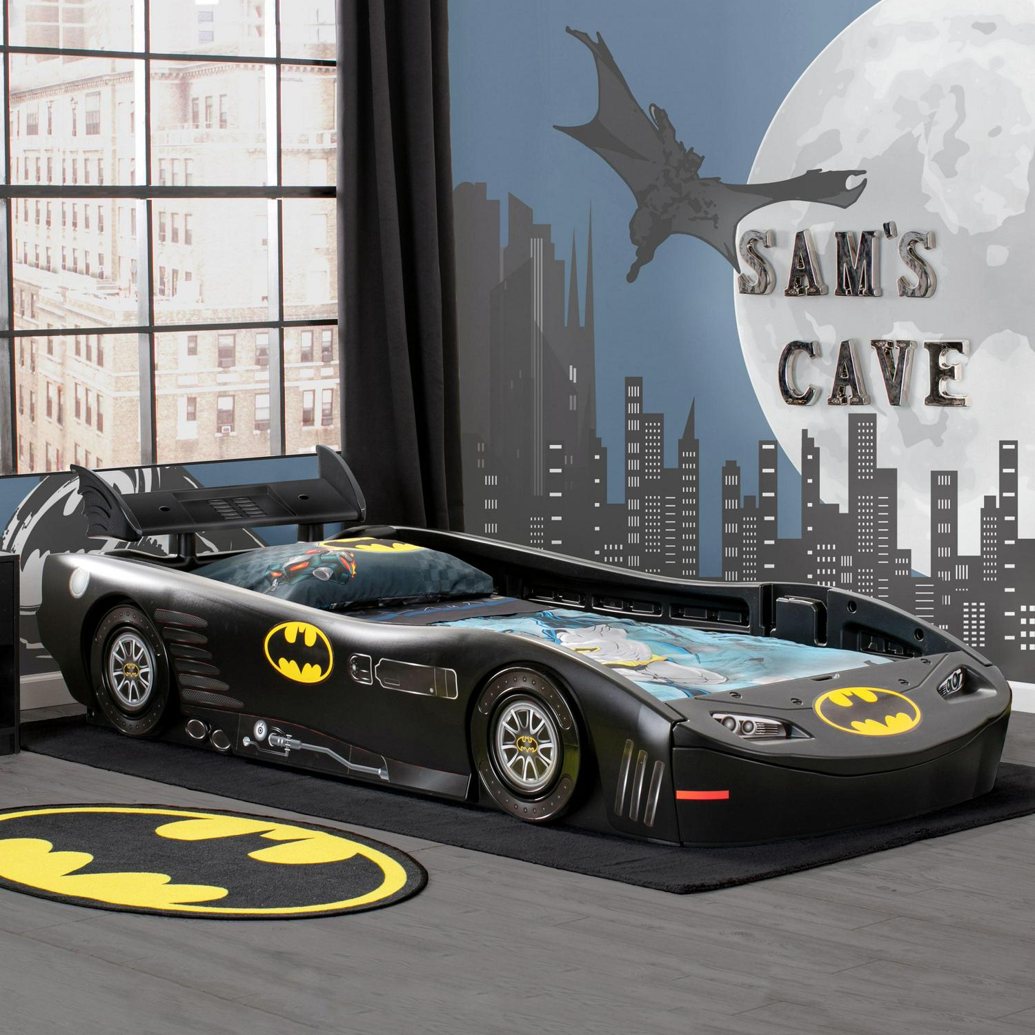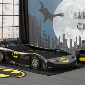 Instantly transform your child s bedroom into a Batcave with the Batmobile Twin Bed from Delta Children. Designed to resemble Batman s primary mode of transportation, this fun twin bed features a winged spoiler, racing wheels and colorful decals of the Bat logo. What makes this twin bed for kids even more super It is constructed from durable molded plastic to ensure years of safe use. The high sides of the bed act as secure guardrails, and allow kids of all ages to easily enter and exit the bed. Packed with enough POW to excite any Batman fan, the Batmobile Twin Bed from Delta Children will have any hero-in-training looking forward to bedtime each and every night. About Batman: Dark Knight. Caped Crusader. Sworn protector of Gotham City. Batman goes by many names, but he has only one mission become the world s greatest weapon against crime. His powers Super-sophisticated gear and intelligence. Batman s utility belt and Batmoblie help him morph into the ultimate vigilante. Made to KA-POW, Batman furniture from Delta Children adds cool style to your child s space while creating a fun crime-fighting ambiance that’s perfect for pretend play.
