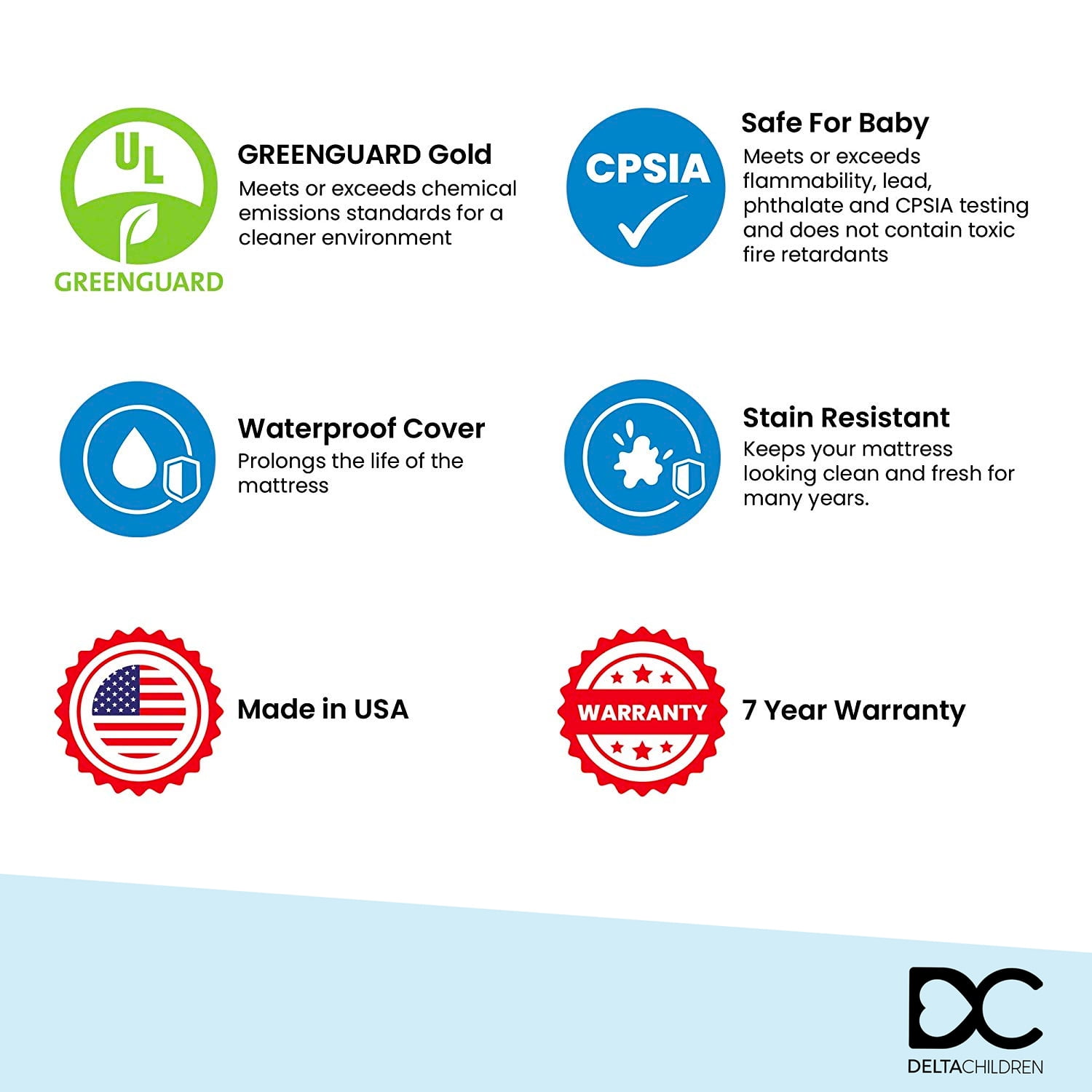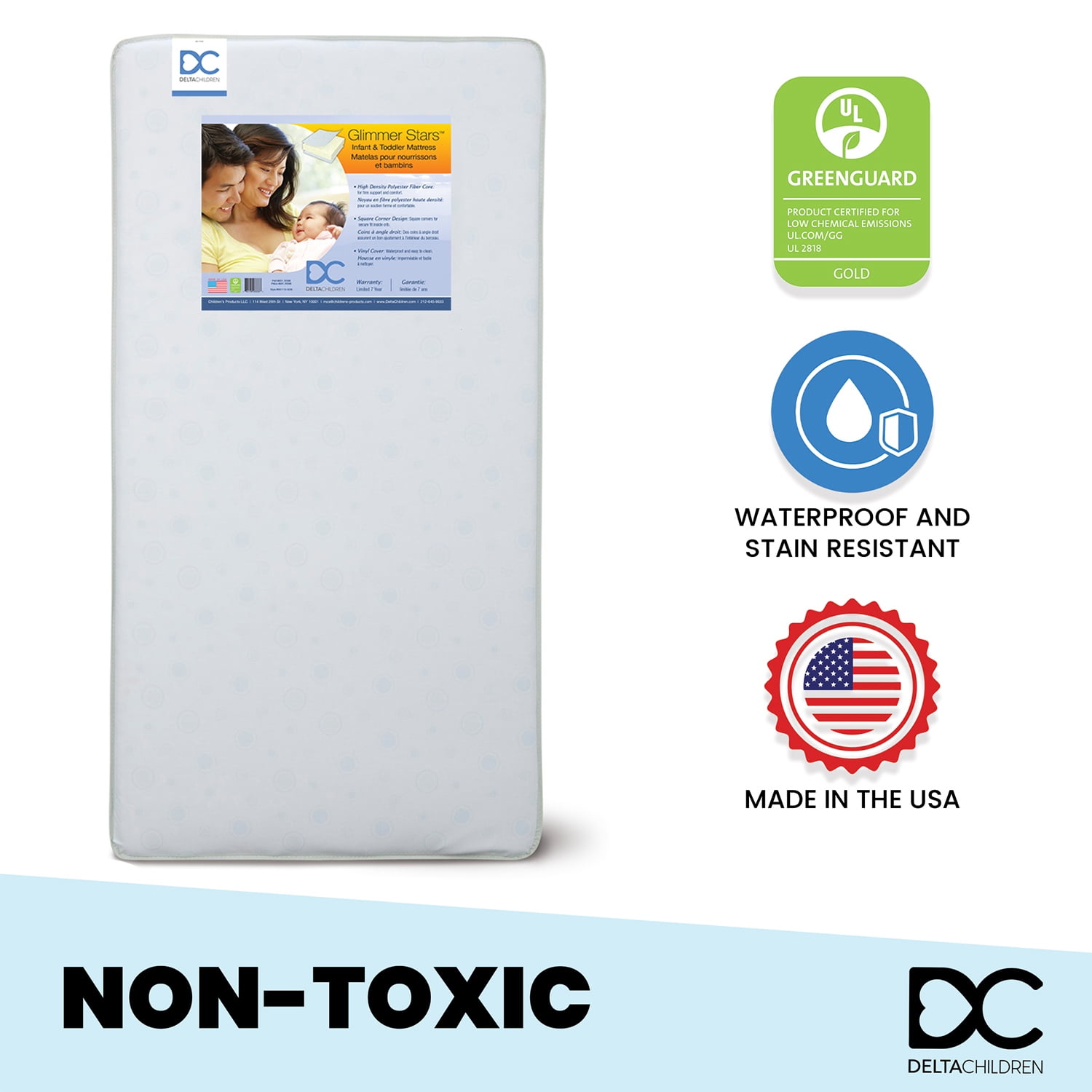 Delta Children’s Glimmer Stars Crib and Toddler Mattress offers your baby or toddler support and comfort at a great price. Built with a firm polyester fiber core, this sturdy mattress is has a durable waterproof cover for easy cleanup. Finished with square corners to help create a secure fit inside a crib or toddler bed, the Glimmer Stars Crib and Toddler Mattress is the ideal choice for your growing child.All Delta Children crib mattresses are GREENGUARD Gold Certified and meet the strictest standards offered by the GREENGUARD Environmental Institute, which recognizes products with low chemical emissions, contributing to improved indoor air quality.