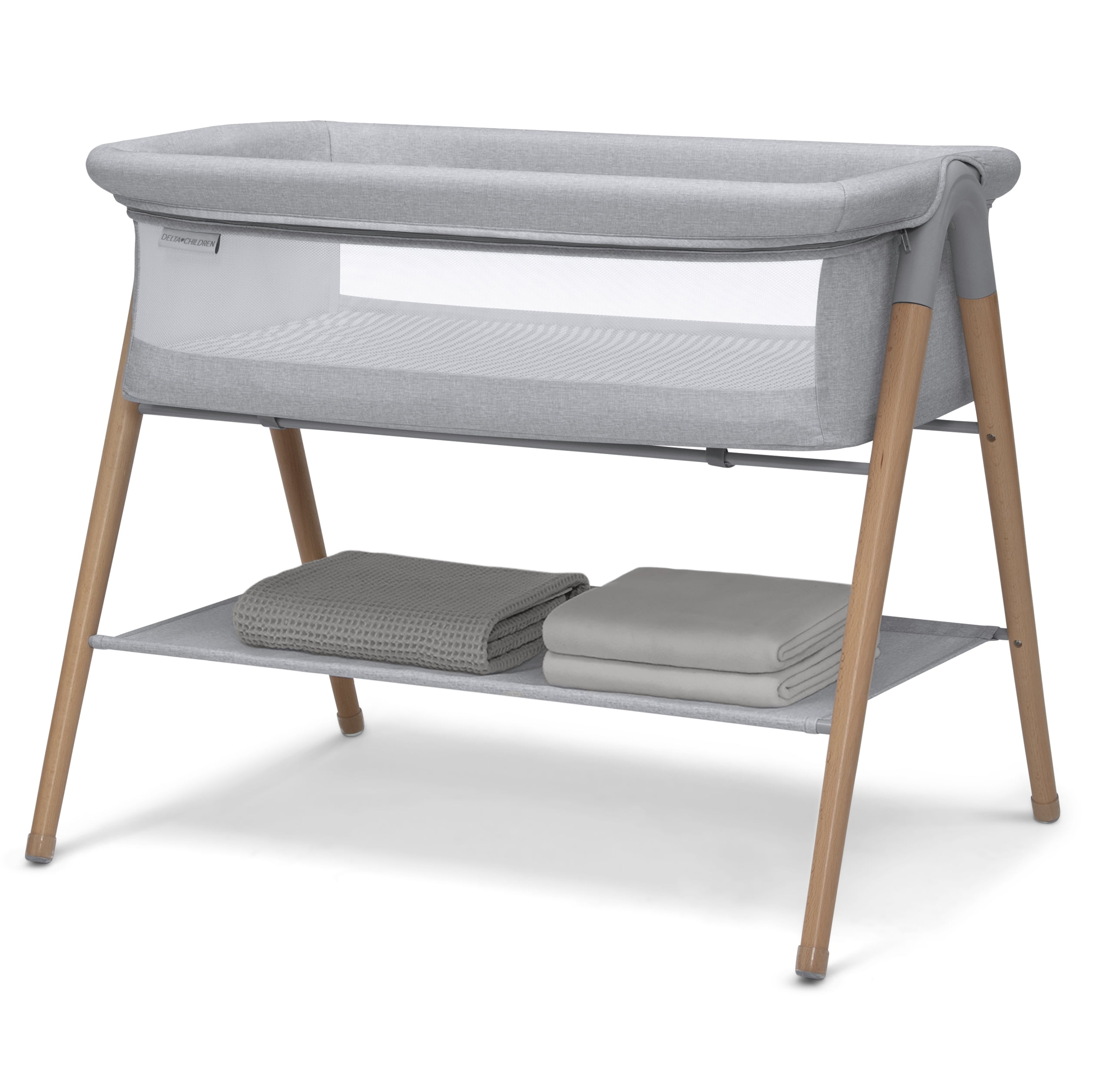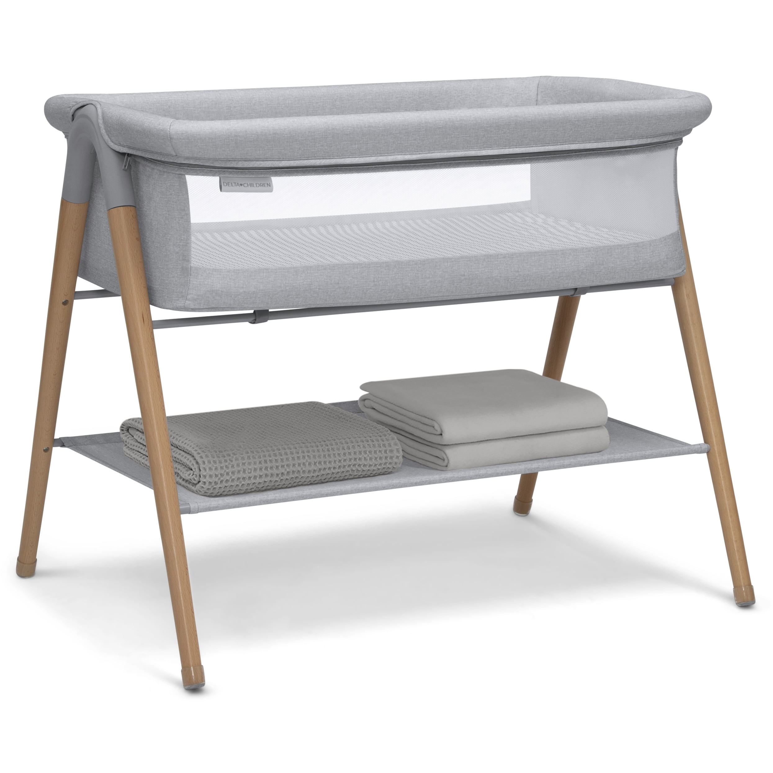 Keep baby safely by your side with the Delta Children Haven Beechwood by the Bed Bassinet. The Haven keeps baby within arm’s reach and provides a clear view with its breathable mesh sides for easy viewing. A spacious shelf underneath the bassinet provides plenty of storage space for all of baby’s essentials. The easy-care, water-resistant mattress pad with included fitted sheet offers a firm, flat surface that’s best for baby. A stylish option with natural beechwood legs made of FSC-certified wood, this sleek and streamlined bassinet helps support healthy forests and ecosystems worldwide for generations to come. This bassinet is recommended for babies 0-5 months. Max weight 30 lbs. Stop use at 5 months or once your infant begins to push up on their hands and knees, whichever comes first.